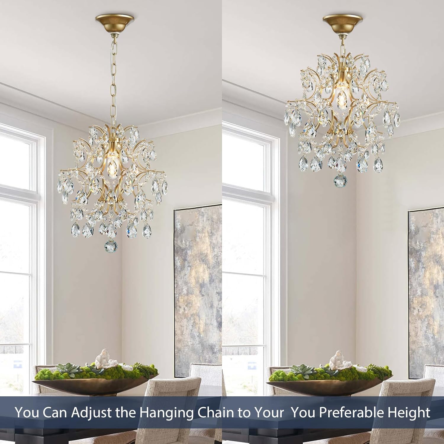 Dangle this crystal mini pendant anywhere for an instant shot of glitter and glamour. Hung from a gold finished canopy and chain is a gathering of faceted clear crystal balls and diamond-shaped accents. Four light within illuminate and bring this look to life. Perfect for seating and eating areas.
