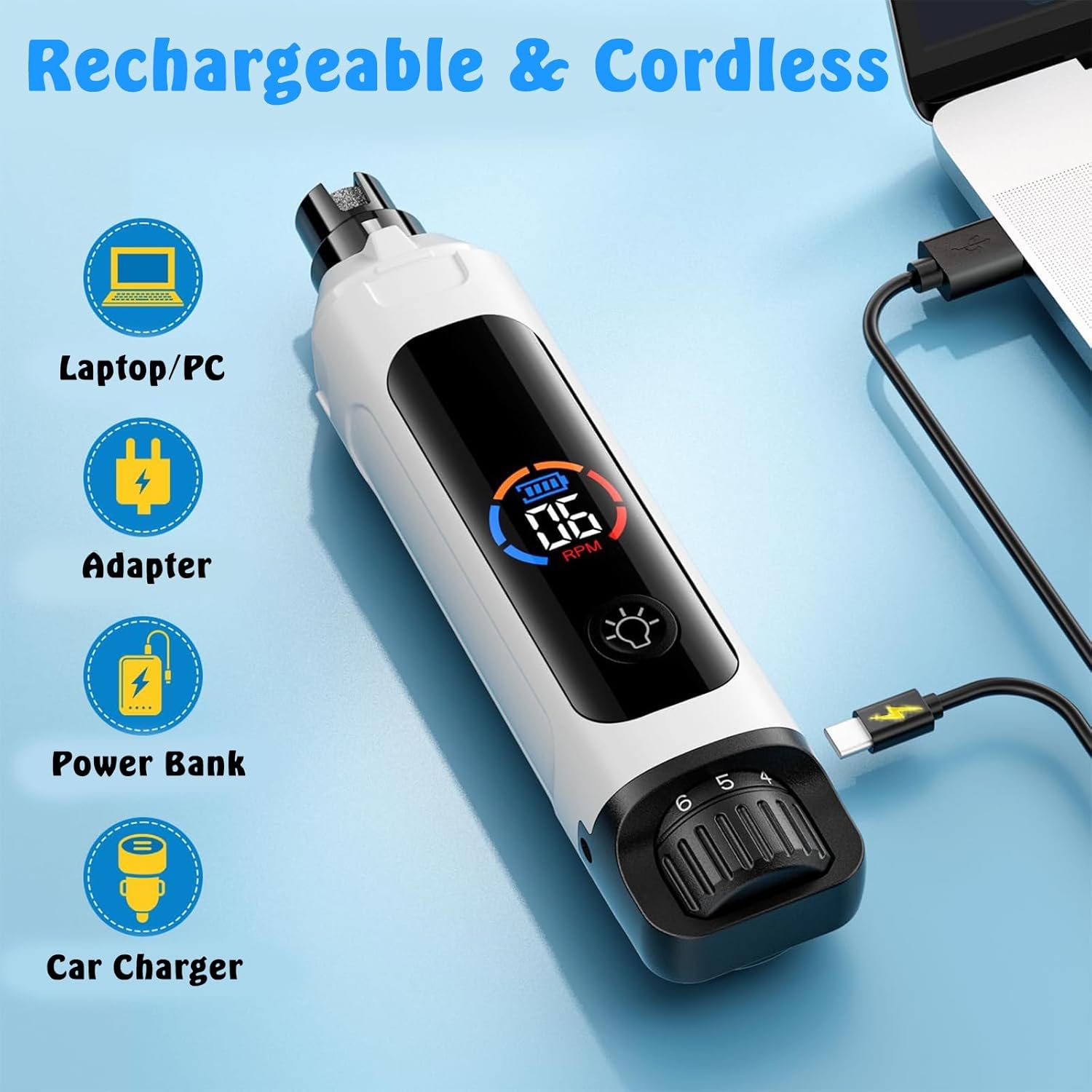 【LED Display & Dual Lights】Different from traditional nail grinders, ours has a digital screen—so you can easily check speed level and battery life. Plus, dual LED lights help you spot your pet’s blood vessels quickly, preventing over-grinding.