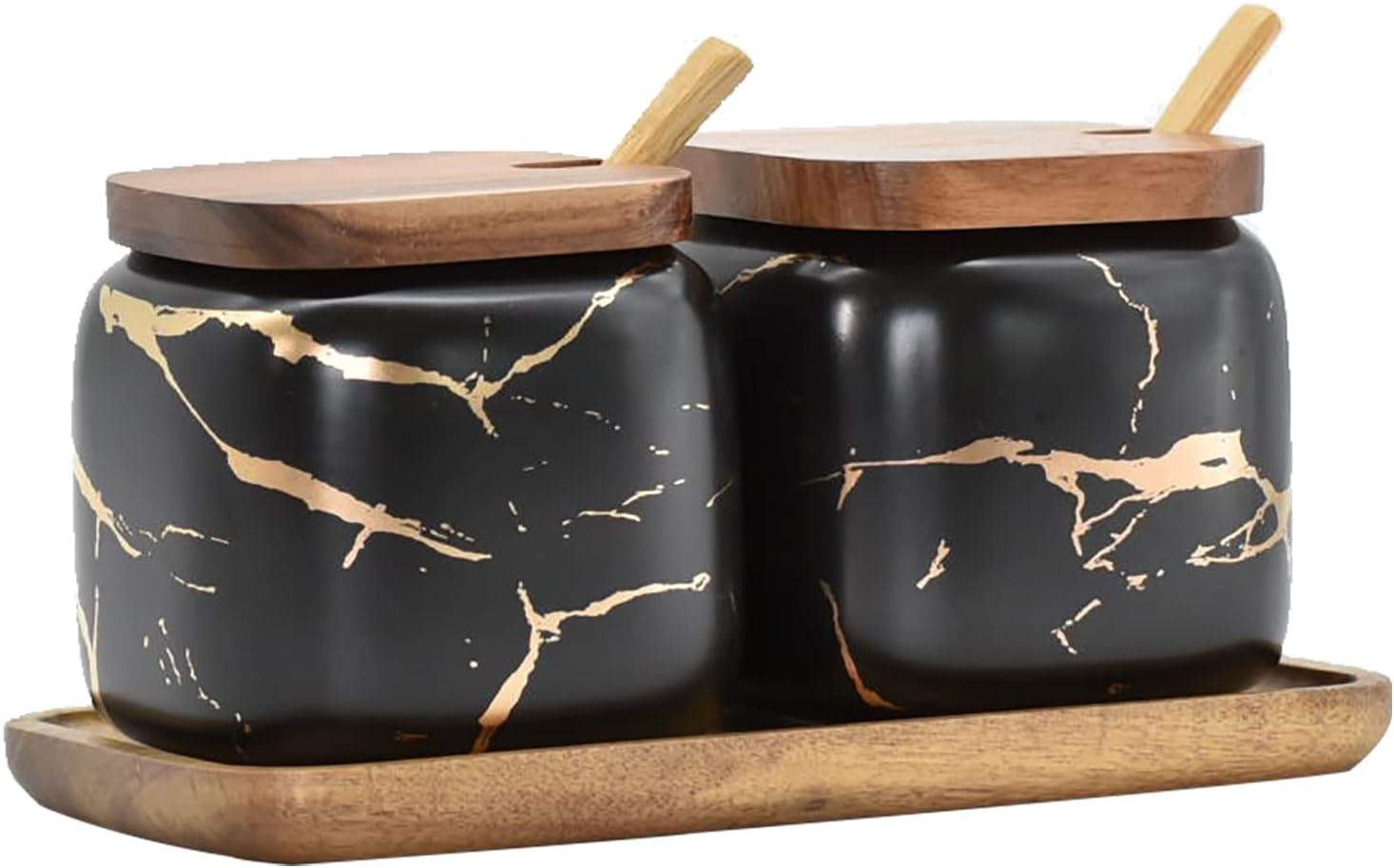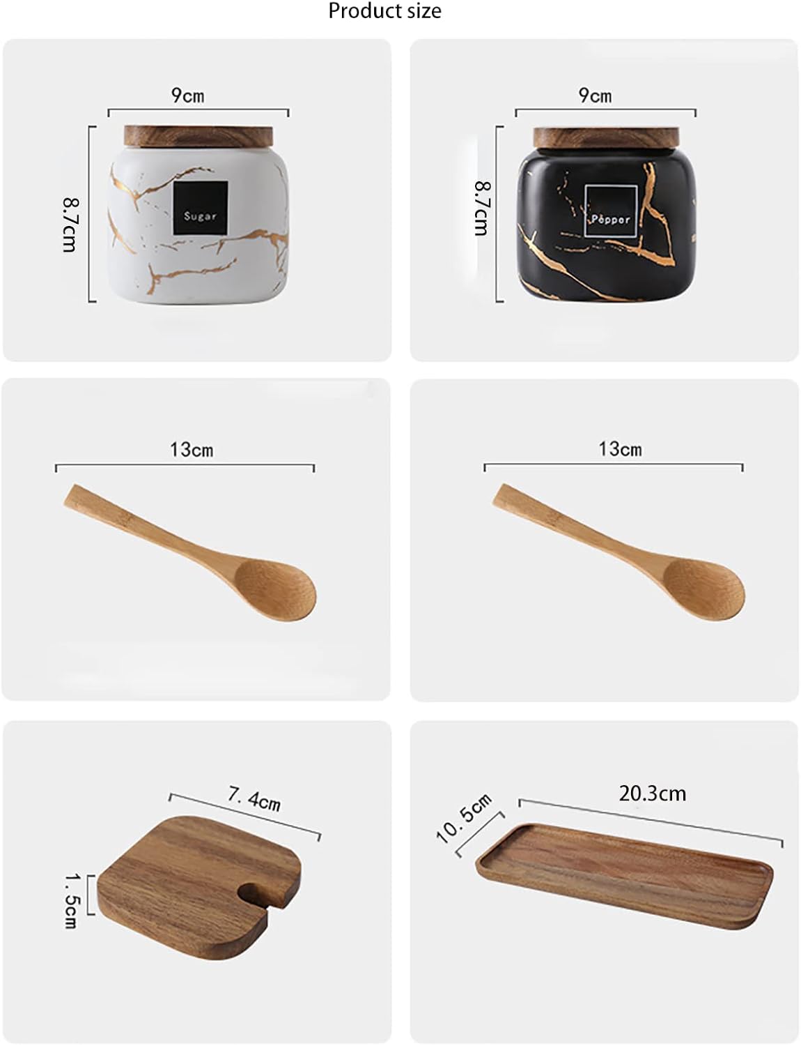 EIMQUVW Sets of 2 Marble Ceramic Seasoning Jars Ceramic Sugar Salt bowl Condiment Pots with Wooden Lids,Wooden Spoon and Woodens Tray(White)