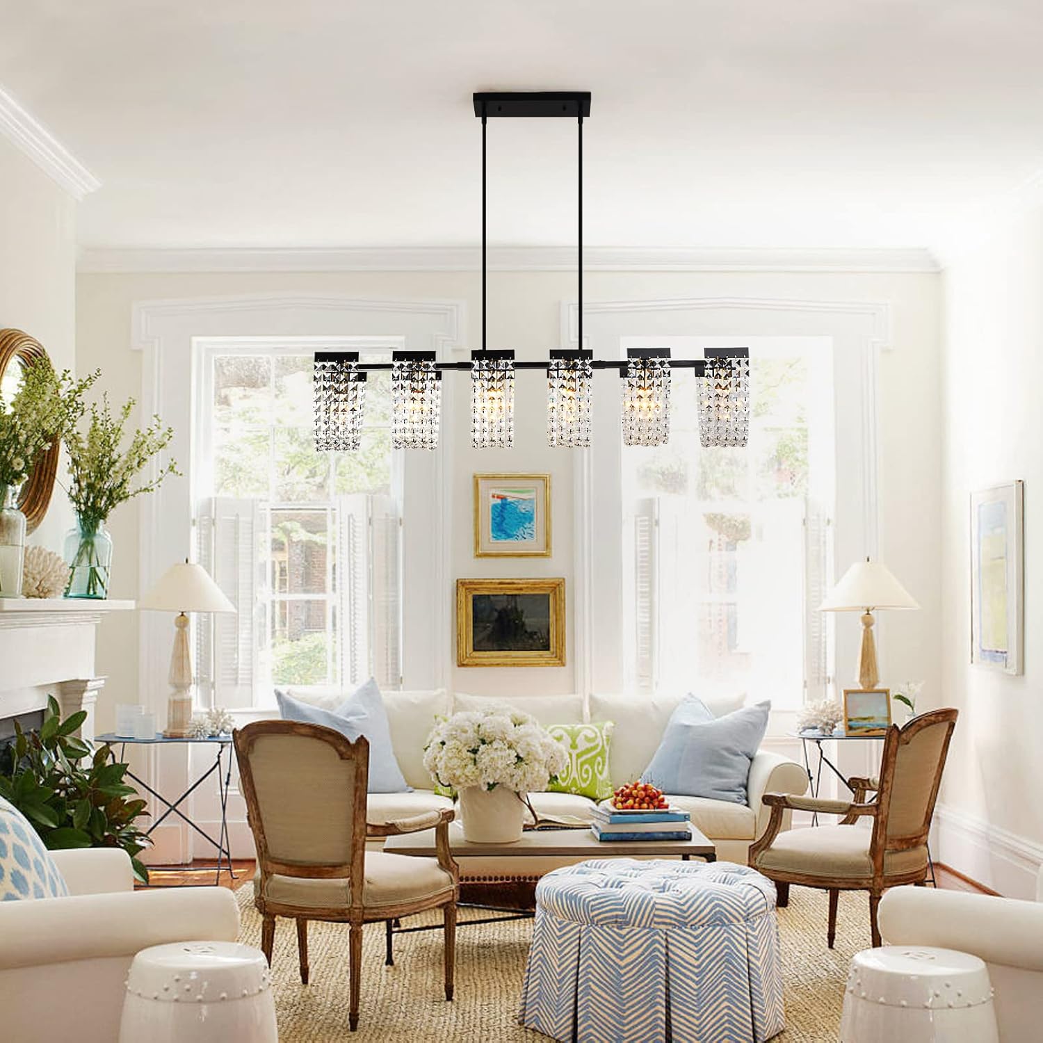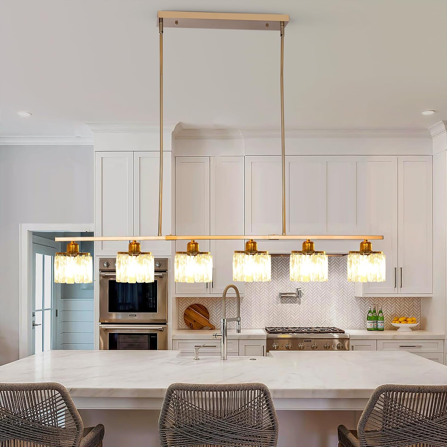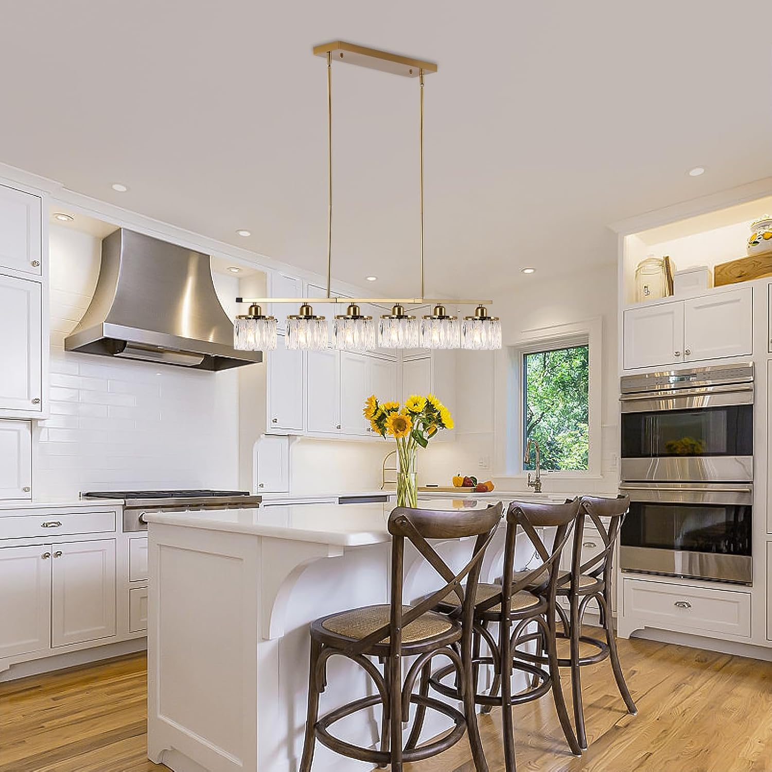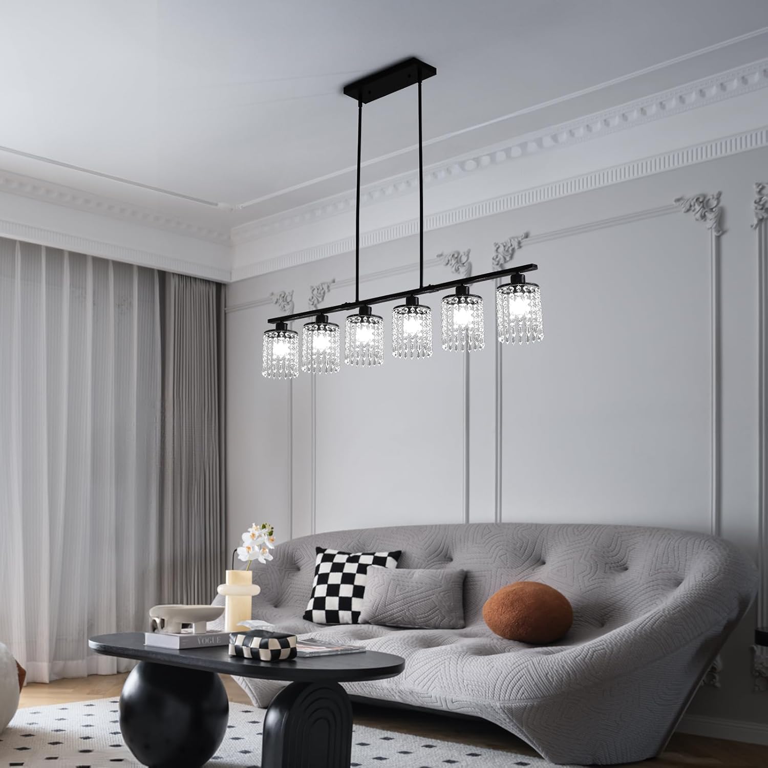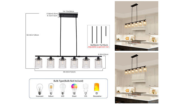 Ganeed 6-Light Crystal Chandelier Lighting Farmhouse Pendant Light Fixture, 48in Kitchen Island Lighting, Linear Chandelier for Dining Room Living Room (E27 Bulbs, Not Included)