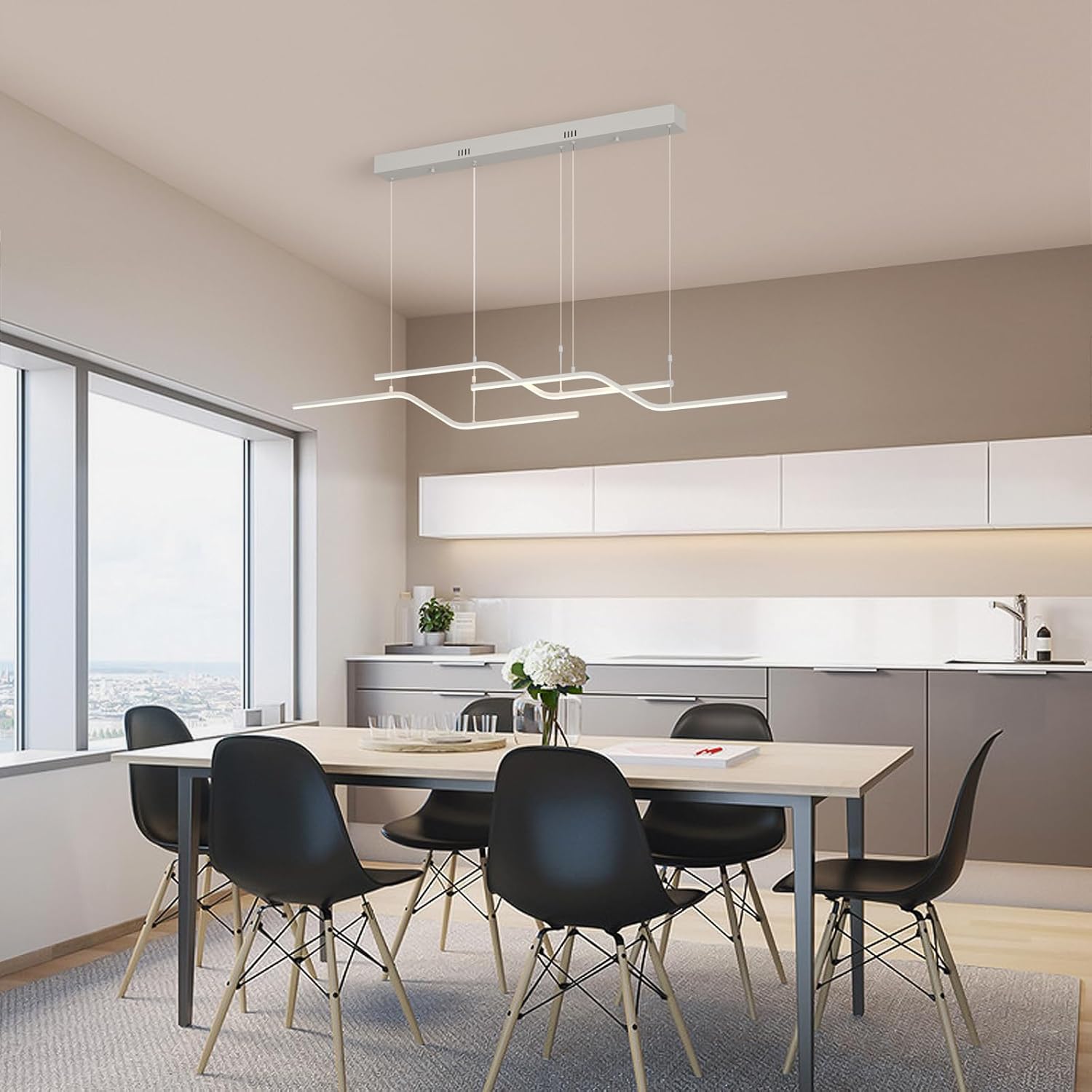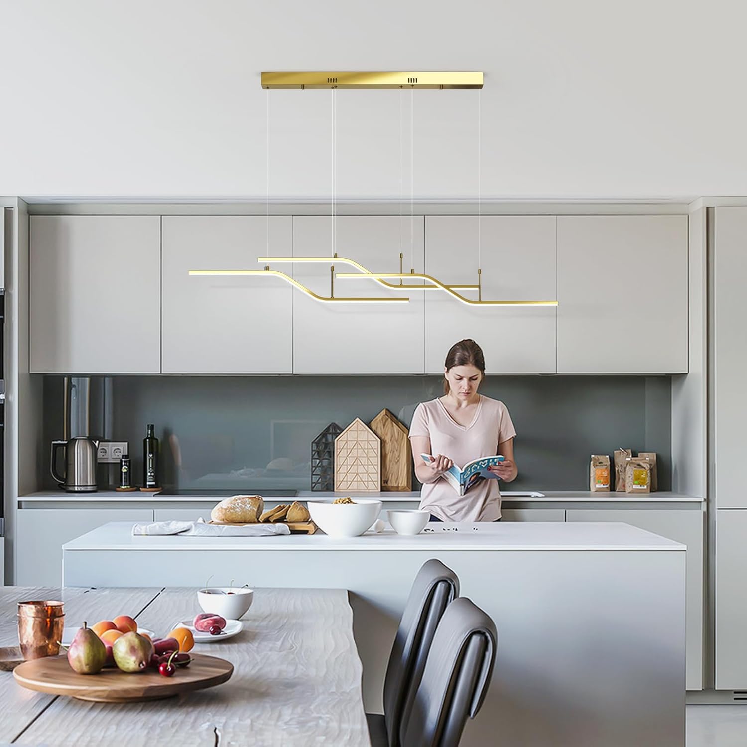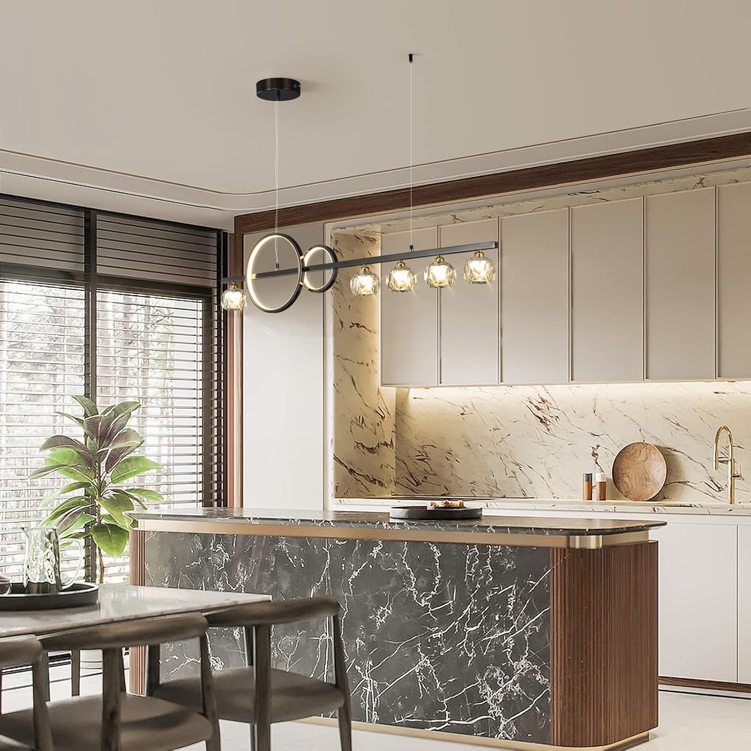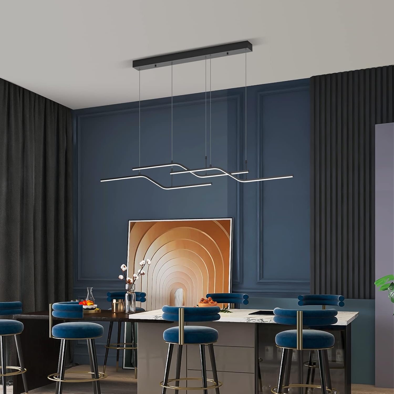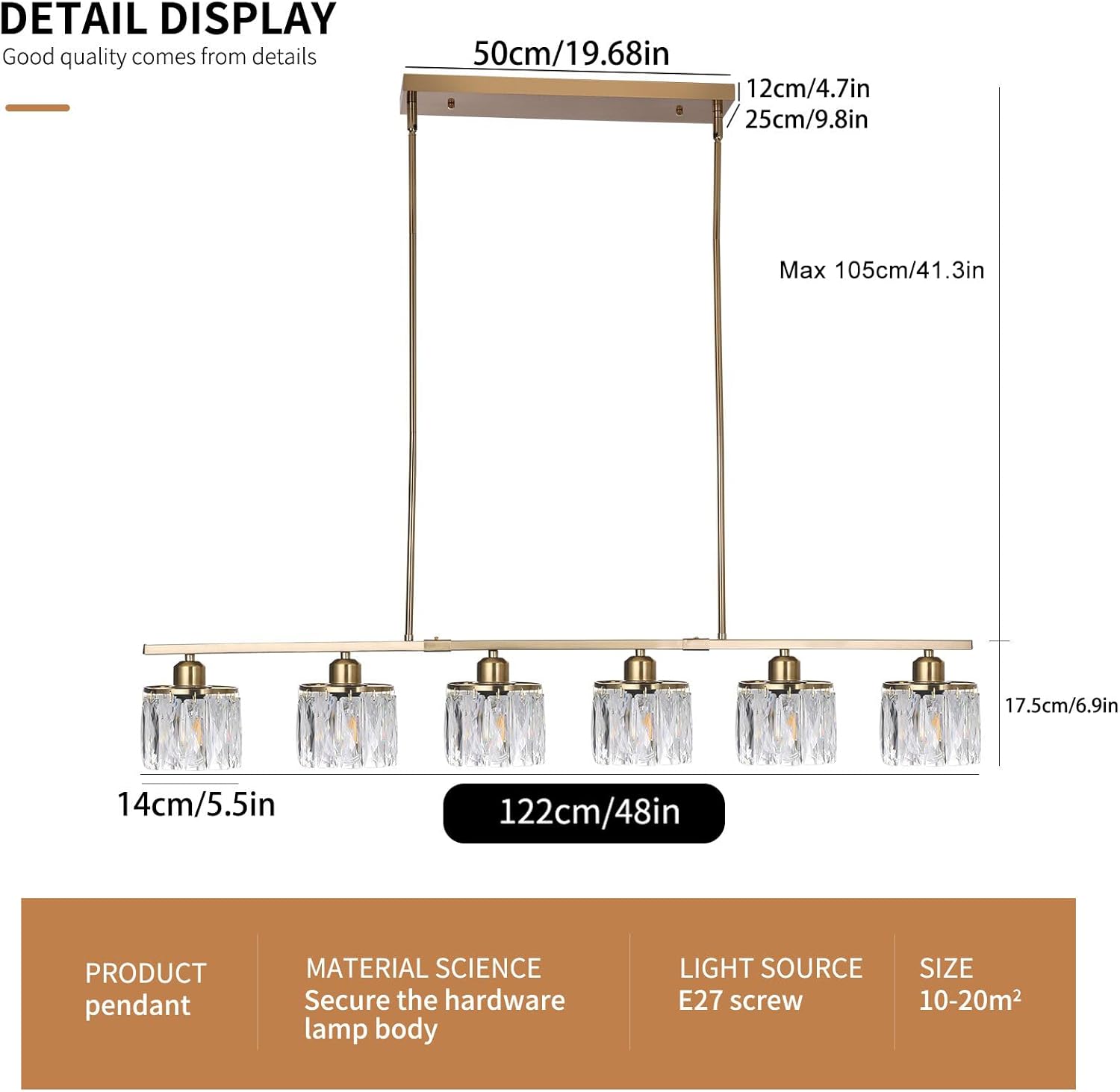The 122 cm (48") span with 6 bulbs provides strong, even coverage for medium-to-large islands and tables. Tailor output via bulb choice.