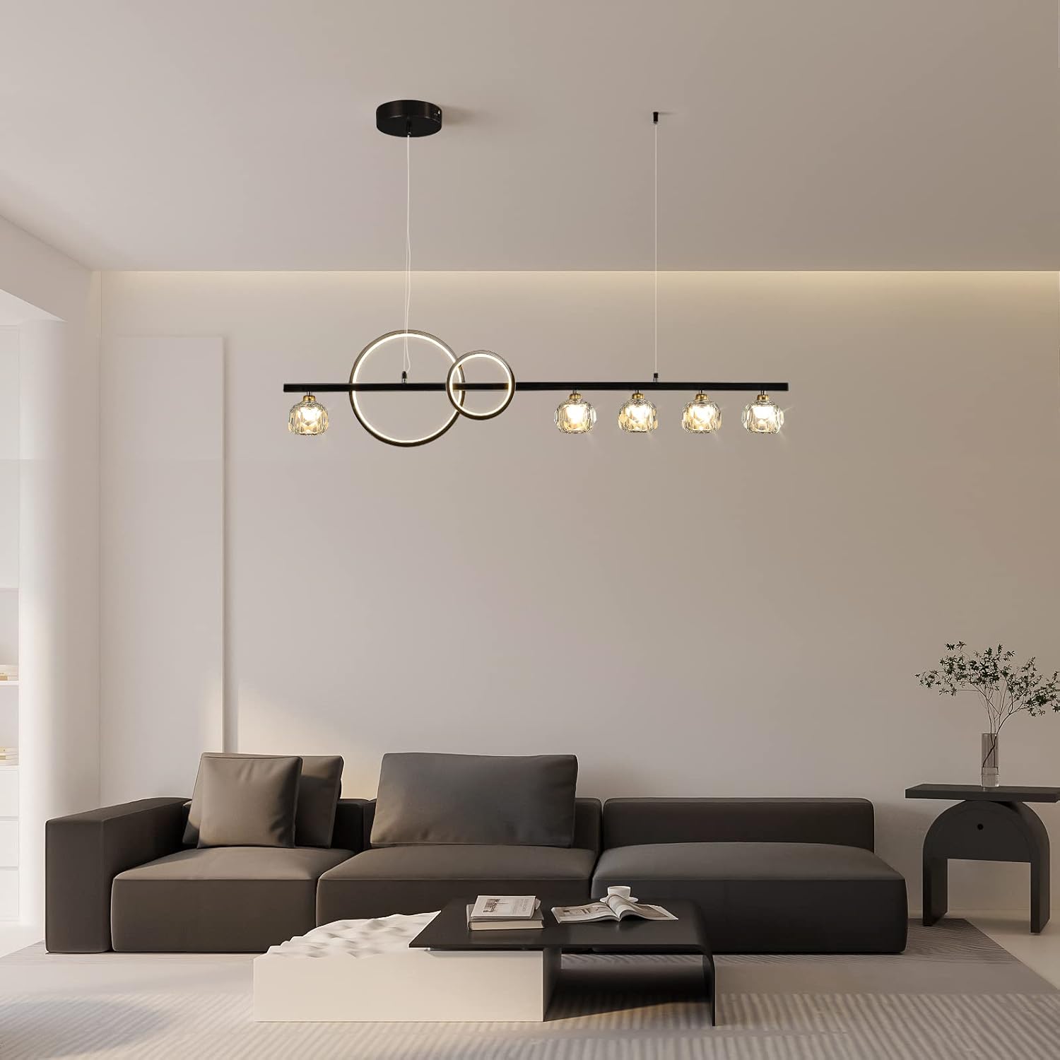 Modern black metal meets K9 crystal cylinders β a statement bar light for islands, dining tables, and entertaining spaces.