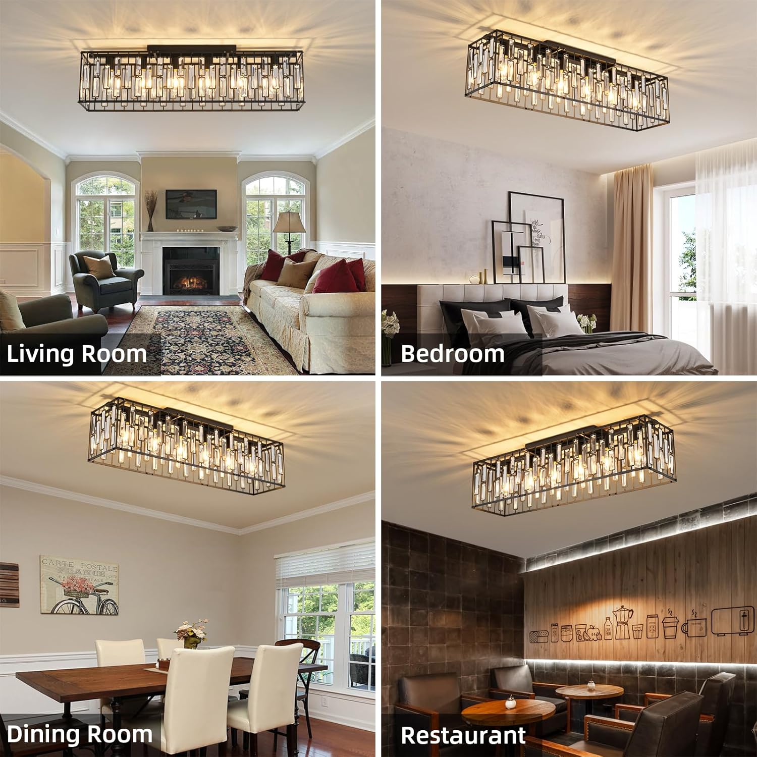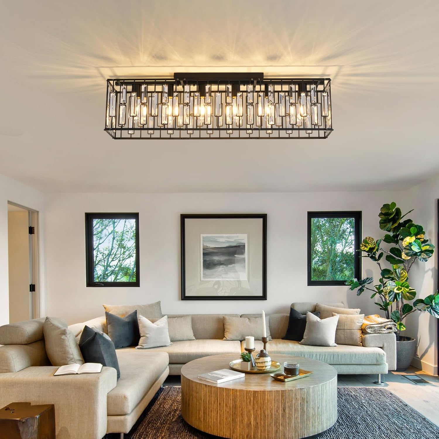 Modern + Timeless: Matte black linear frame with K9 crystal cylinders for crisp sparkle without glare.