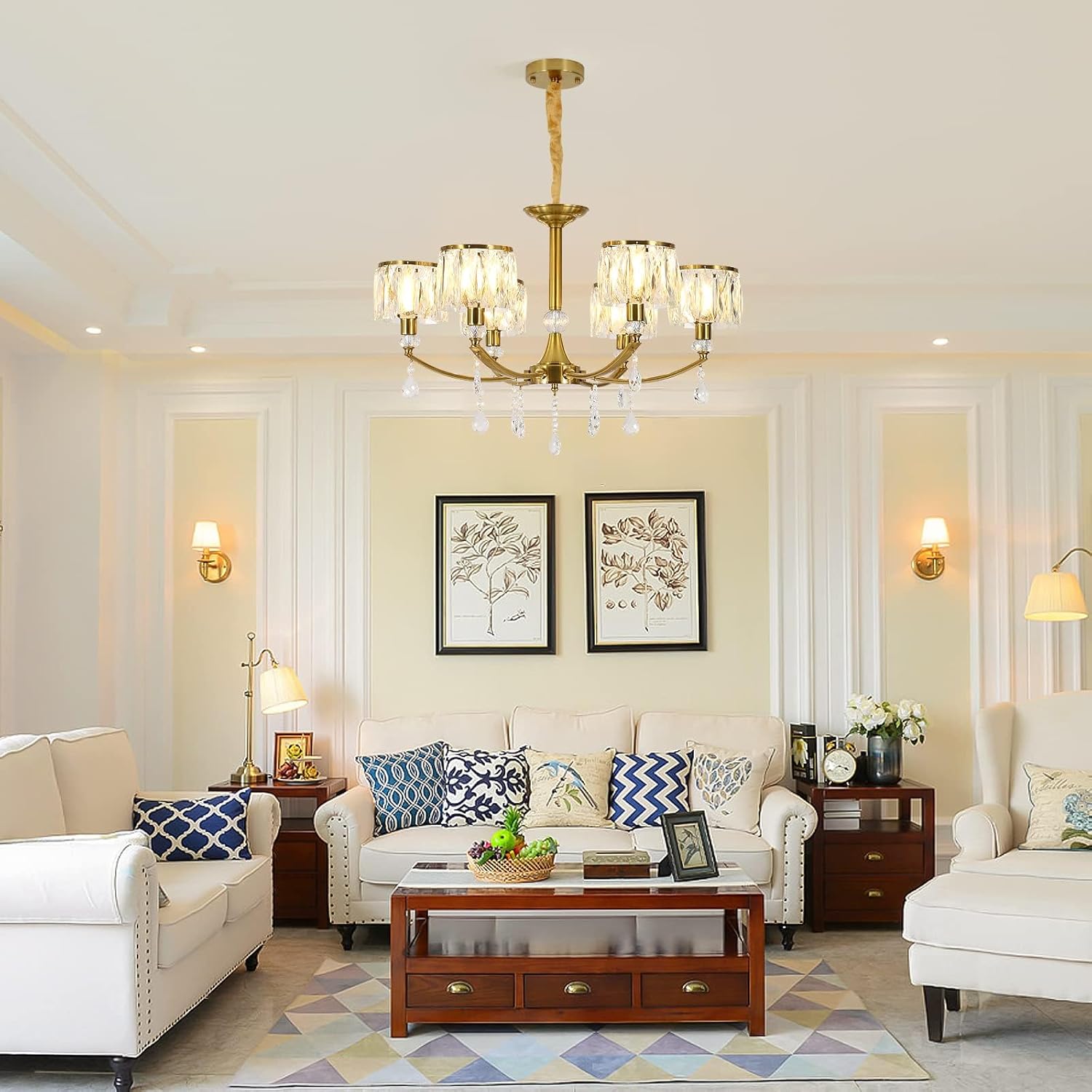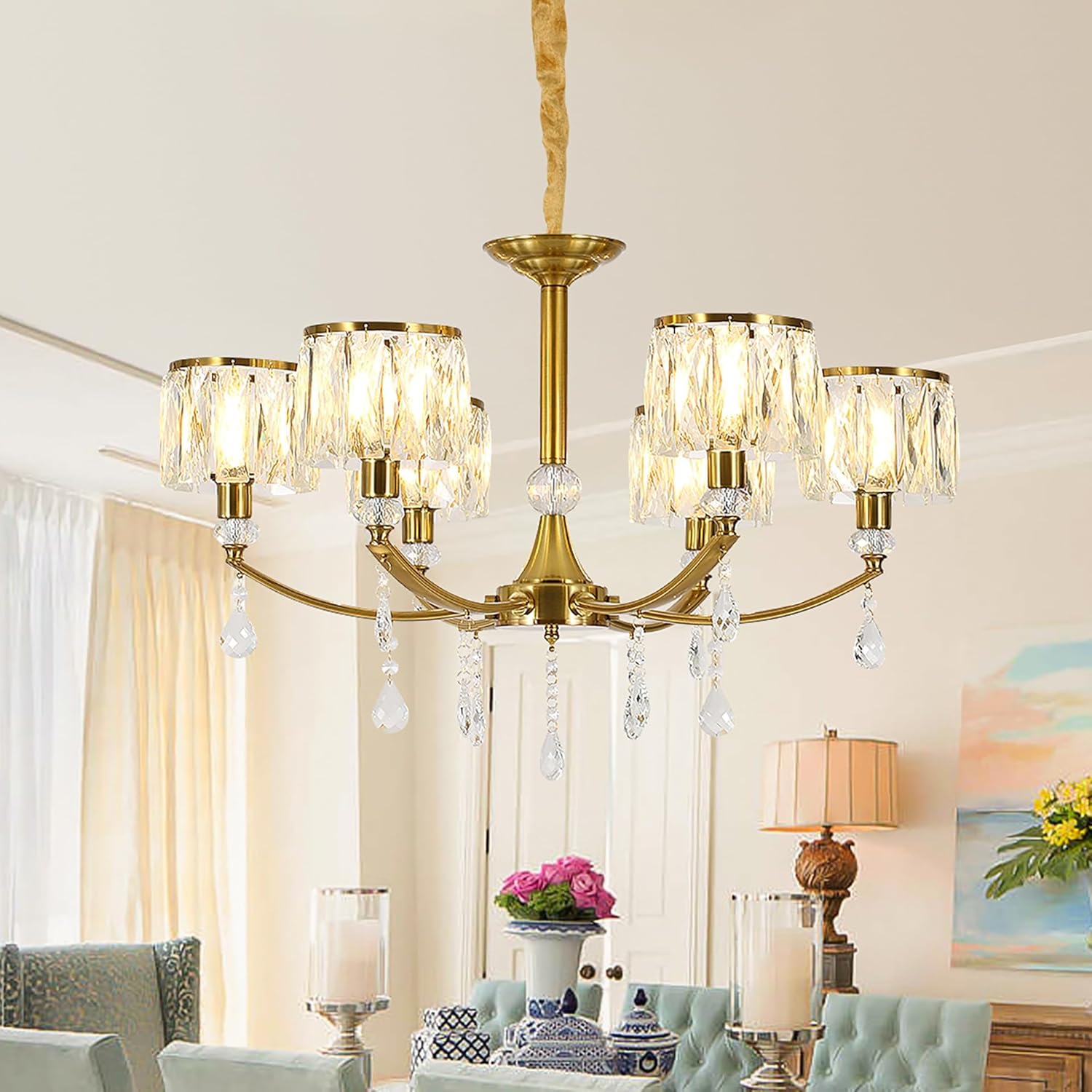 Easy upkeep: Open-top crystal shades make bulb changes simple.