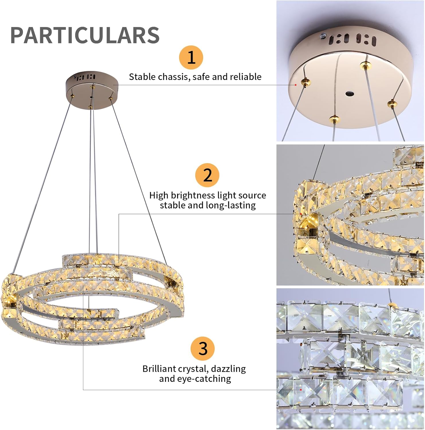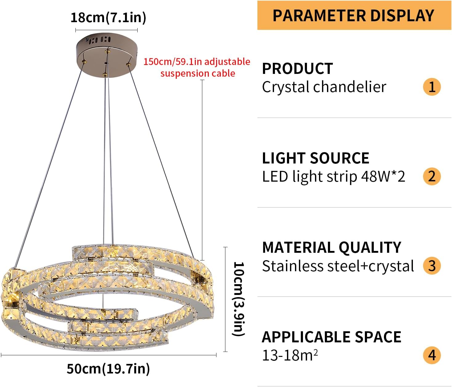 Luxurious Chandelier Dimensions - This opulent crystal chandelier boasts dimensions of 50cm(D) x 150cm(Max H), with a canopy diameter of 18cm. It is equipped with adjustable 150 hanging cords, allowing for effortless customization of the overall hanging length to suit your preference. Voltage: 220 volts, Power: 48 watts. Dimmable LED Ceiling Light - The LED chandelier features three adjustable color modes: warm light, white light, and natural light, with a color temperature range from 3000K to 6000K. Each light hue caters to distinct settings; white light for general illumination, natural light for reading or working, and warm light for creating a romantic ambiance. High Performance - Powered by advanced LED source, this chandelier offers up to an 80% energy saving compared to equivalent brightness halogen lamps. With a remarkable lifespan exceeding 50,000 hours and a CRI of up to 80, it ensures high color rendering. Crafted from premium PMMA material, the multifaceted diamond pattern enhances the luminosity, casting enchanting light and shadow play that perfectly complements living rooms, bedrooms, dining areas, kitchen islands, and offices. Sophisticated Design - Boasting a refined electroplated gold finish on its iron structure and crystal accents in its ring design, this dimmable chandelier lighting radiates sophistication and luxury. It serves as an exquisite addition to elevate the allure of your home's interior design. Hassle-Free Installation - This regal golden crystal pendant light arrives pre-wired, accompanied by comprehensive instructions and all necessary mounting hardware. The straightforward installation process involves merely attaching the fixture to the ceiling—a task easily accomplished. Should you require assistance or have questions, our dedicated support team is available to address any concerns promptly within 24 hours online.