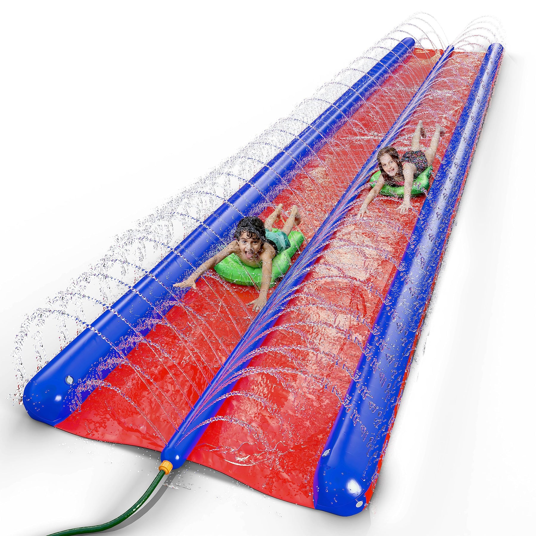 Stargo™ 2-Person Double Slide 25 ft × 6 ft red & blue waterslide with built-in sprinklers and inflatable body boards. Perfect for side-by-side races and high-energy backyard fun.