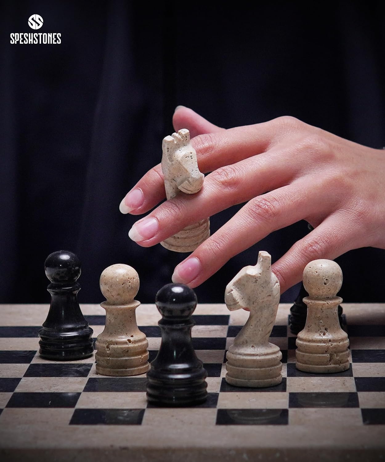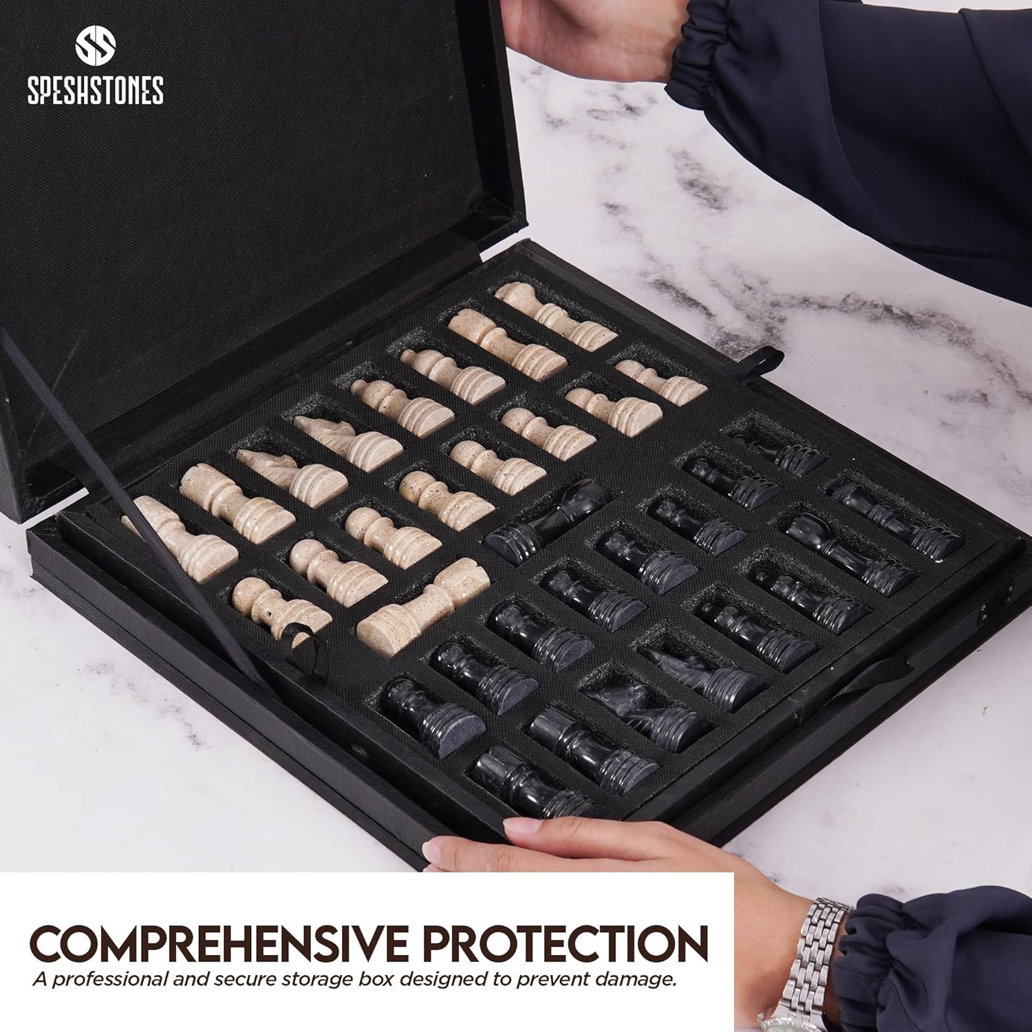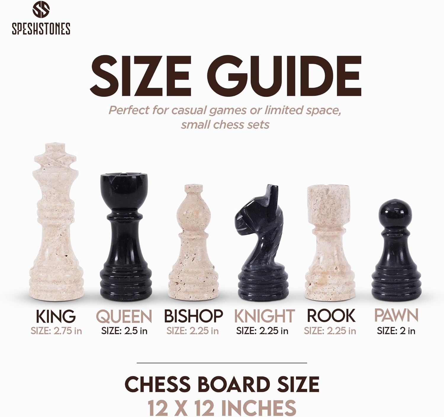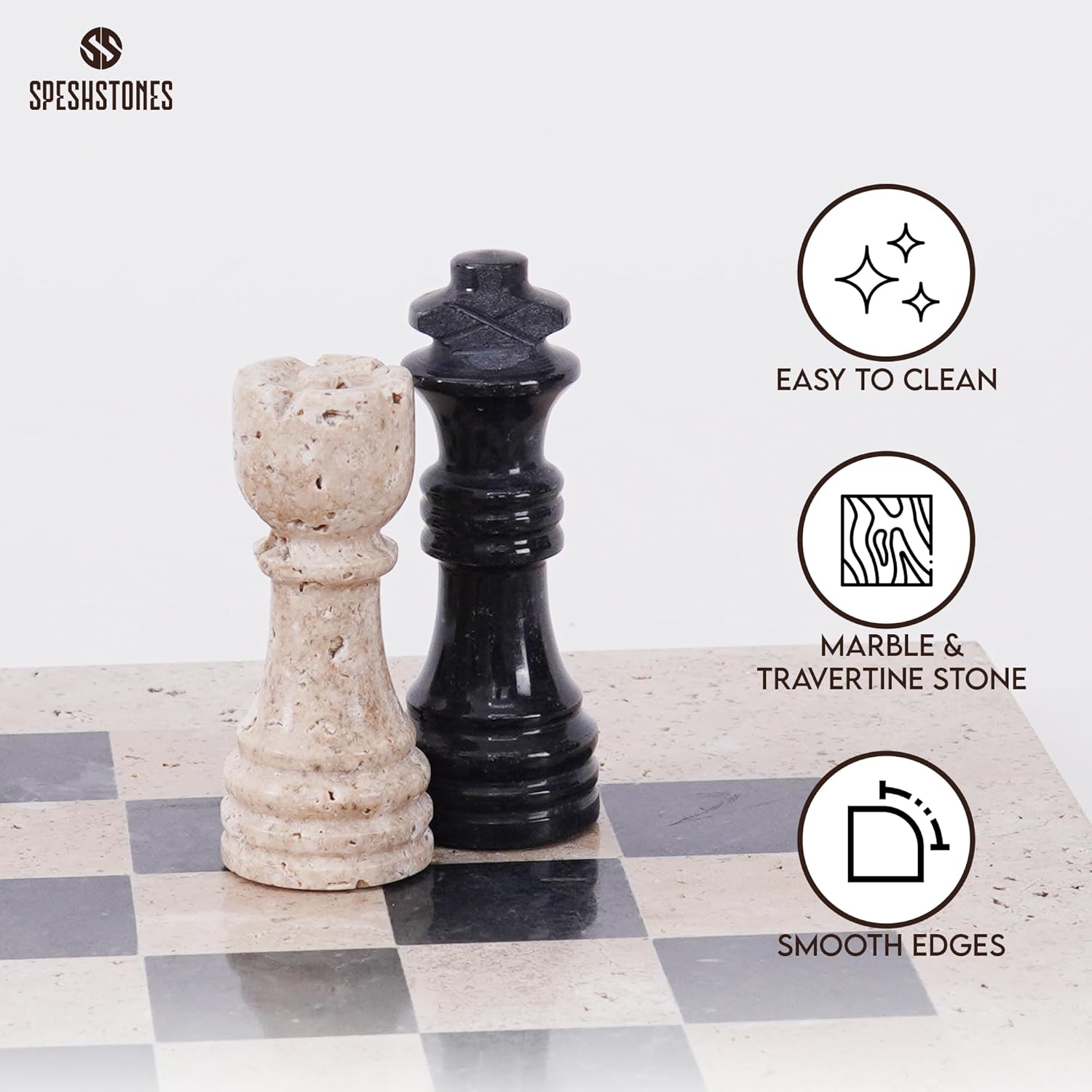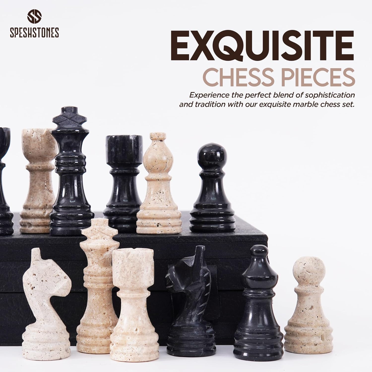 Handmade Marble Tournament Full Chess Game Set (Travertine & Black) 30cm / 12 inch