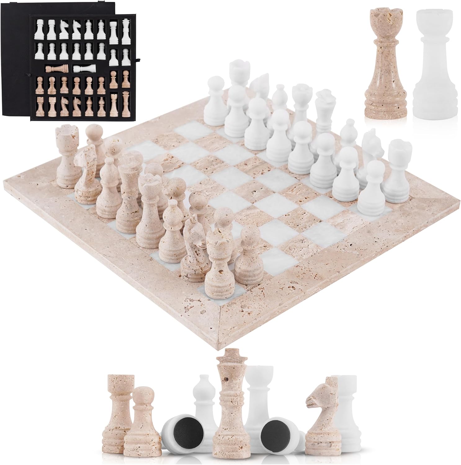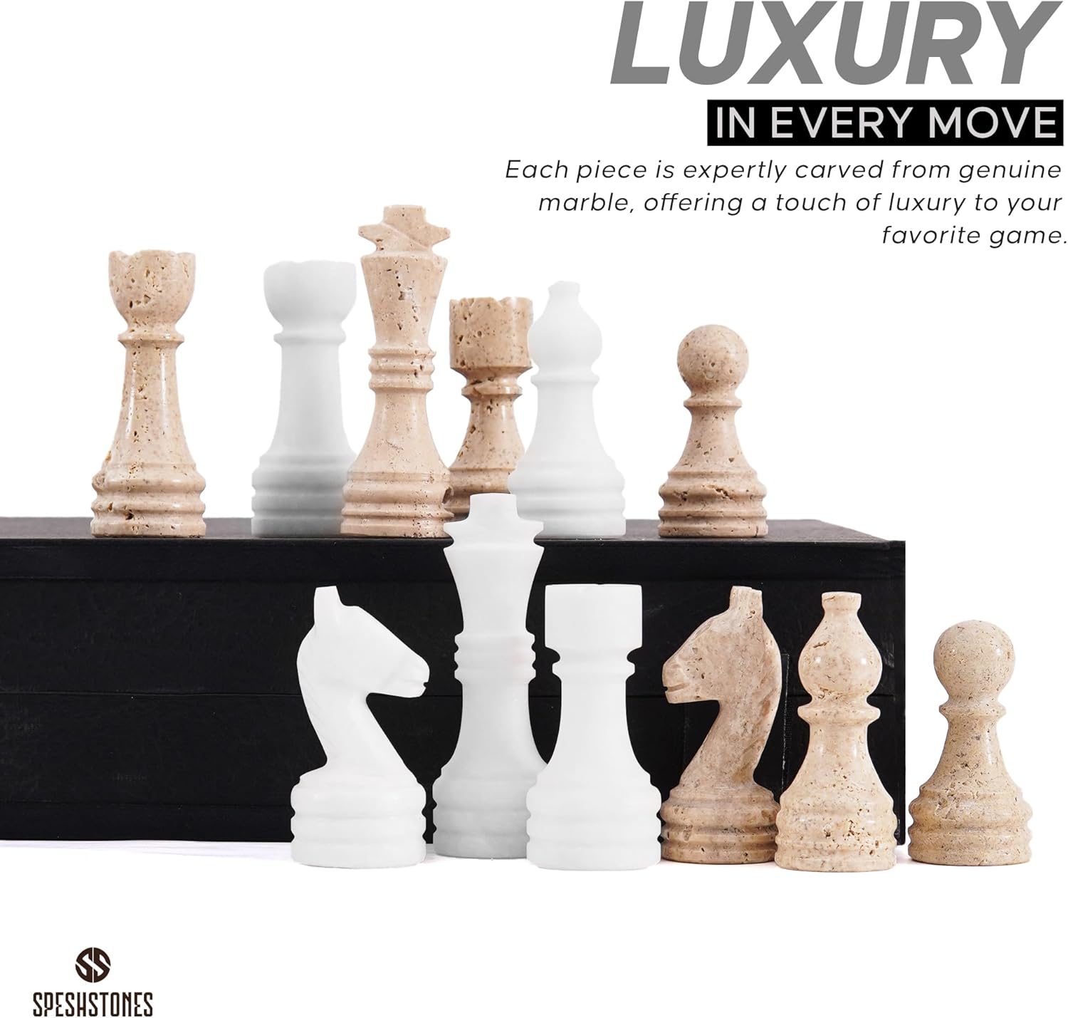 Handmade Marble Tournament Full Chess Game Set (Travertine & White) 38cm / 15 inch