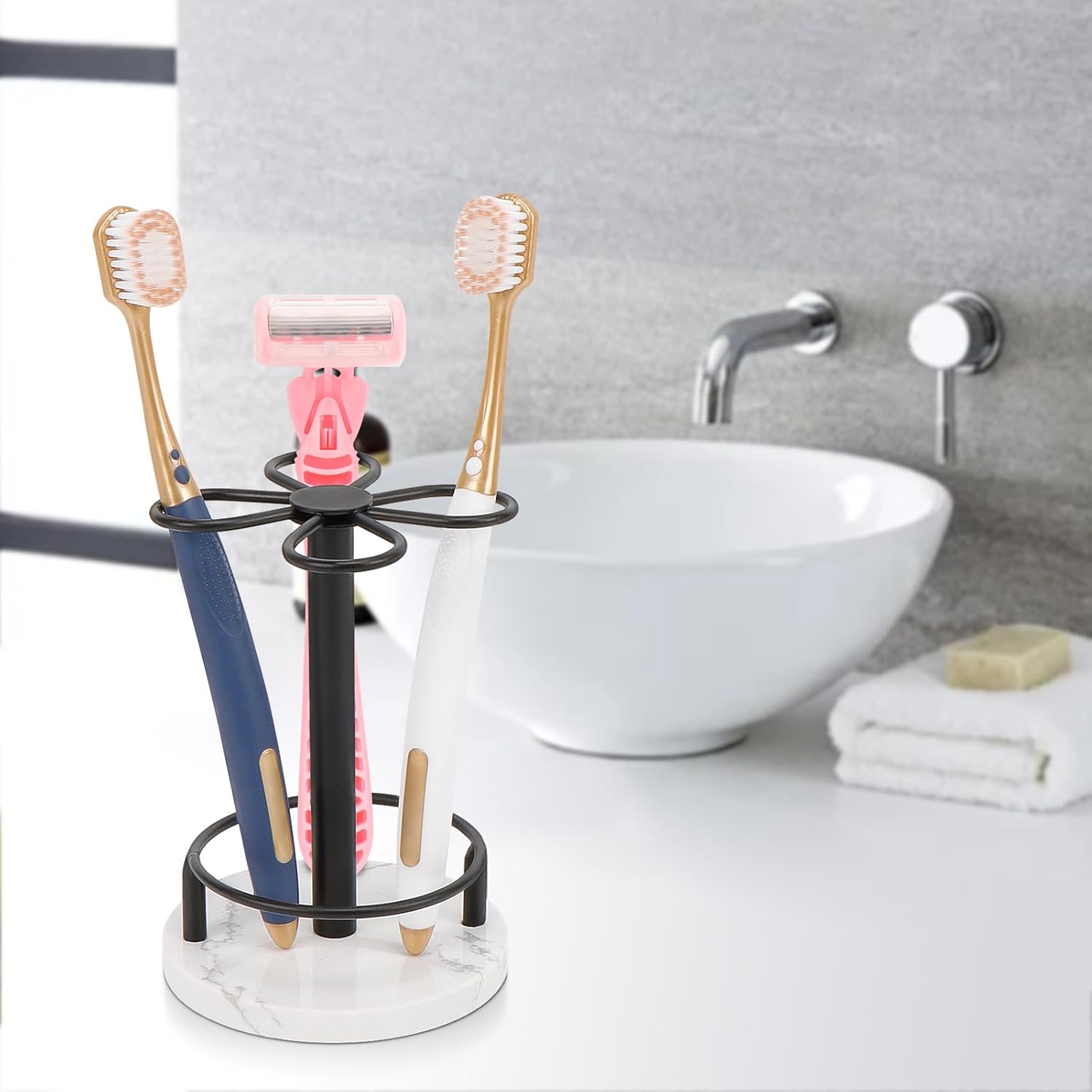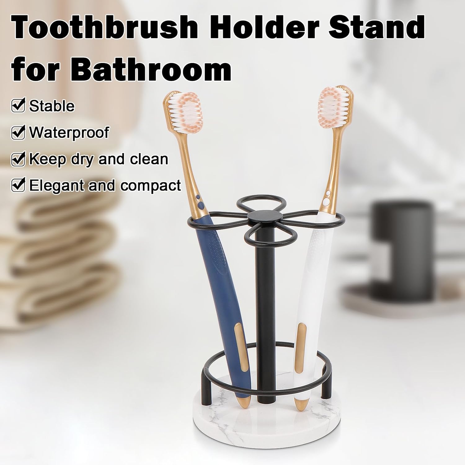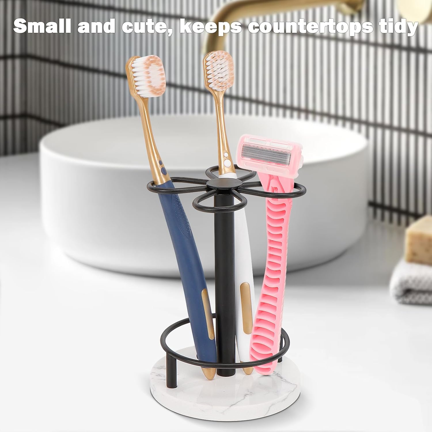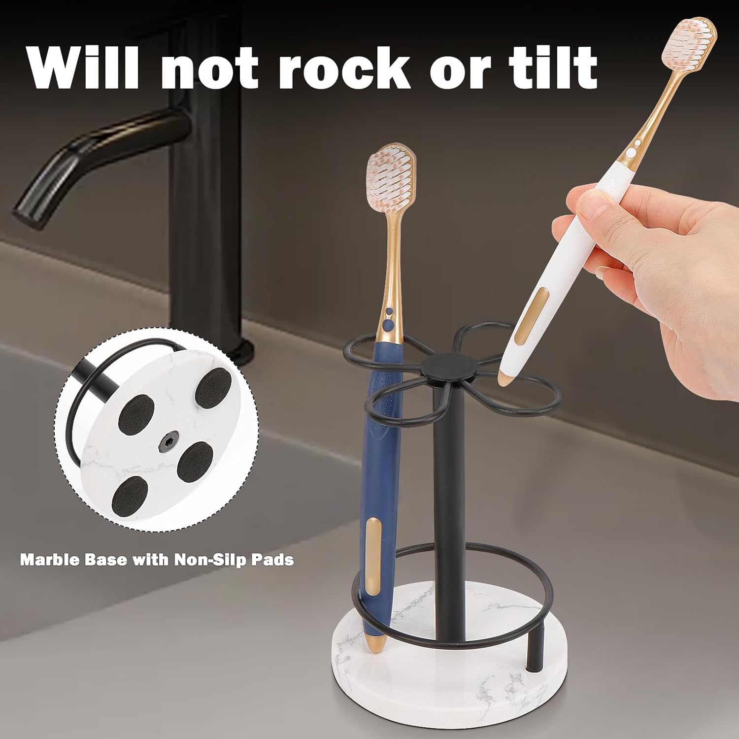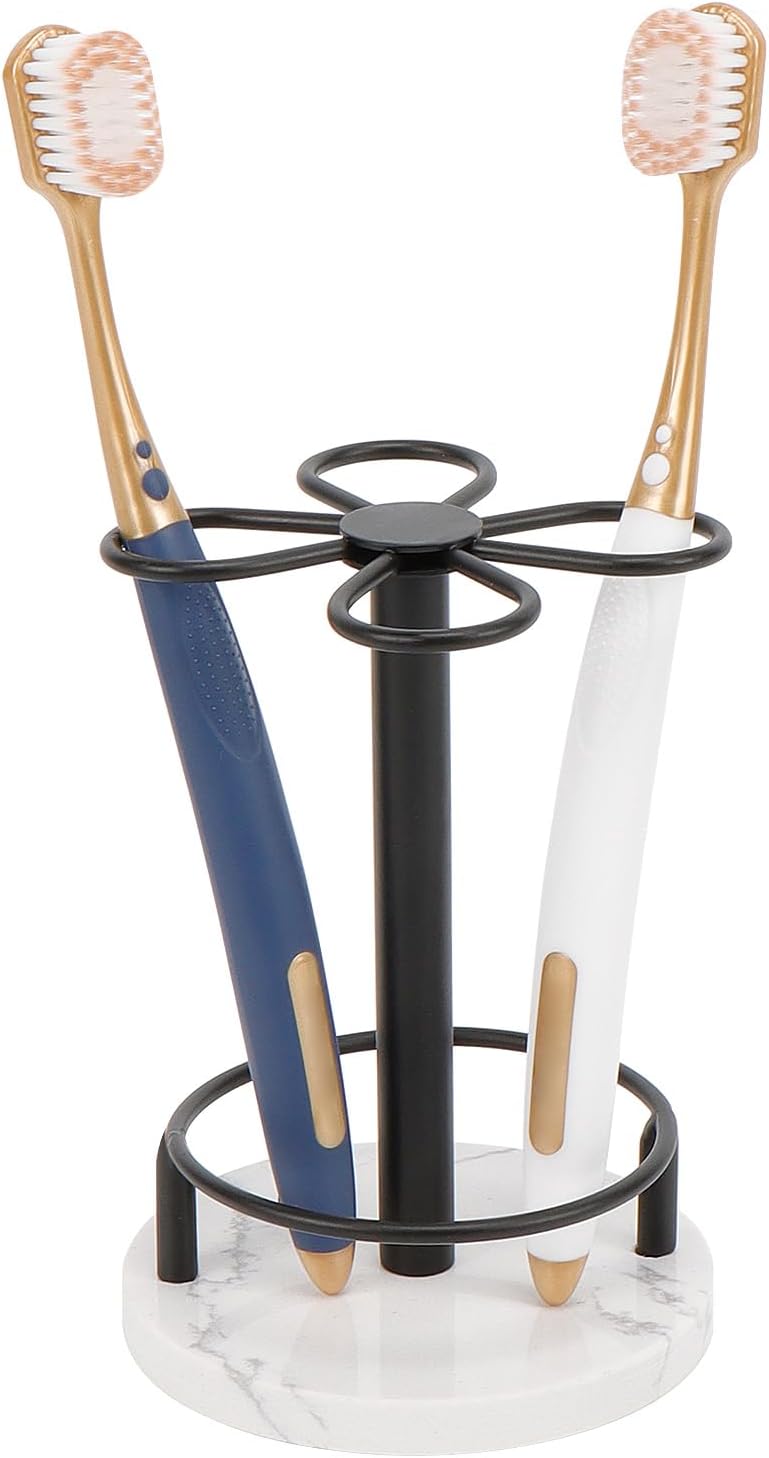HarJue Toothbrush Holder Stand for Bathroom, Metal Toothbrush Organizer with Marble Base, Toothbrush Storage Collection for Family, Suitable for Home Hotel Countertop Vanity (Small, Matte Black)