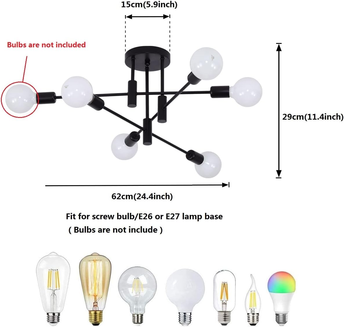 Modern Sputnik Chandelier SIZE: 24.4in/62cm(L) * 11.4in/29cm(W) * 5.9in/15cm(Ceiling Canopy Diameter). Sputnik chandelier adopts a modern design with 6 multi-directional lamp bases, 3 different length rods and 3 black adjustable arms. The connecting metal arms for installing bulbs can be rotatable.