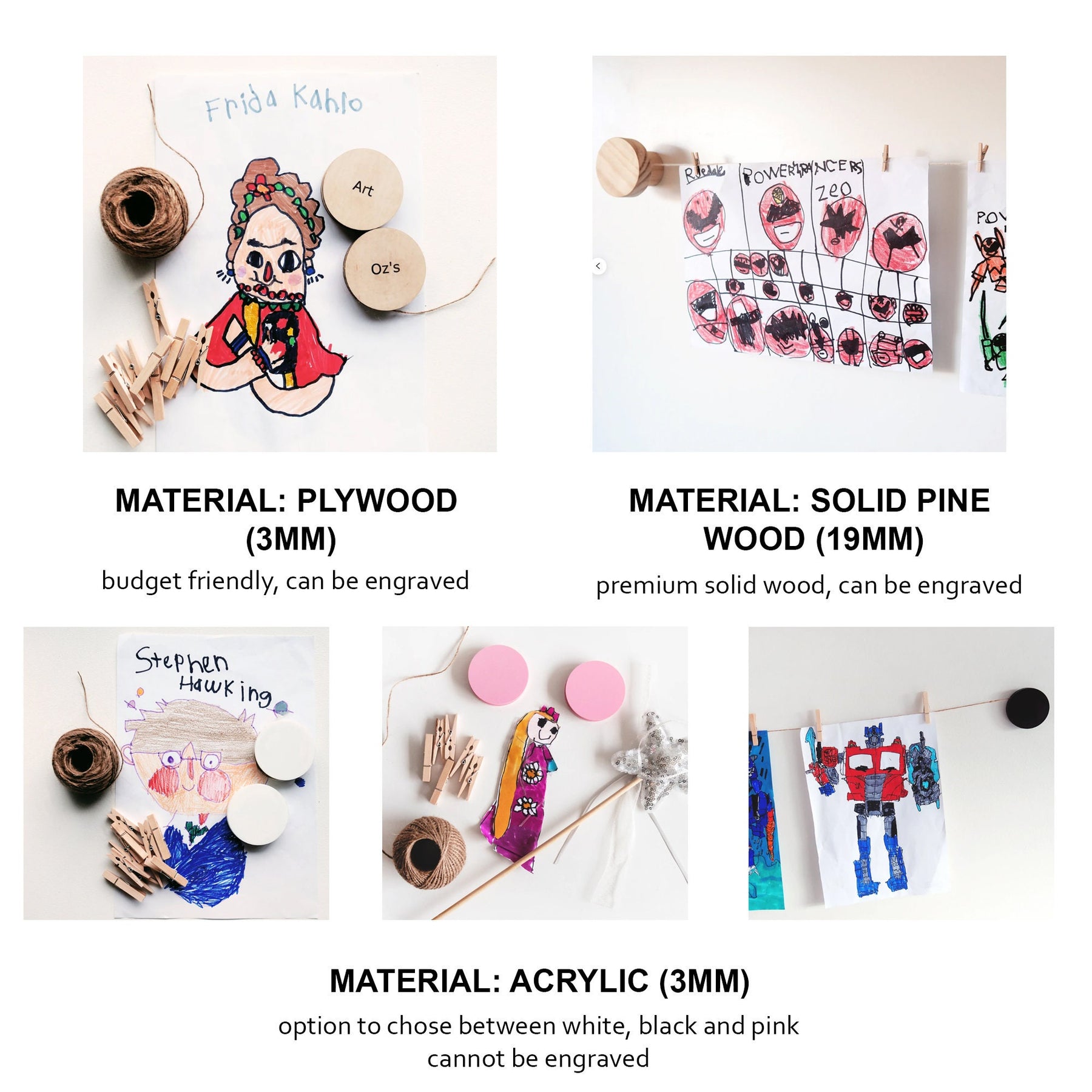 We offer three different material choices (based on your budget) for our art hangers - plywood, solid pine wood (both of which can be engraved), and acrylic (available in white, black, and pastel pink).