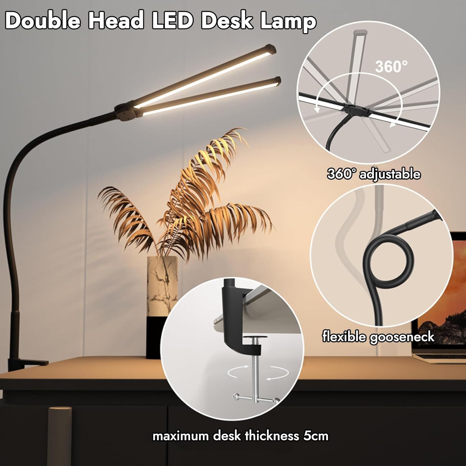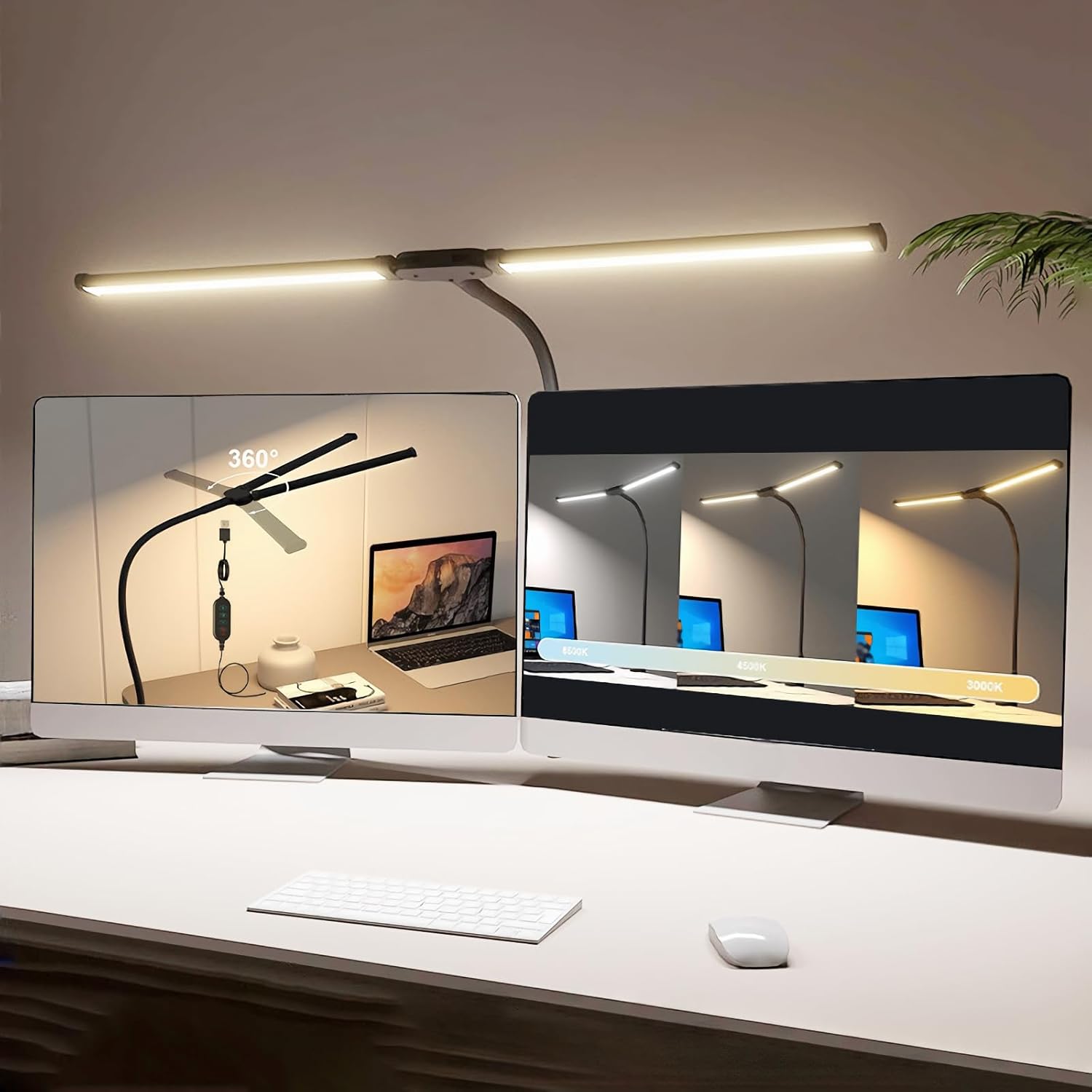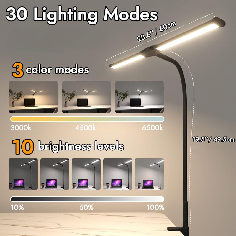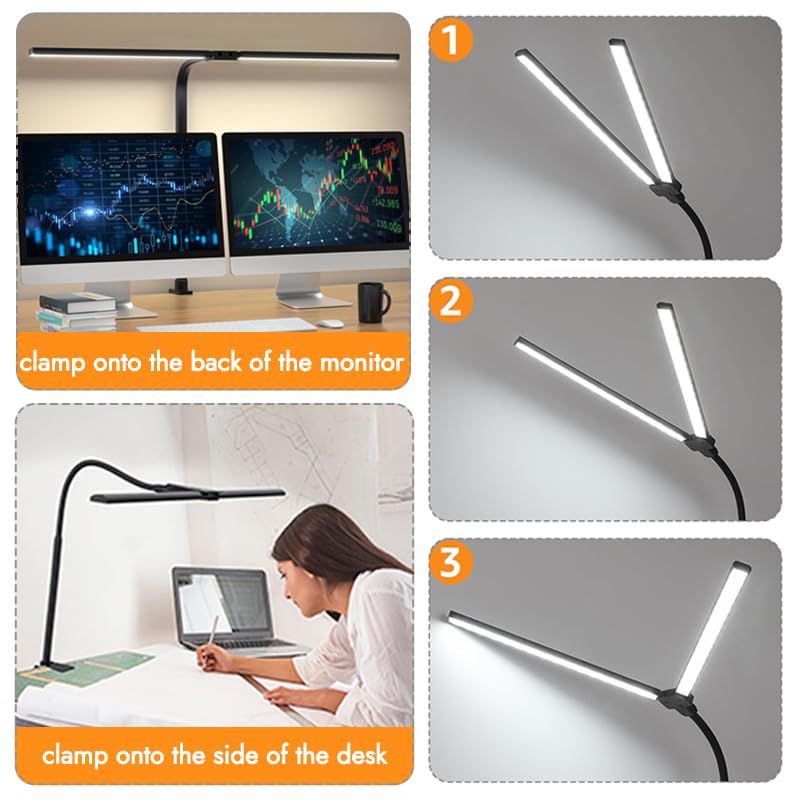 🌜 Ultra Large Double-head Design: Our LED desk light strip adopts double arm design, the swing arms of the double lamp can be horizontally extended 180 ° in a straight line for multi angle adjustment. When extended, the taskbar has a super wide span of 60cm, achieving uniform full table coverage, which is very suitable for dual displays, fixed wide displays, or L-shaped tables. The gooseneck tube of the overhead LED desk lamp can be adjusted 360 °, effectively reducing shadows and providing you with a larger lighting coverage range and angle.