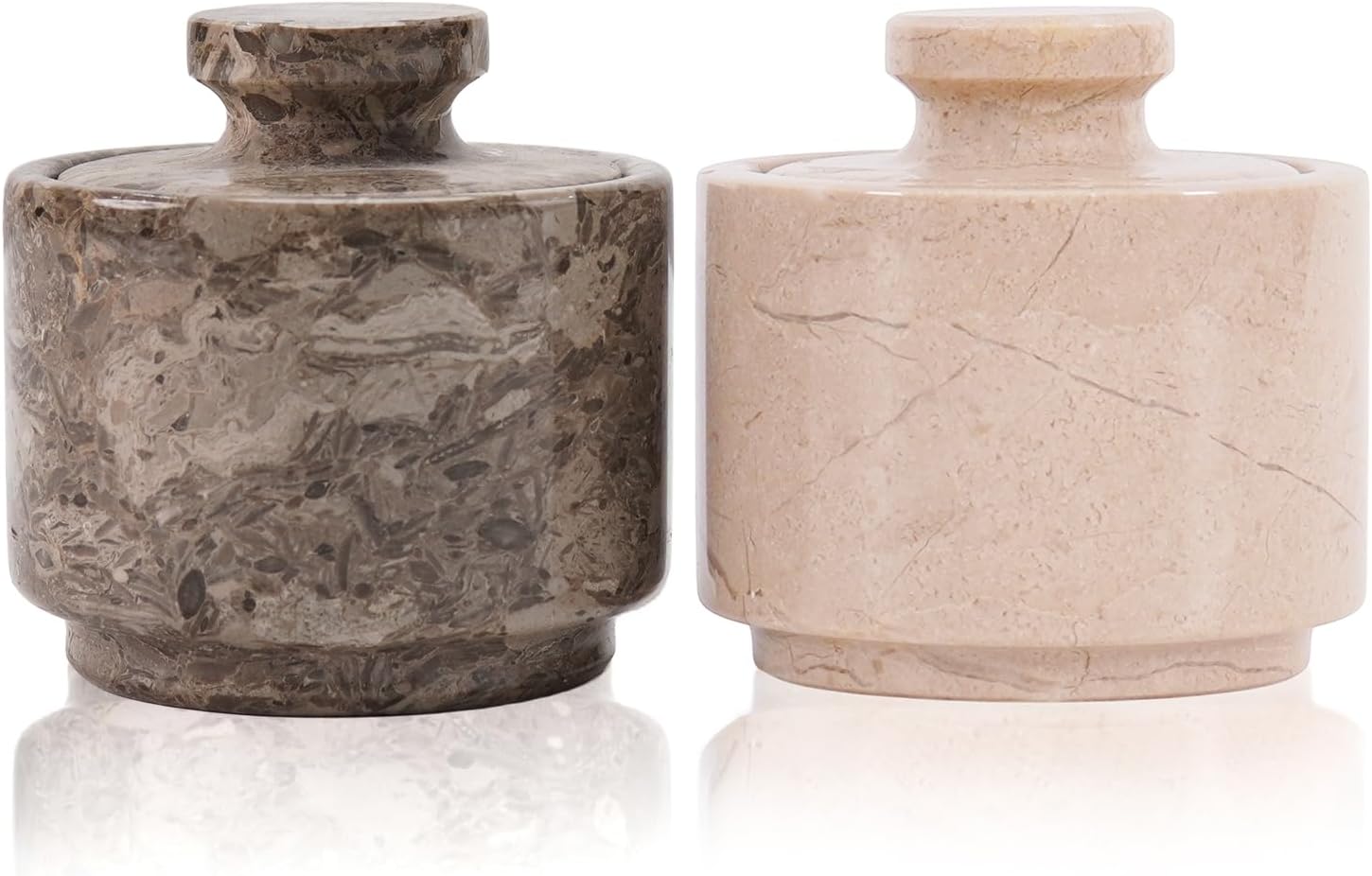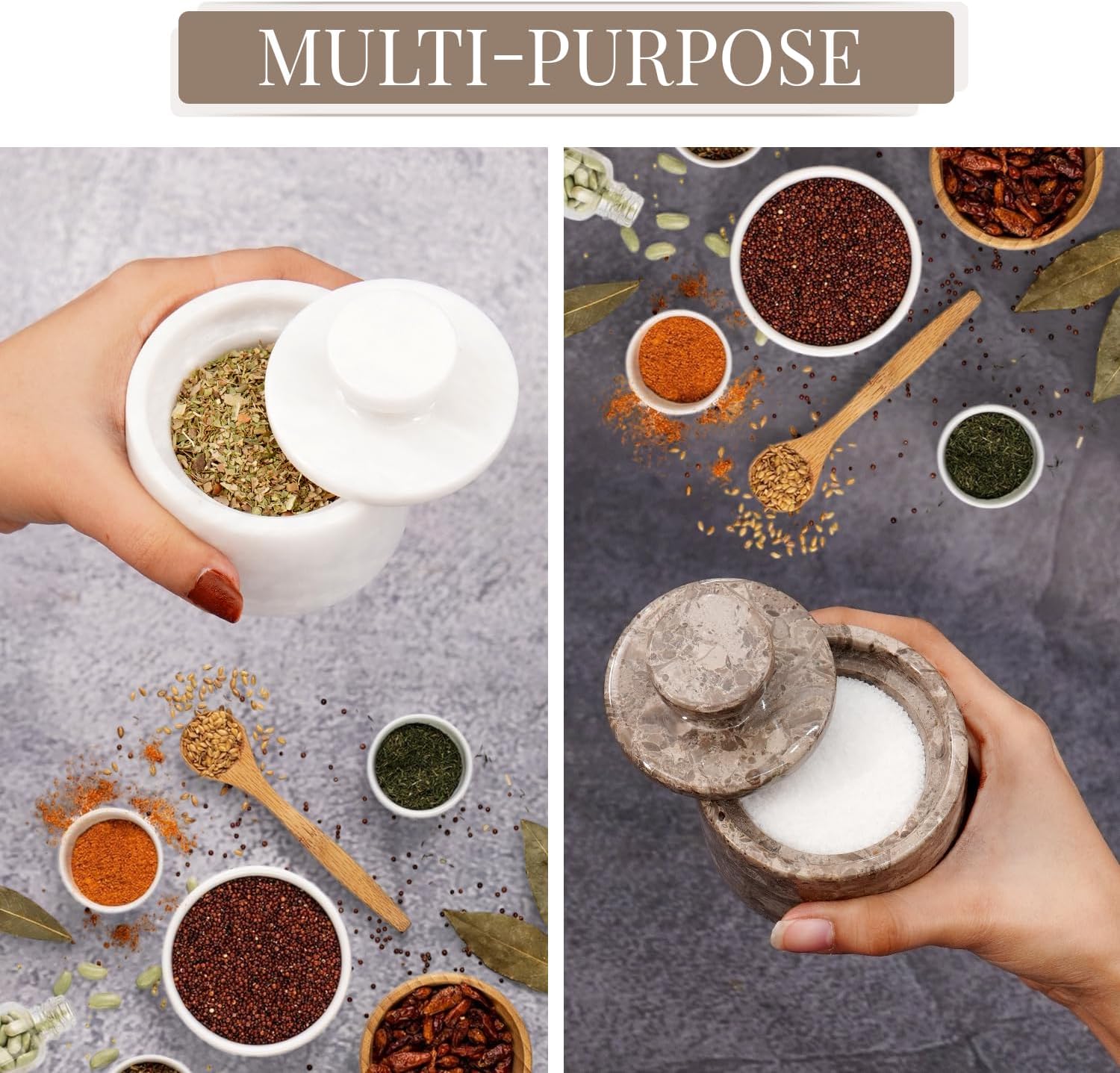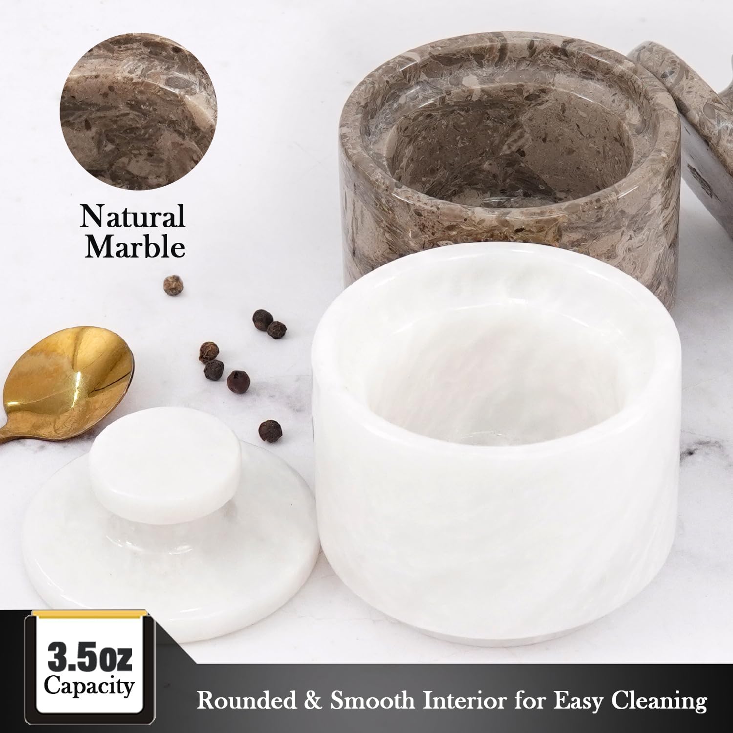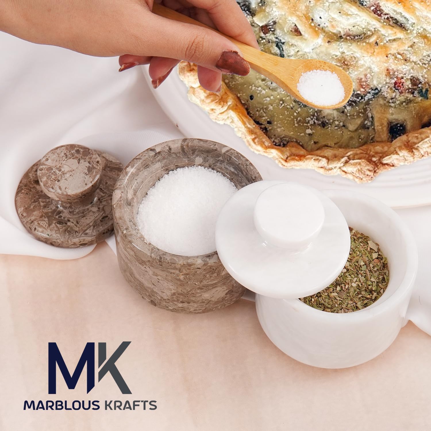 Marblous Krafts Stylish Marble Salt and Pepper Cellar White and Grey Oceanic 3.5 oz Salt Cellar, Salt Container and Tea Storage Box 3" X 3" Salt Holder with lid (White and Grey Oceanic)
