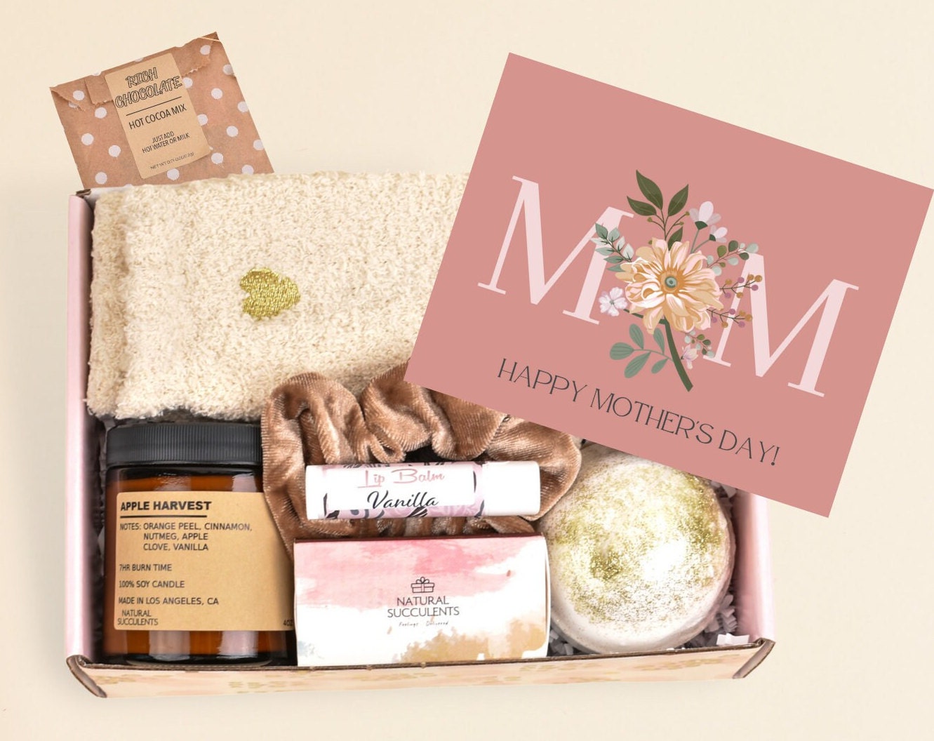 G I F T B O X contains: ✦ 4 oz. hand-poured scented soy candle ✦ Safety matches ✦ Bath bomb ✦ Lip balm ✦ Cozy Socks ✦ Hot chocolate mix ✦ Velvet Scrunchies ✦ Greeting card featuring a personalised message printed on the reverse ✦ Beautifully packaged in a designer box