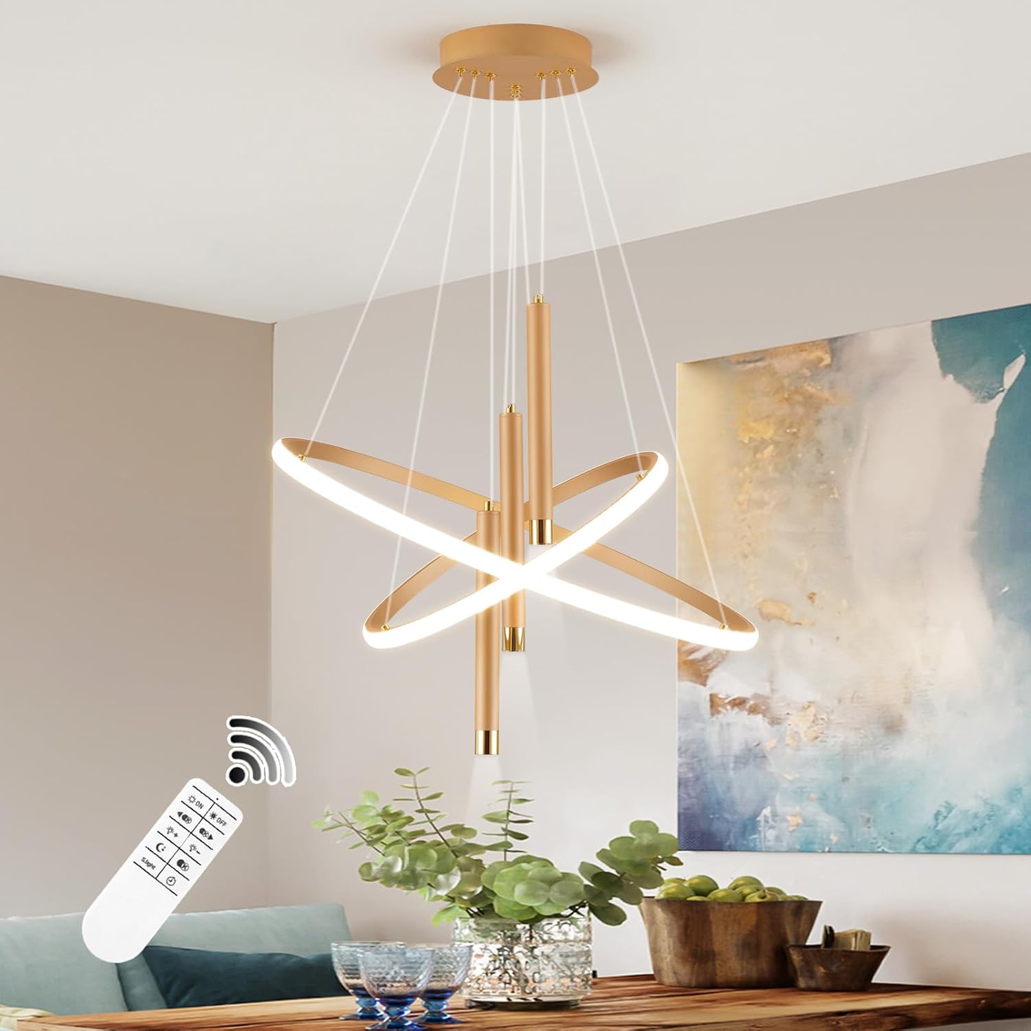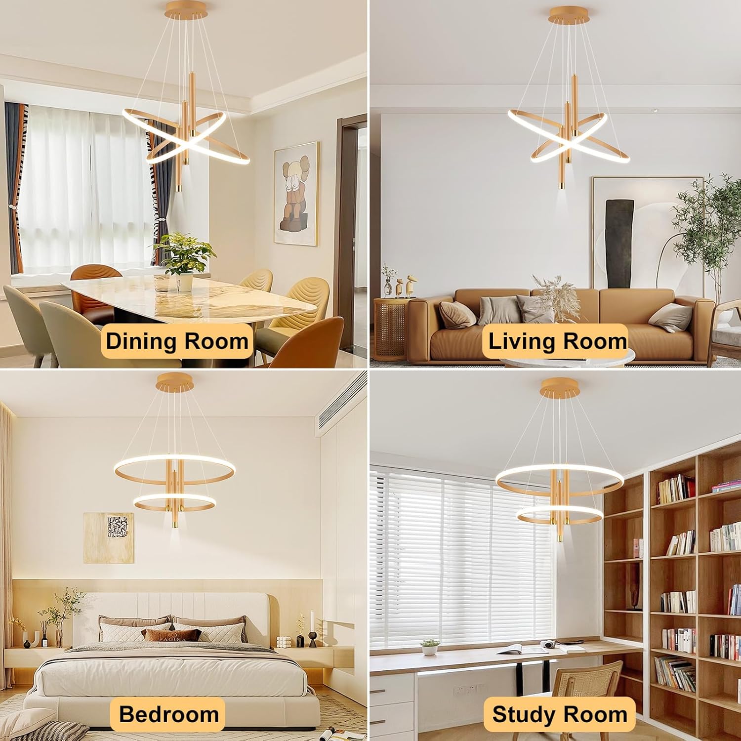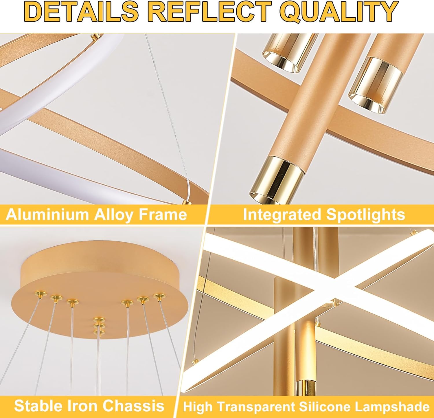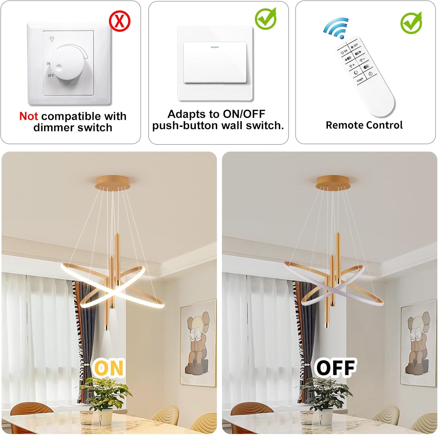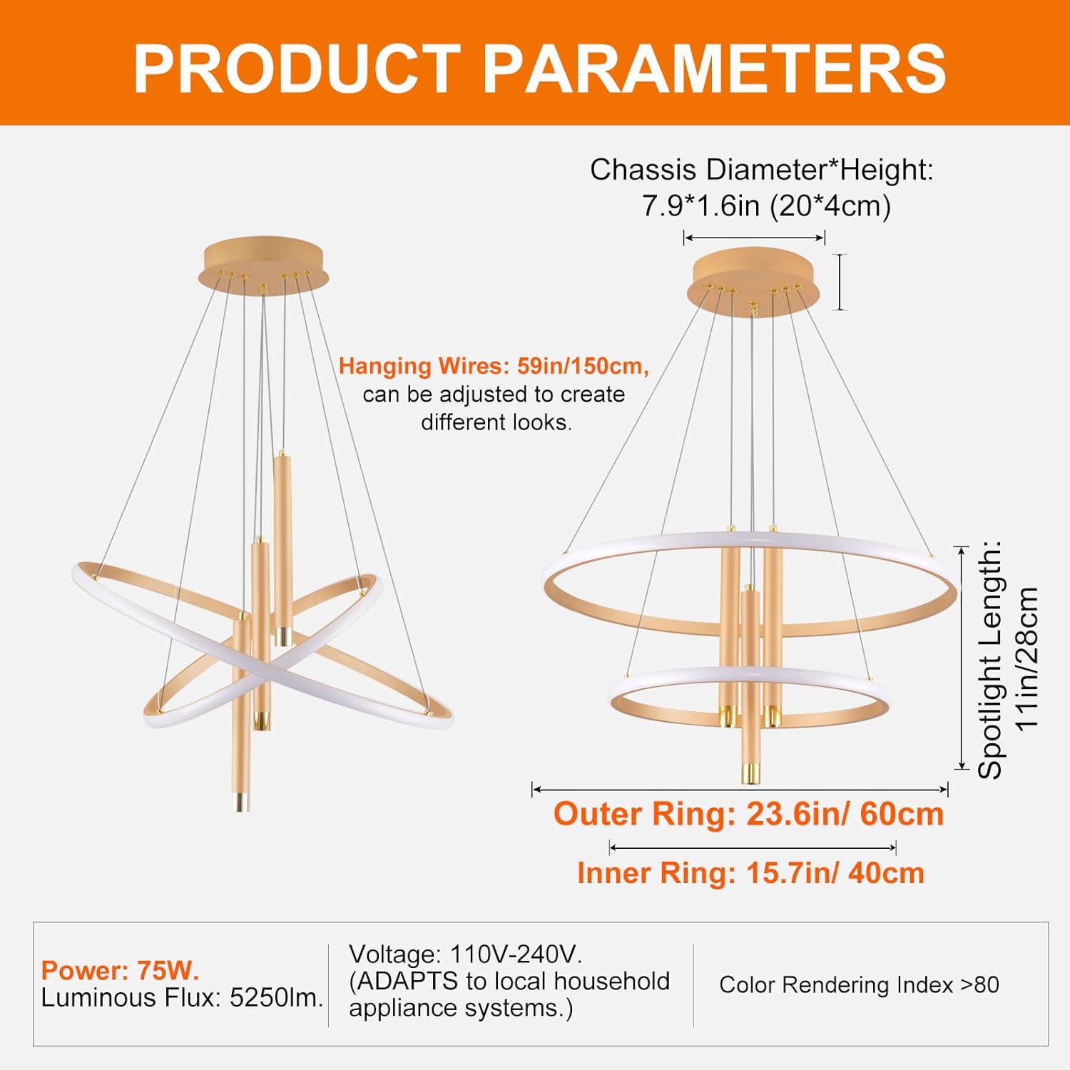 ✅【Fully Dimmable with Remote + Various Functions】—Brightness: 10-100%. Color Temperature: 3000-6000K. According to your preference, you can adjust the gold LED chandelier light fixture through the matching remote. Memory Function & Nightlight Mode can also be achieved via our matched remote control. [PS: NOT compatible with wall Dimmer switch.] ✅【Upgraded LED Chip + Stable Performance】—Power: 75W. Luminous Flux: 5250lm. (Please refer to the display video.) Voltage: 220V-240V (Suitable for local electricity standards). With upgraded LED light source, the gold chandeliers for living room is more efficient and energy-saving, stable and no flicker, soft light protects your family's eyes. The gold pendant lights kitchen island has CRI 80+ to capture all natural colors of the objects to get a more comfortable visual experience. ✅【Design It Yourself + Suitable Size + Widely Used】—Diameter of the 2 rings: 23.6+15.7in (60+40cm). Chassis Diameter*Height: 7.9*1.6in (20*4cm). Adjustable Hanging Wires: 59in/150cm, can be adjusted to create multiple different looks. The modern LED chandelier can be used as dining room light fixtures over table, or modern light fixtures ceiling for household and commercial. Suitable for dining room, over dining table, kitchen island, living room, bedroom, office, restaurant, bar, etc. ✅【High Quality Materials + Long Service Life】—The kitchen island pendant light design is unique, modern and simple, suitable for a variety of house decoration styles. High-end frosted aluminum frame, fine polished surface with silicone lampshade, better light transmission, anti-corrosion, faded prevention, anti-scratch. Average lifespan: >40,000 hrs. Factory warranty: 2 years. ✅【Cost-effective + Easy to Install】—The structure of the round hanging chandelier is integrated, you only need to install it directly on the ceiling. If you have any questions about the bedroom chandelier ceiling light, please find your Order ID and click on "Seller" to contact us. We have our own factory and engineer team, will reply within 6 hours or send replacement parts. ►►Not compatible with dimmable wall switch, can be adapted to regular ON/OFF wall switch, remote control or APP.