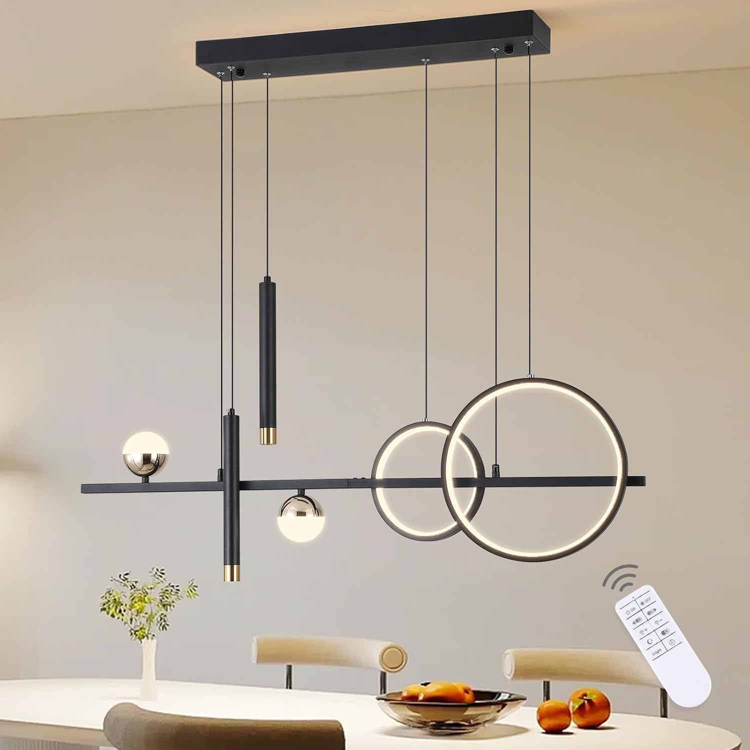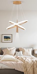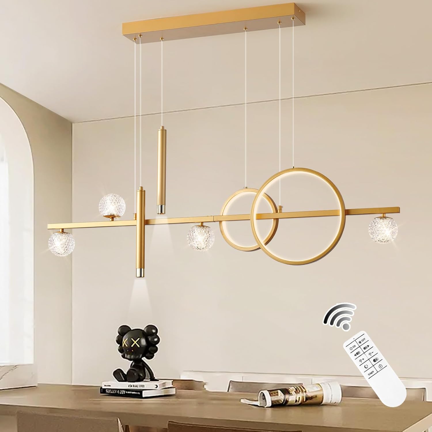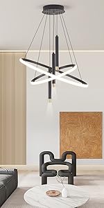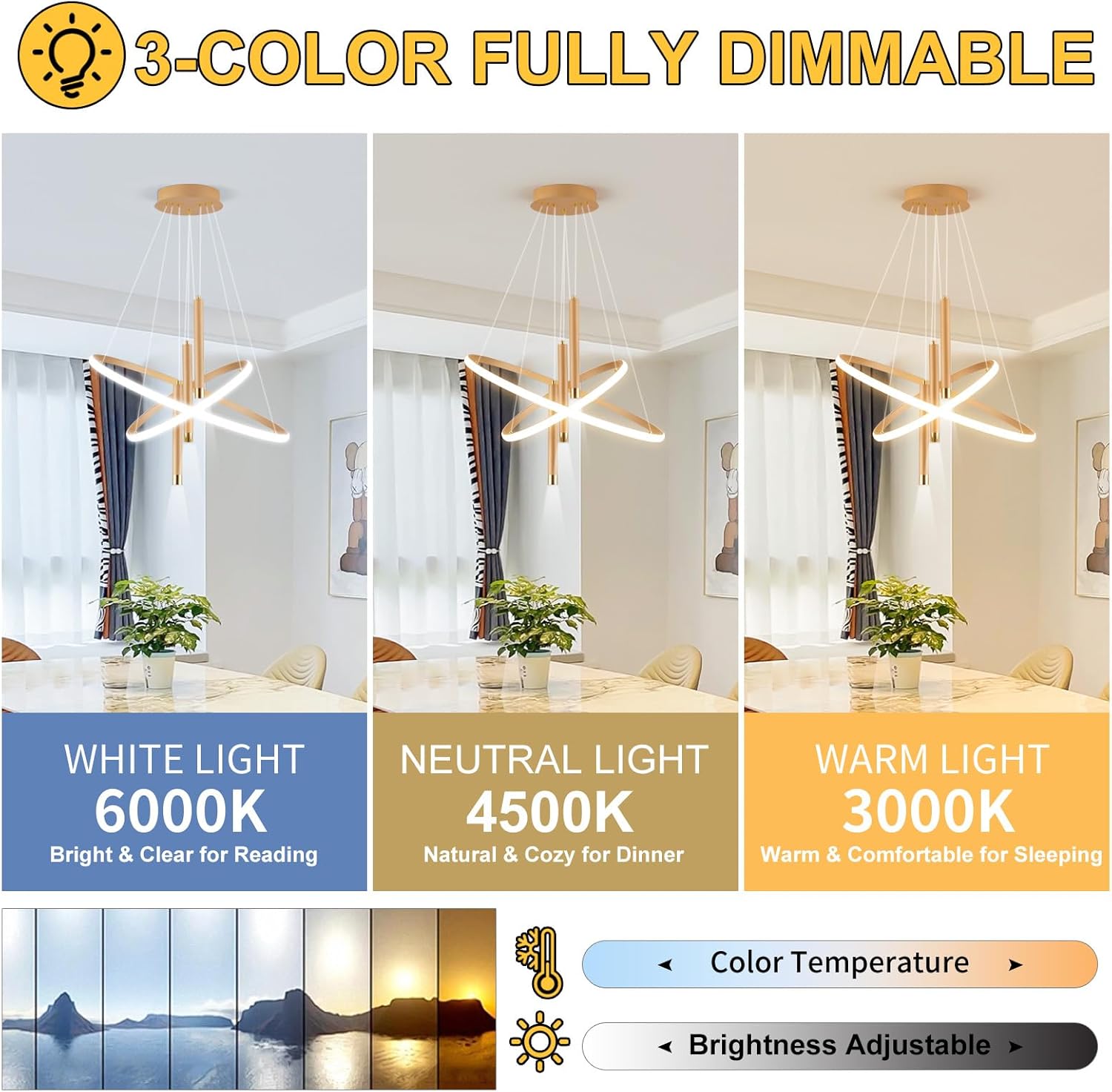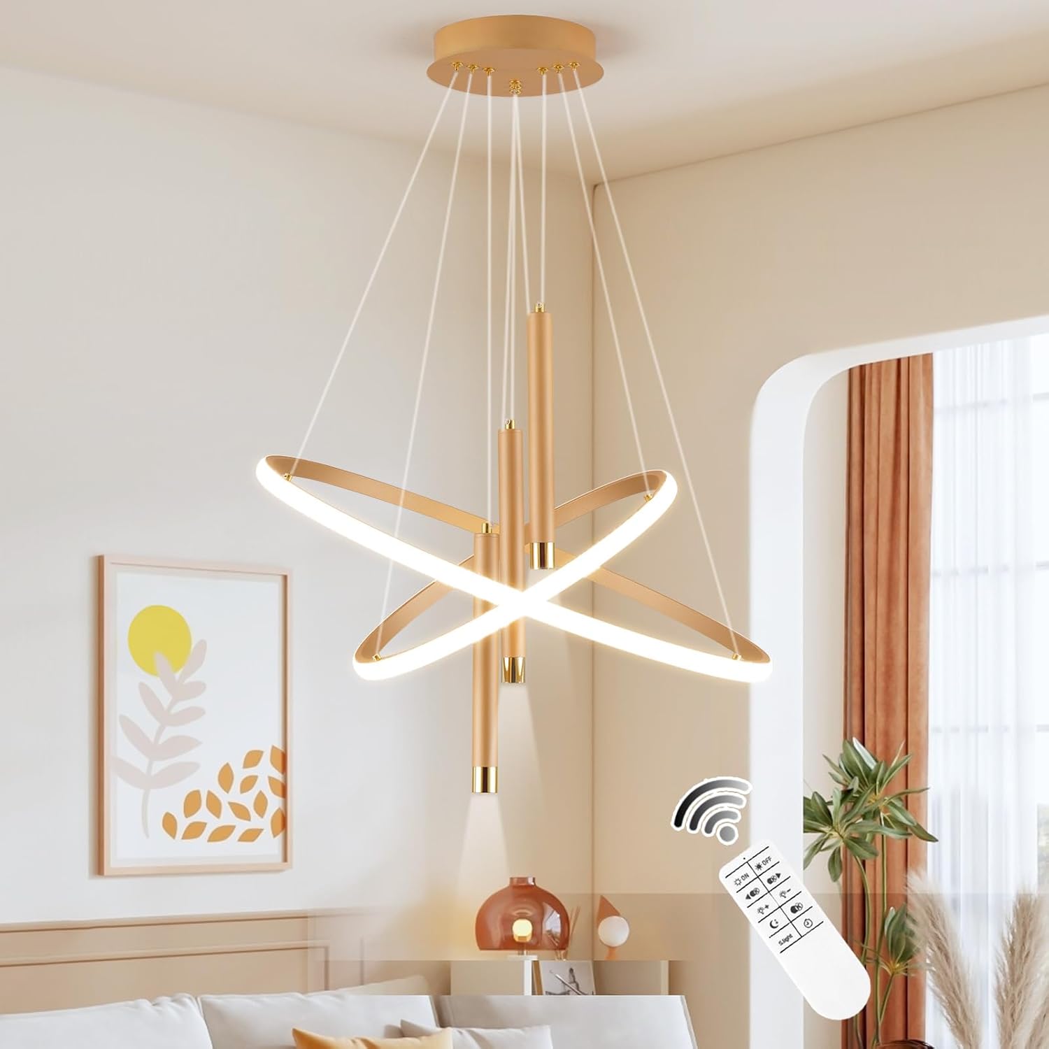 ✅【Fully Dimmable with Remote + Various Functions】—Brightness: 10-100%. Color Temperature: 3000-6000K. According to your preference, you can adjust the gold LED chandelier light fixture through the matching remote. Memory Function & Nightlight Mode can also be achieved via our matched remote control. [PS: NOT compatible with wall Dimmer switch.] ✅【Upgraded LED Chip + Stable Performance】—Power: 75W. Luminous Flux: 5250lm. (Please refer to the display video.) Voltage: 220V-240V (Suitable for local electricity standards). With upgraded LED light source, the gold chandeliers for living room is more efficient and energy-saving, stable and no flicker, soft light protects your family's eyes. The gold pendant lights kitchen island has CRI 80+ to capture all natural colors of the objects to get a more comfortable visual experience. ✅【Design It Yourself + Suitable Size + Widely Used】—Diameter of the 2 rings: 23.6+15.7in (60+40cm). Chassis Diameter*Height: 7.9*1.6in (20*4cm). Adjustable Hanging Wires: 59in/150cm, can be adjusted to create multiple different looks. The modern LED chandelier can be used as dining room light fixtures over table, or modern light fixtures ceiling for household and commercial. Suitable for dining room, over dining table, kitchen island, living room, bedroom, office, restaurant, bar, etc. ✅【High Quality Materials + Long Service Life】—The kitchen island pendant light design is unique, modern and simple, suitable for a variety of house decoration styles. High-end frosted aluminum frame, fine polished surface with silicone lampshade, better light transmission, anti-corrosion, faded prevention, anti-scratch. Average lifespan: >40,000 hrs. Factory warranty: 2 years. ✅【Cost-effective + Easy to Install】—The structure of the round hanging chandelier is integrated, you only need to install it directly on the ceiling. If you have any questions about the bedroom chandelier ceiling light, please find your Order ID and click on "Seller" to contact us. We have our own factory and engineer team, will reply within 6 hours or send replacement parts. ►►Not compatible with dimmable wall switch, can be adapted to regular ON/OFF wall switch, remote control or APP.