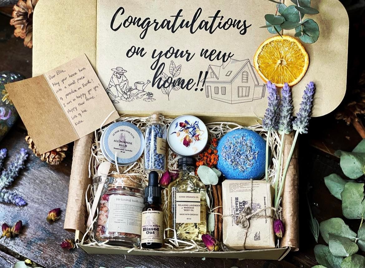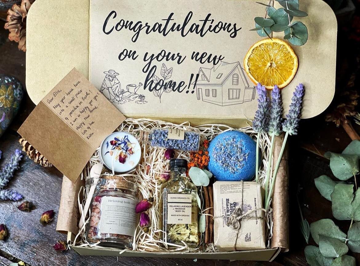 This personalized self-care gift set makes a perfect present for anyone moving into a new home. It contains organic, plant-based, vegan, toxin-free, plastic-free, and zero waste items, along with a handwritten note and/or a short message inscribed on the top of the gift box. Designed especially for housewarming celebrations.