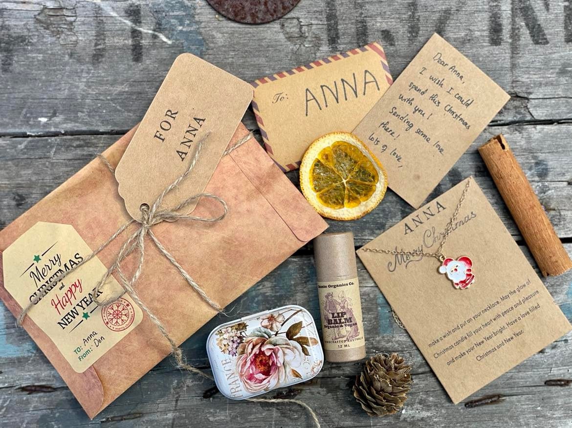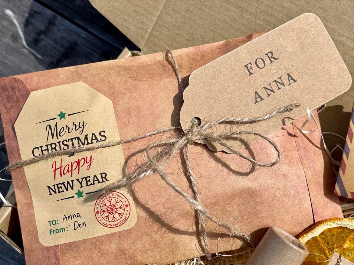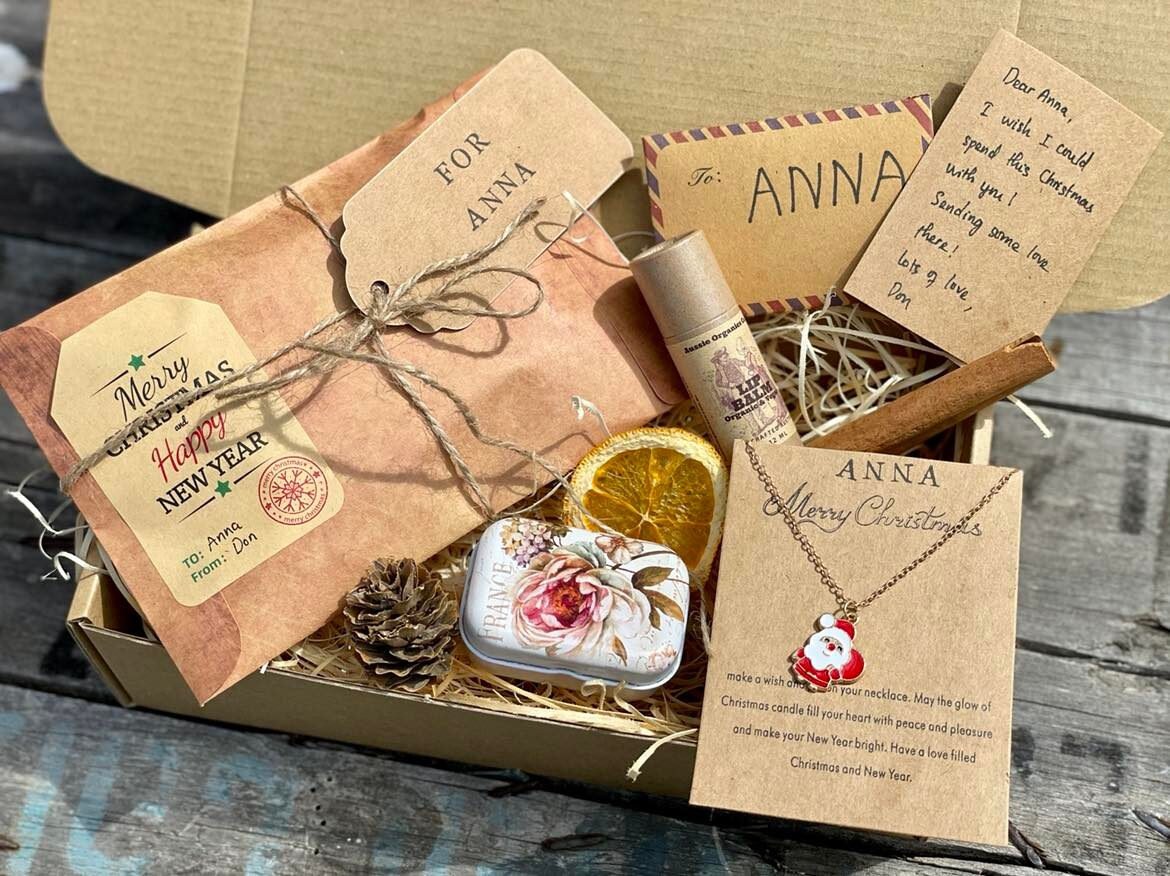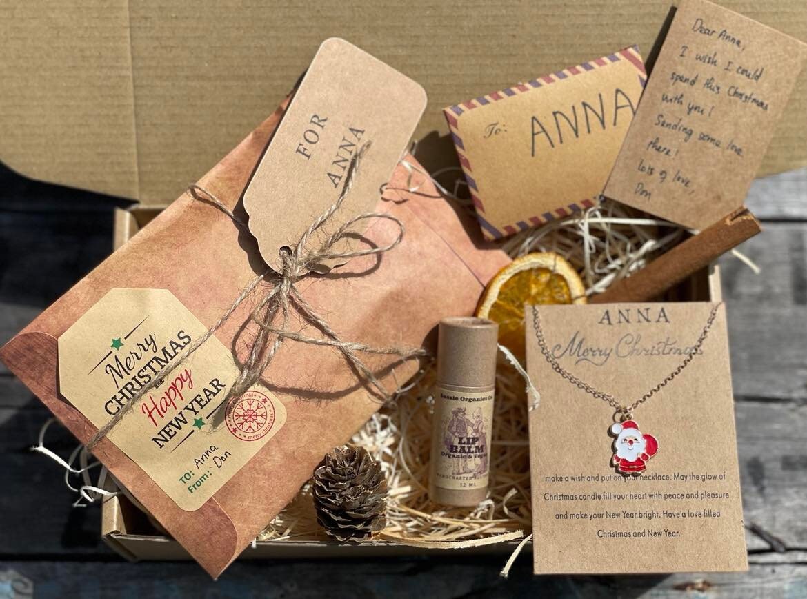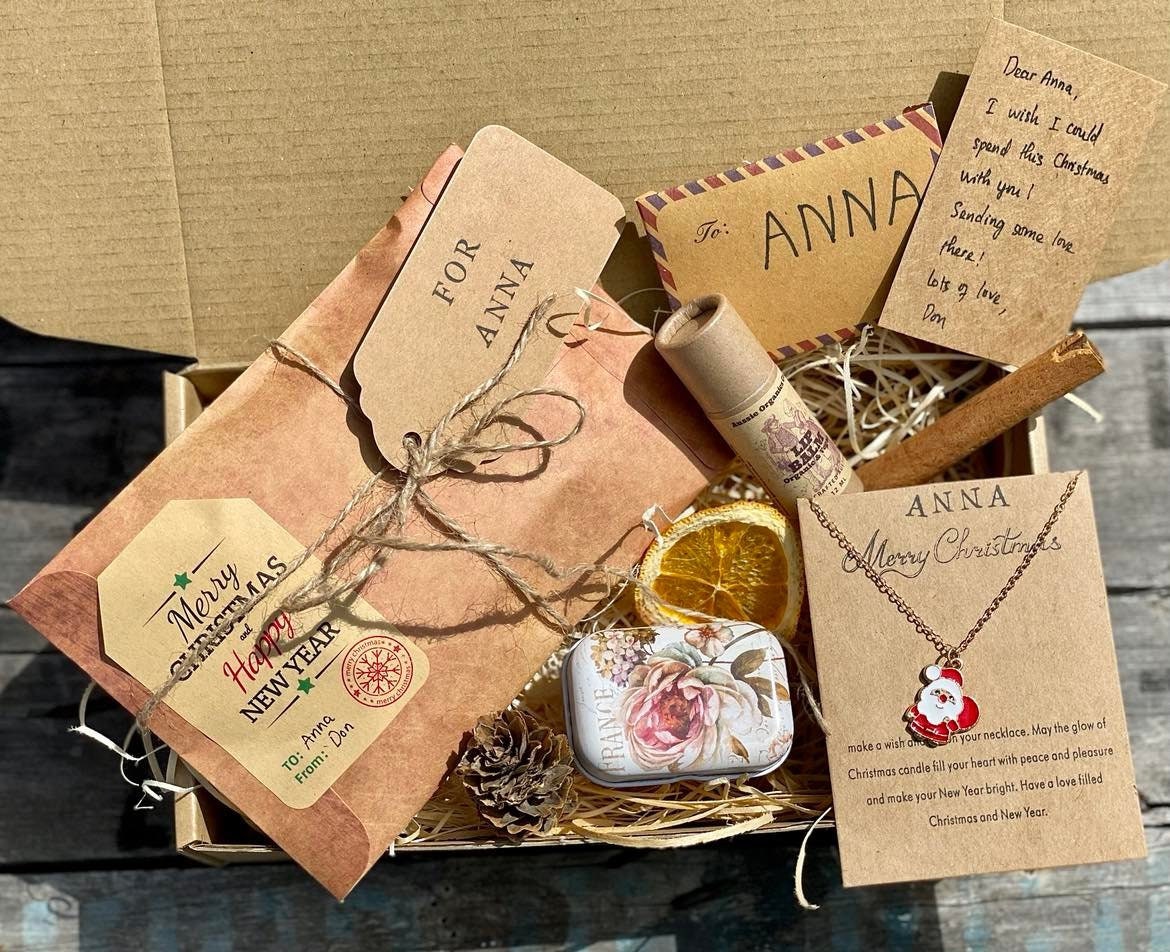 Presenting a classic vintage Christmas gift box from our collection, perfect for someone special in your life. Each personalized sign is crafted by hand using traditional methods. We are dedicated to ensuring that your gift box stands out and is as natural as possible. This gift box is entirely zero-waste, organic & natural, free from plastic and toxins, vegan-friendly, and includes personal touches such as your own message on a handwritten vintage card, along with names on cards, tags, and the box itself, making the recipient feel cherished.