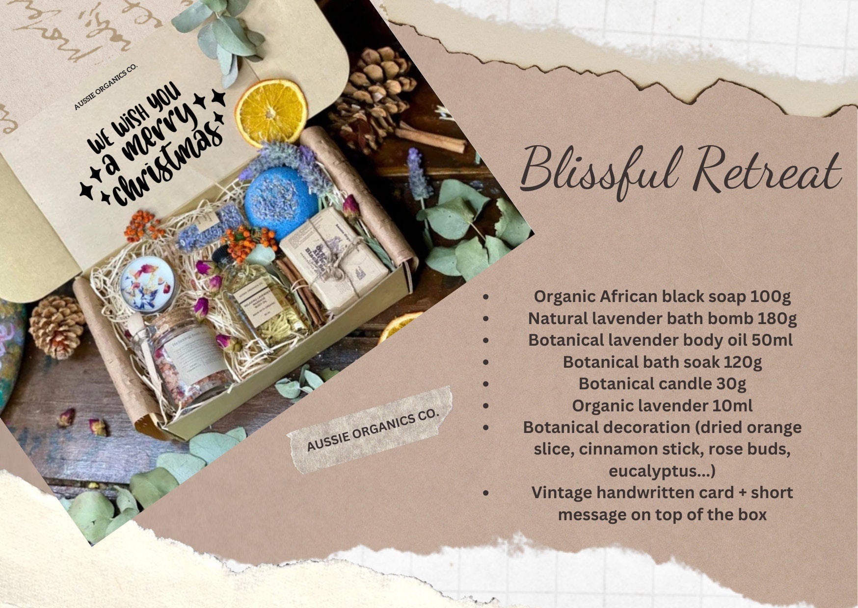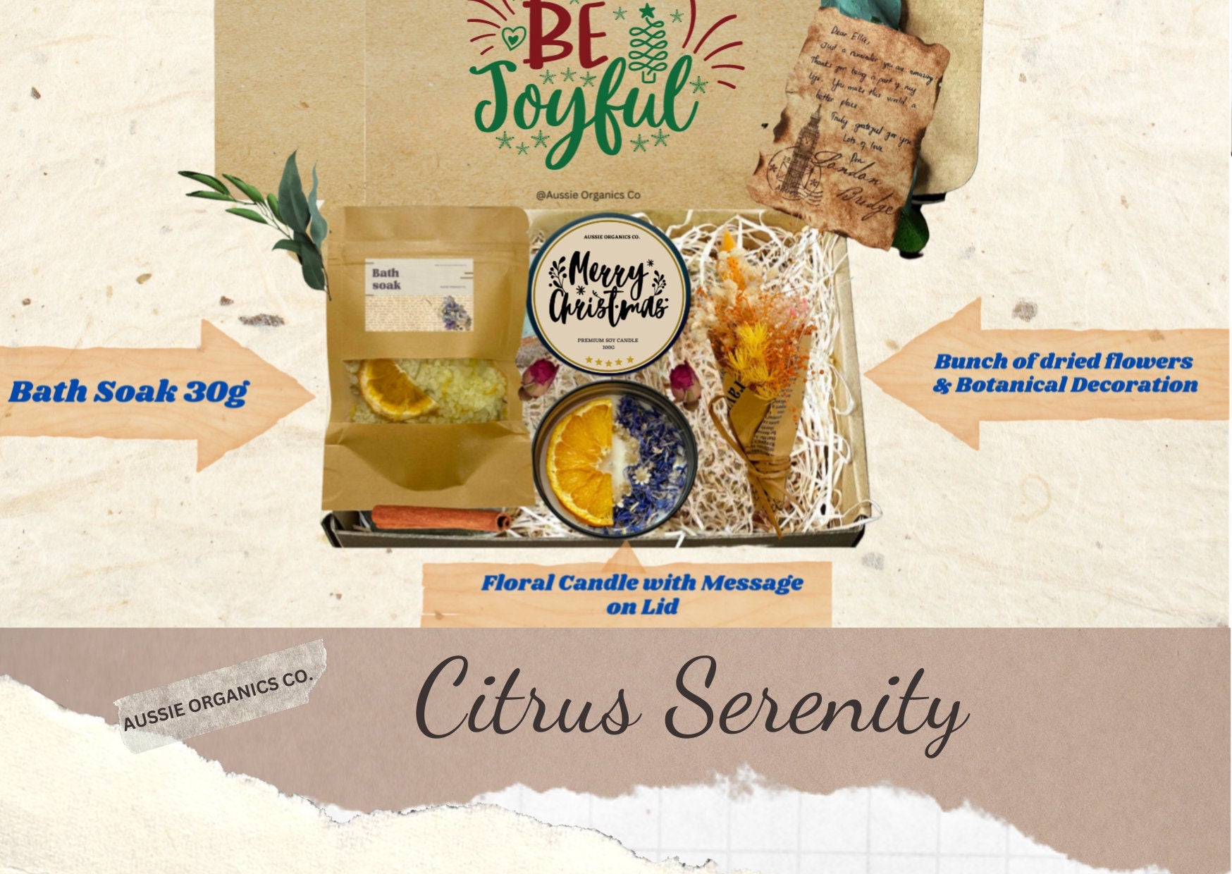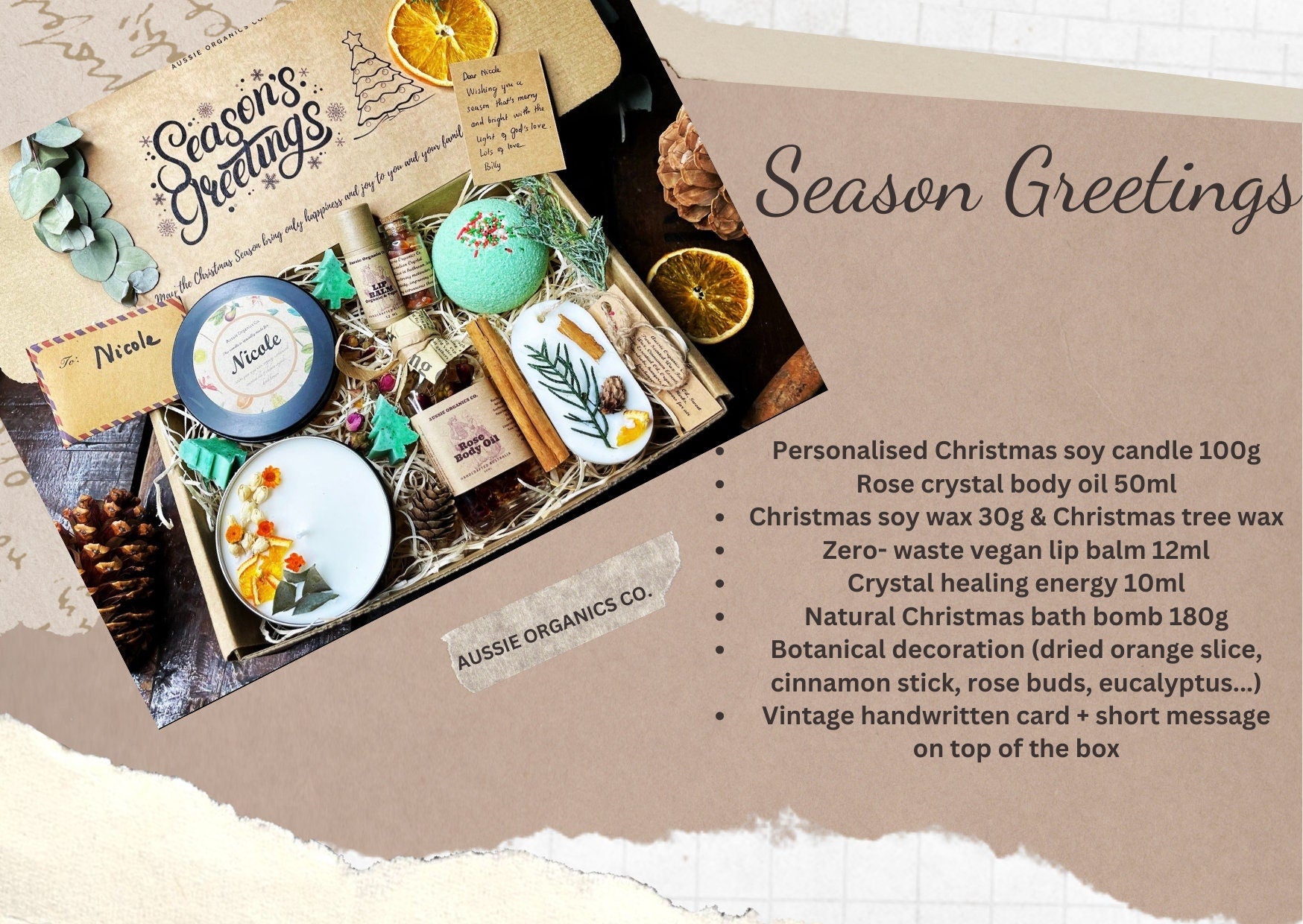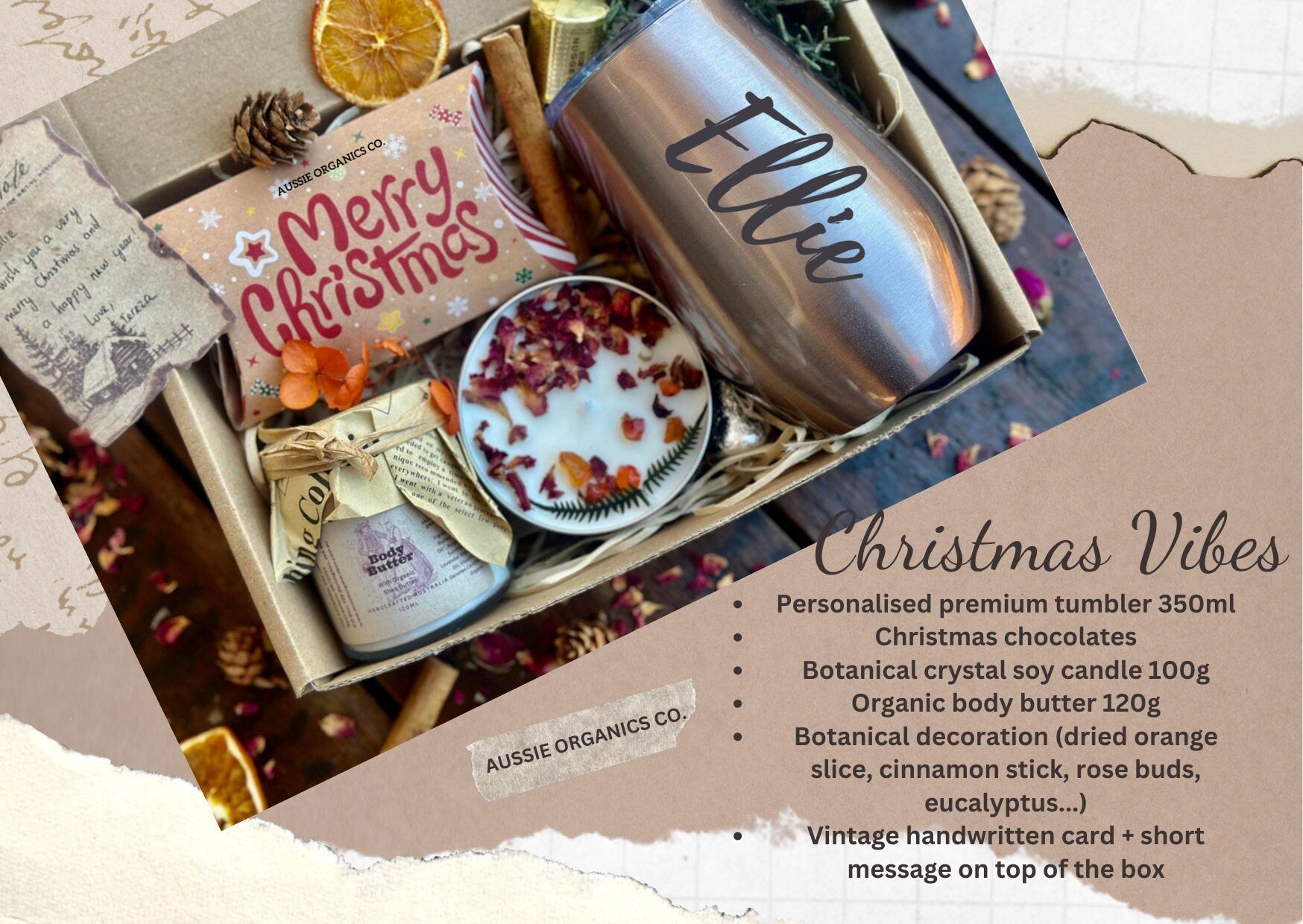 1x Vintage handwritten card + festive message on top of the box