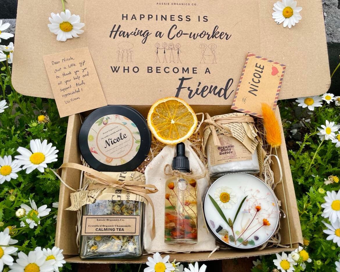 During this season, our farm is alive with blooming flowers. We invite you to share the beauty and uplifting spirit of our farm through this exquisite gift box. Designed to radiate positive energy, it makes an ideal present for your colleagues. Each item is meticulously crafted using ingredients sourced from our farm, featuring 7 chakra crystal gems. This box is eco-friendly, free from plastic and toxins. It can be PERSONALISED with your unique message on a handwritten card and/or a brief inscription on the top of the gift box, along with the recipient's name on the candle lid.