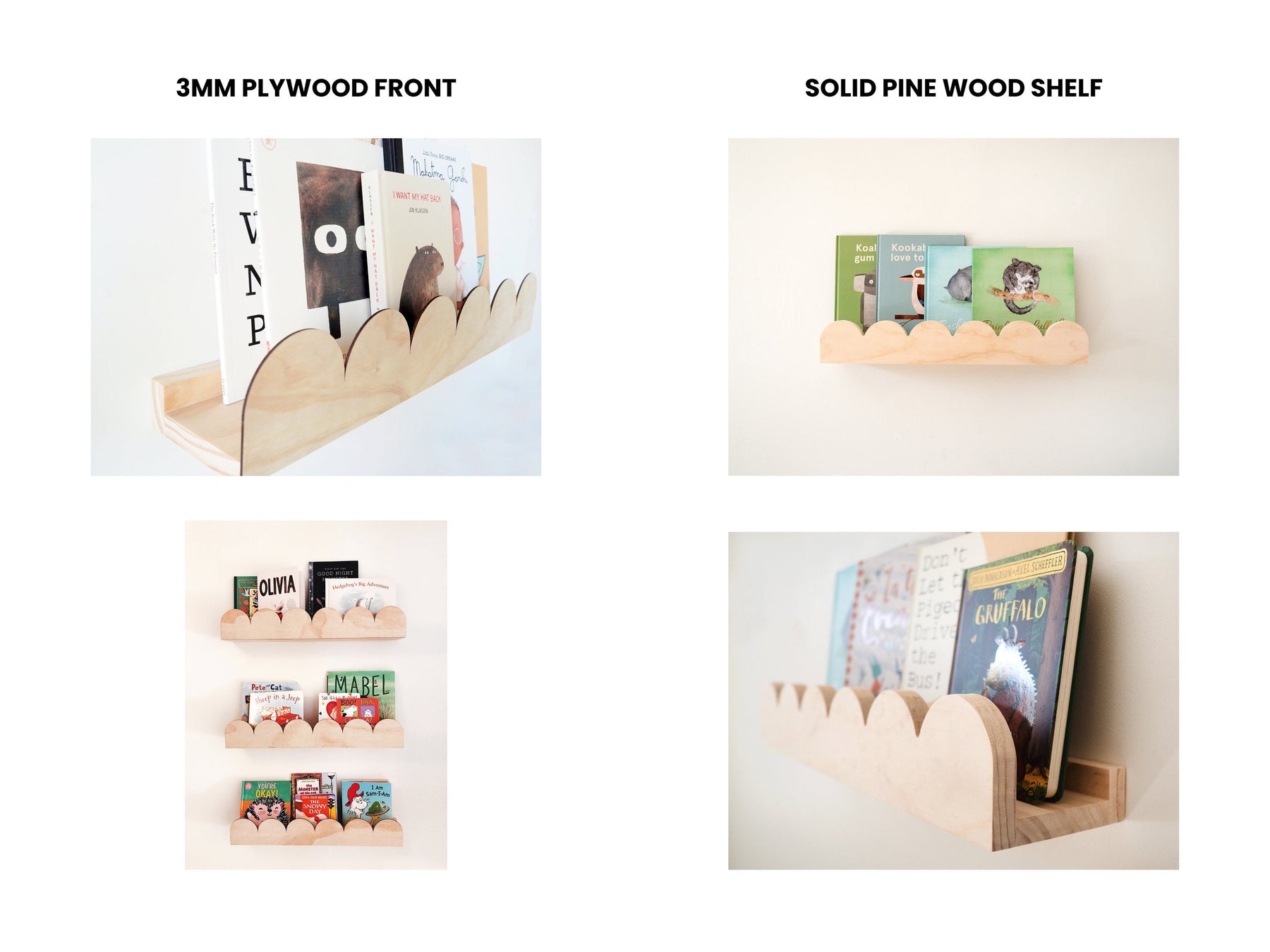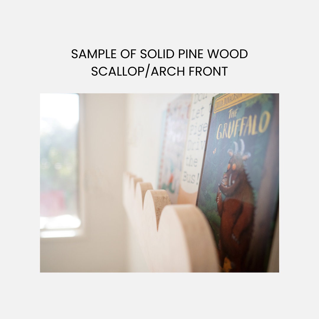 This shelf is crafted from high-quality Pine wood, with the option to select either 3mm plywood or 19mm solid pine wood for the scallops/arches.