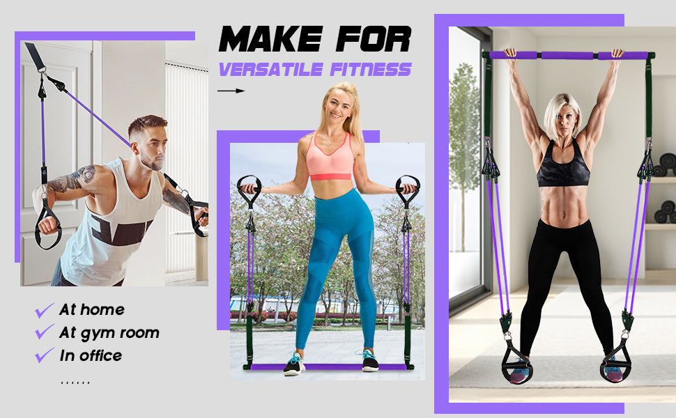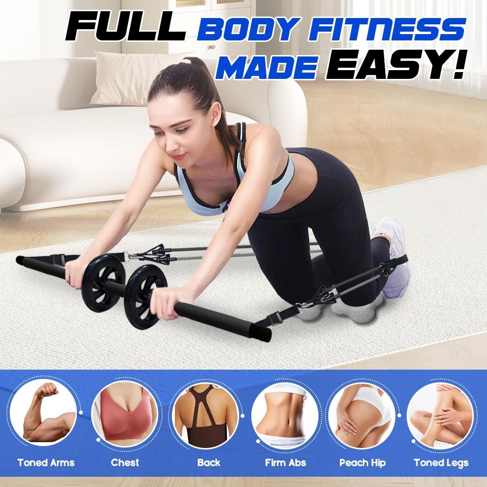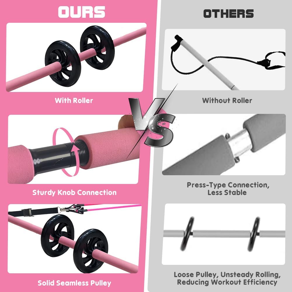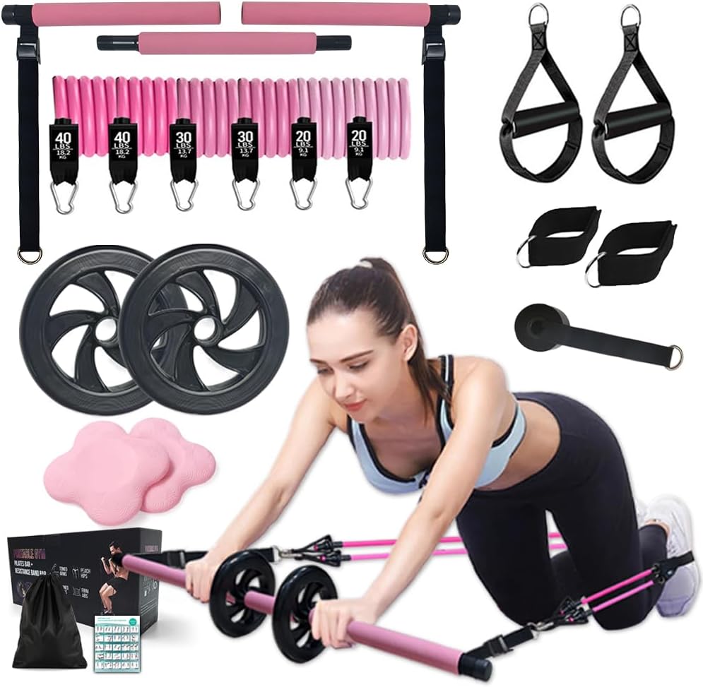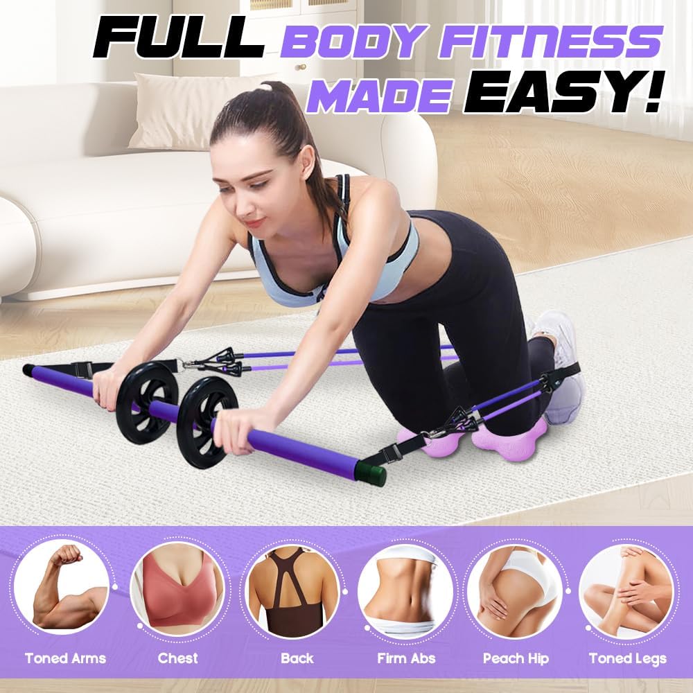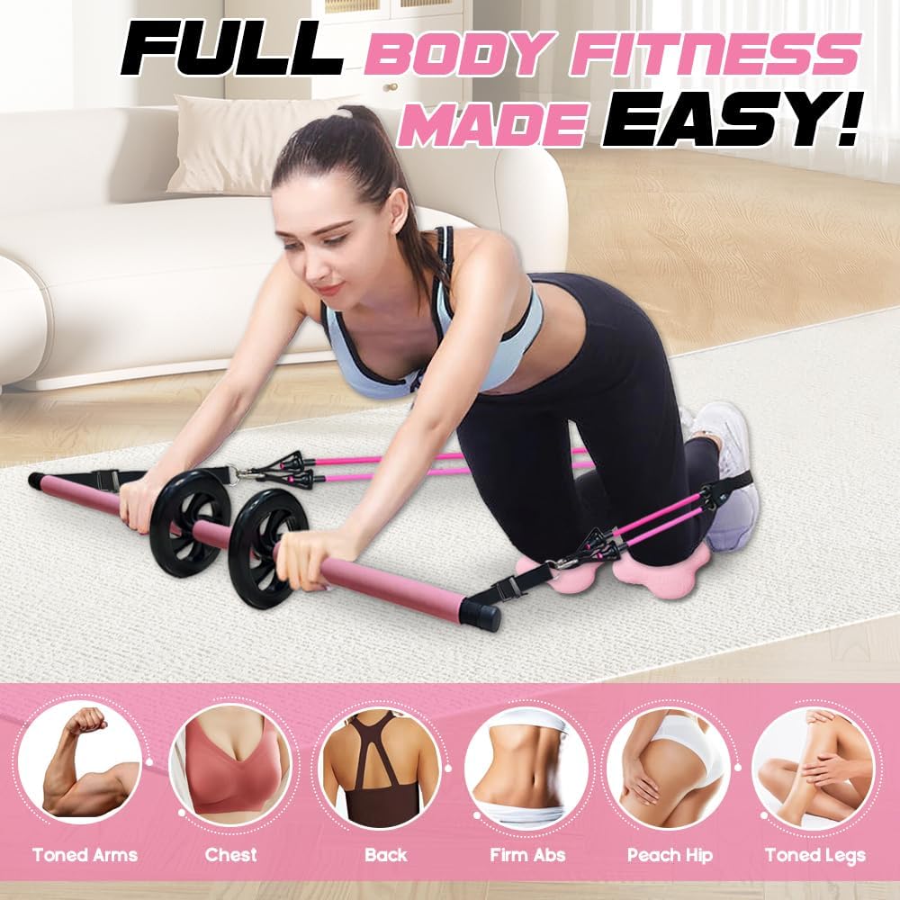 [FULL BODY WORKOUT] The Pilates Equipment Exercise Bar is perfect for Pilates, yoga, stretching, and strength training. It targets multiple muscle groups, including abs, arms, legs, hips, and back. Perform over 30 exercises with the included AB roller system and cushioning bands, creating a professional Pilates set workout experience at home or on the go