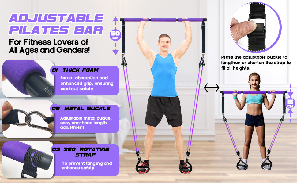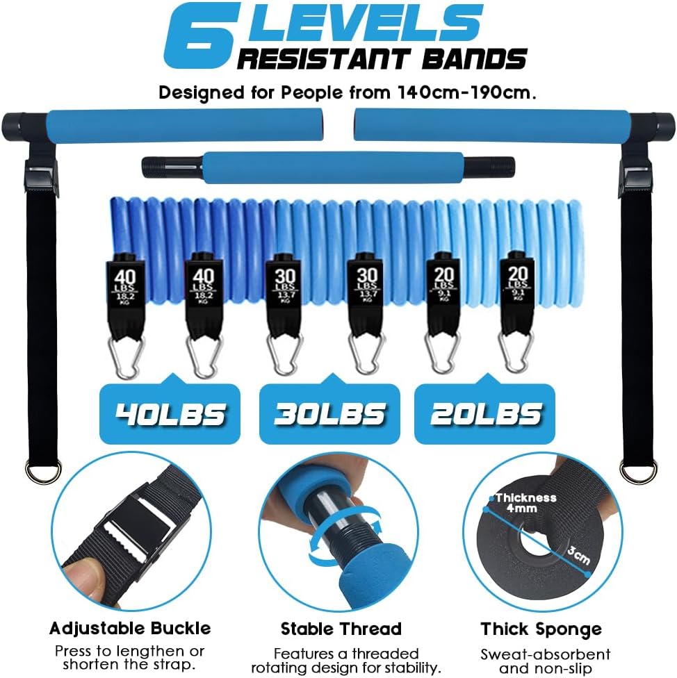 [180LBS Resistance Band Bar Kits] Comes with 6 premium TPE resistance bands: 2x20lb, 2x30lb, and 2x40lb, for a combined resistance of up to 180lbs. Encased in strong nylon sleeves, these bands are safe and long-lasting, ideal for users of all fitness levels. This Pilates bar set accommodates heights from 140cm to 190cm, making it suitable for everyone