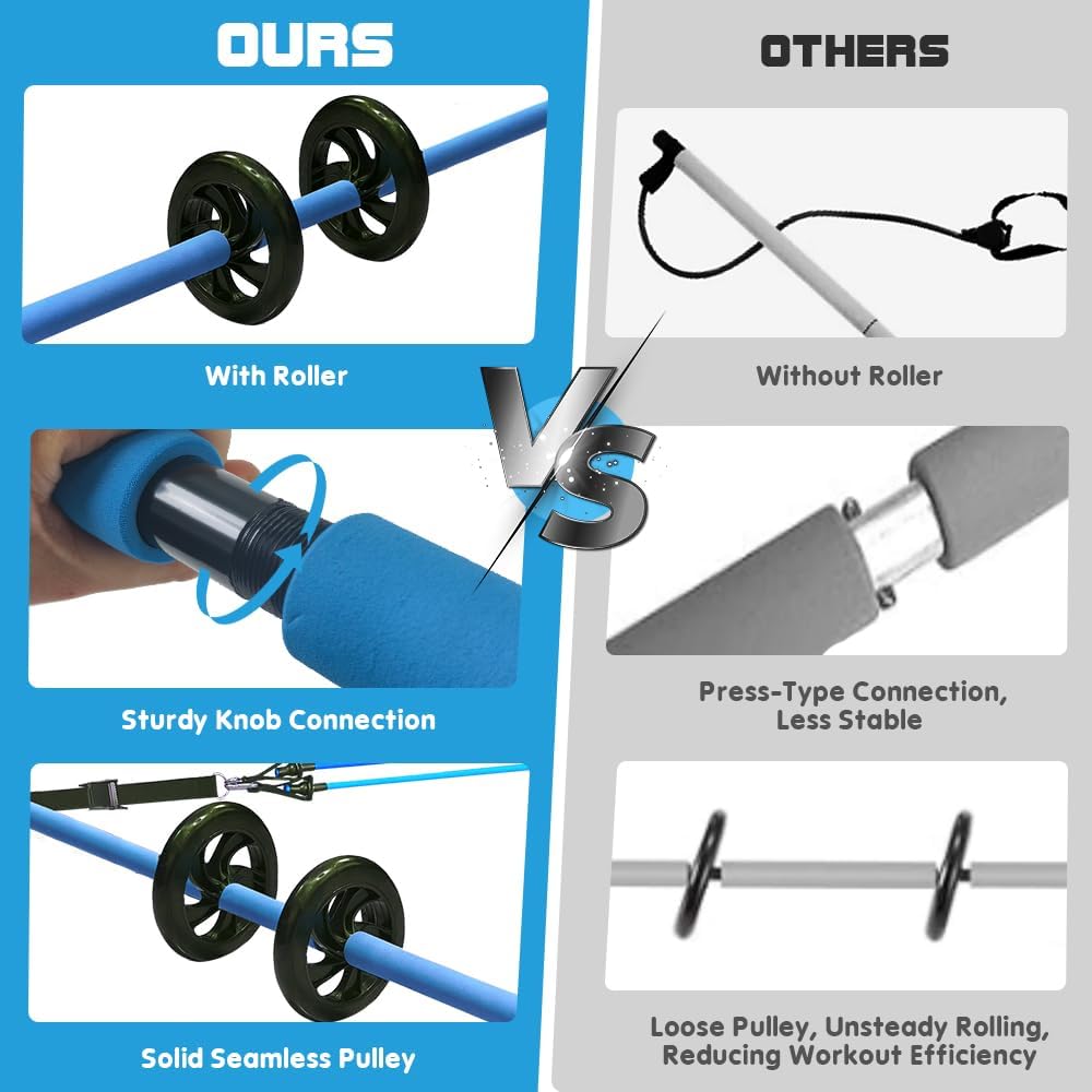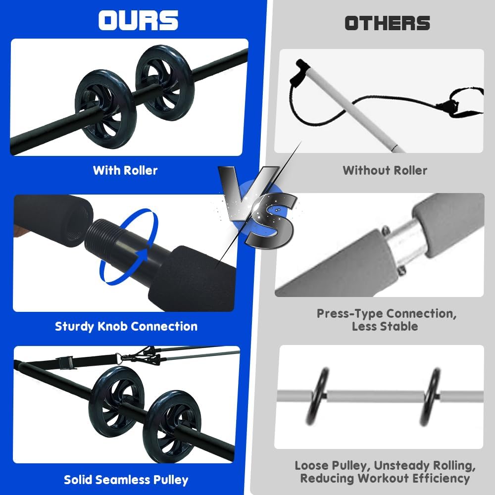 [THREADED Pilates Bar Kit with 2 ROLLERS] This Pilates Equipment Exercise Bar features a threaded design for quick and easy assembly, ensuring durability and safety. The thicker ab roller adds extra protection, making your workouts safer. The Portable Pilates Bar Kit includes a convenient bag, perfect for storage or taking your workouts outdoors or while traveling