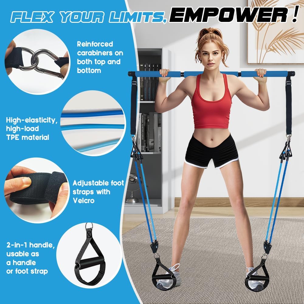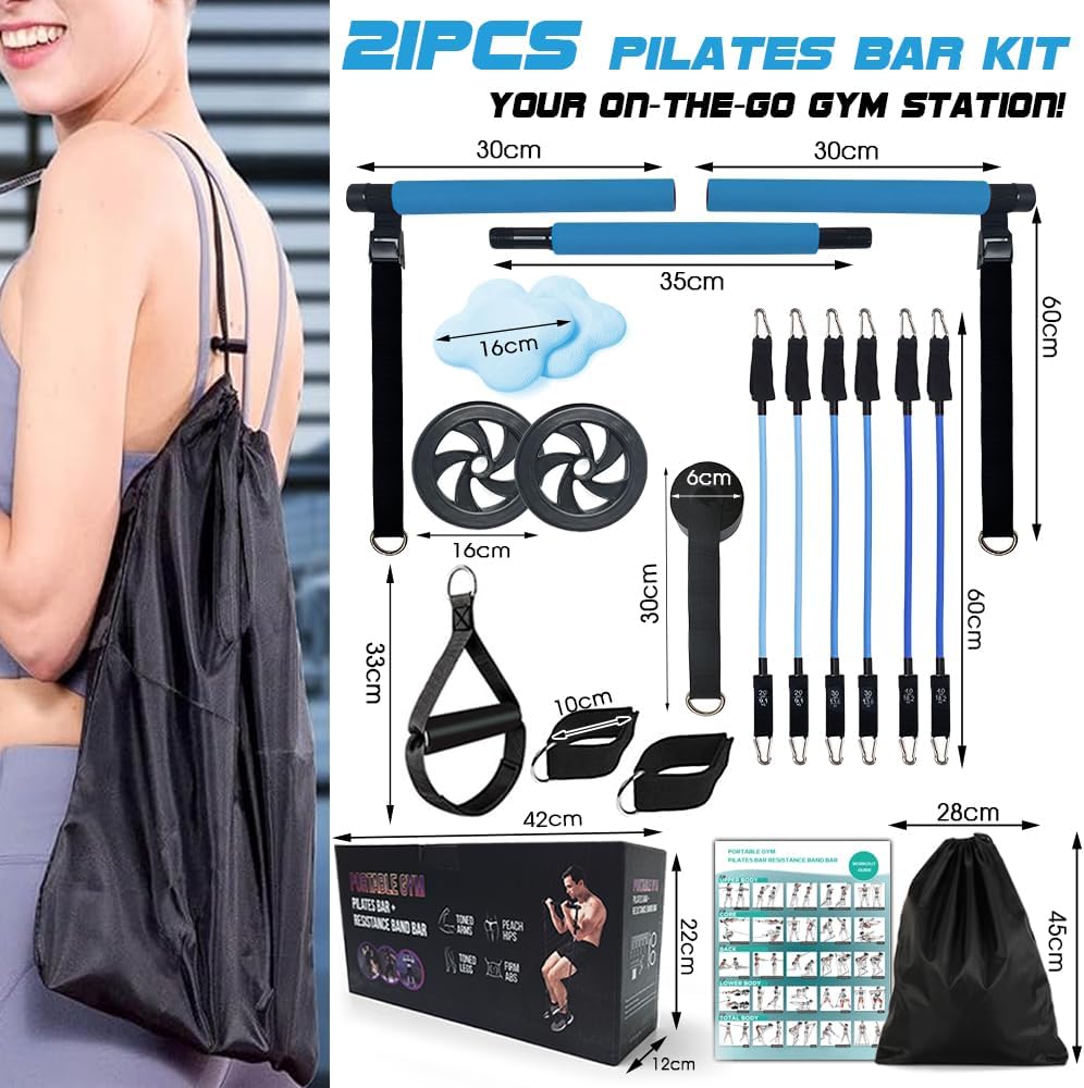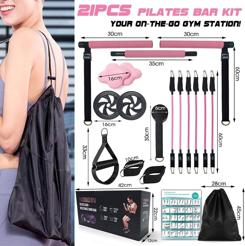 [COMPLETE PILATES SET For Home Gym] The Home Gym Pilates Bar kit includes 3 steel bar sections, 2 ab rollers, 6 resistance bands (20/30/40lbs), 1 door anchor, 2 handles, 2 foot straps, 2 small mats, 1 guidebook, 1 storage bag and 1 gift box. This all-in-one Pilates exercise stick system offers a versatile solution for your fitness needs