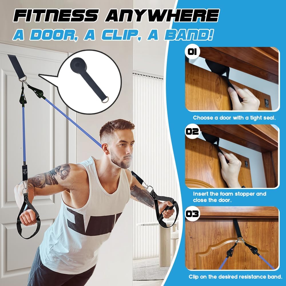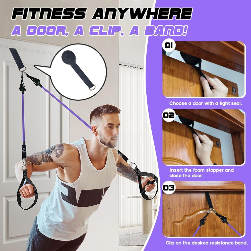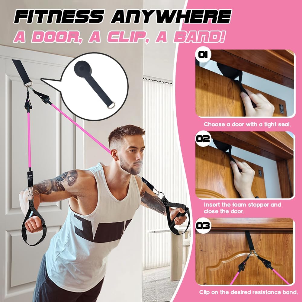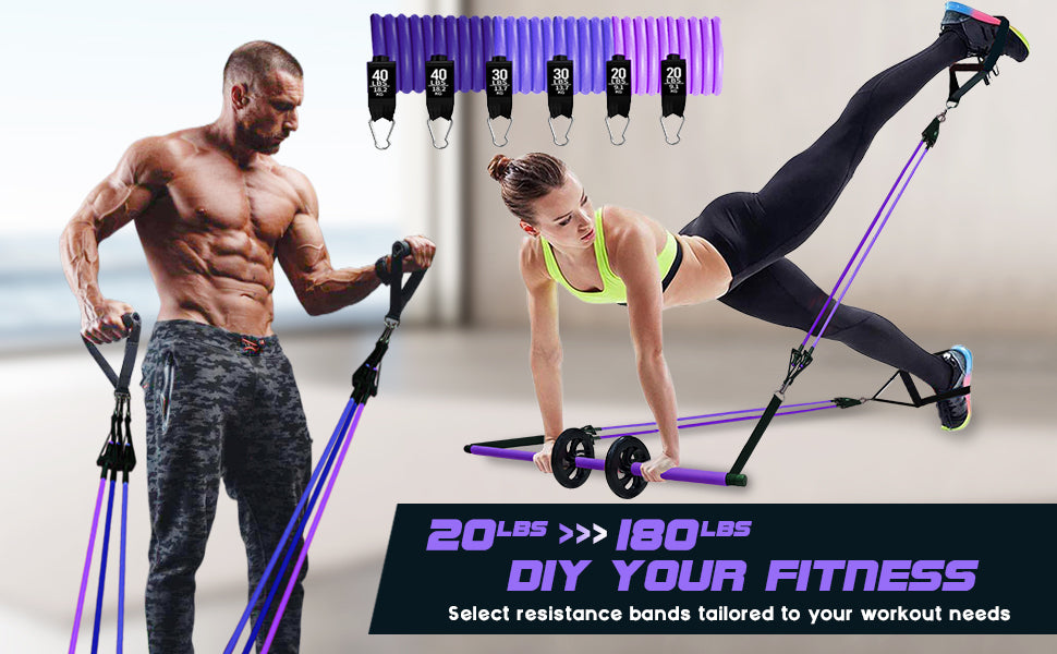 The resistance bands are stackable, providing customizable resistance from 20lbs to 180lbs to meet various training needs, with each band clearly marked for easy reference.