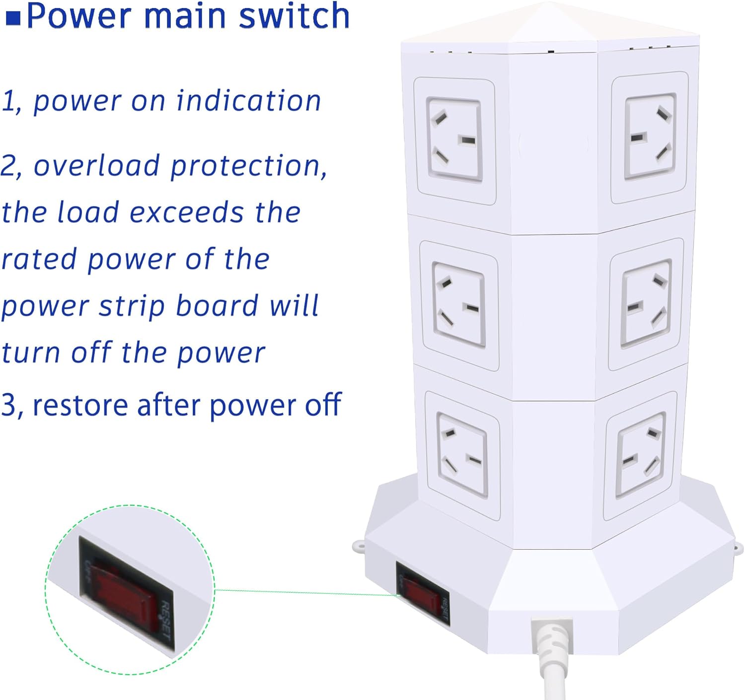 【Product Features】 Power boards produced by Powerjc have overload protection, lightning protection and lightning protection. Power protection under abnormal conditions (e.g. overload, overheating, Over current, overcharging, temperature abnormality, lightning surge) The tower power strip board shuts down automatically. Press the red button below to reuse.