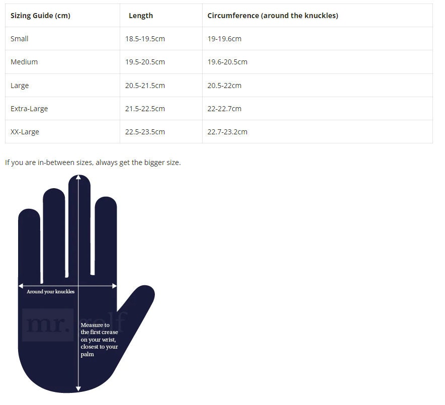 **Ensure that you have selected the correct size and glove hand. Right-handed golfers will wear a left glove, while left-handed golfers will wear a right glove**.