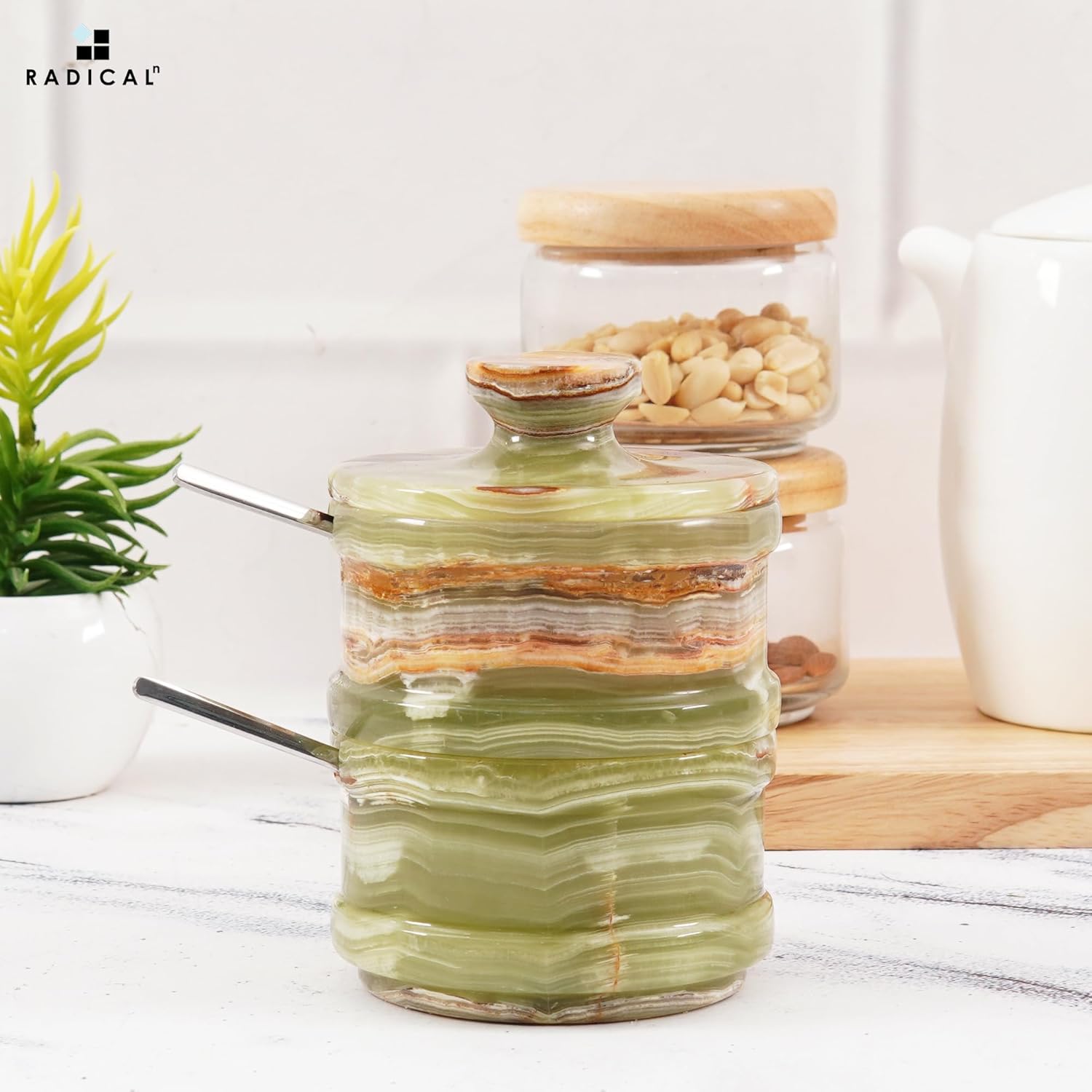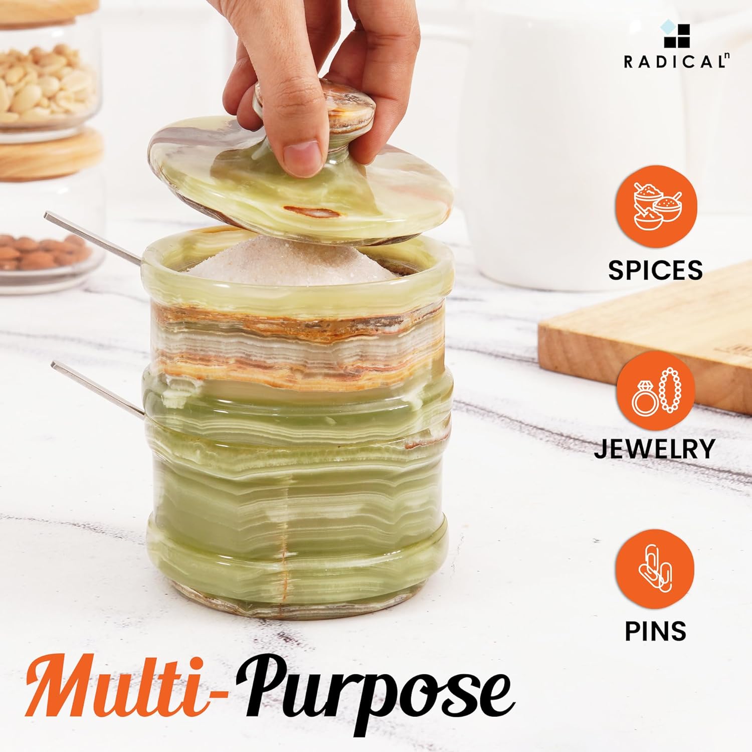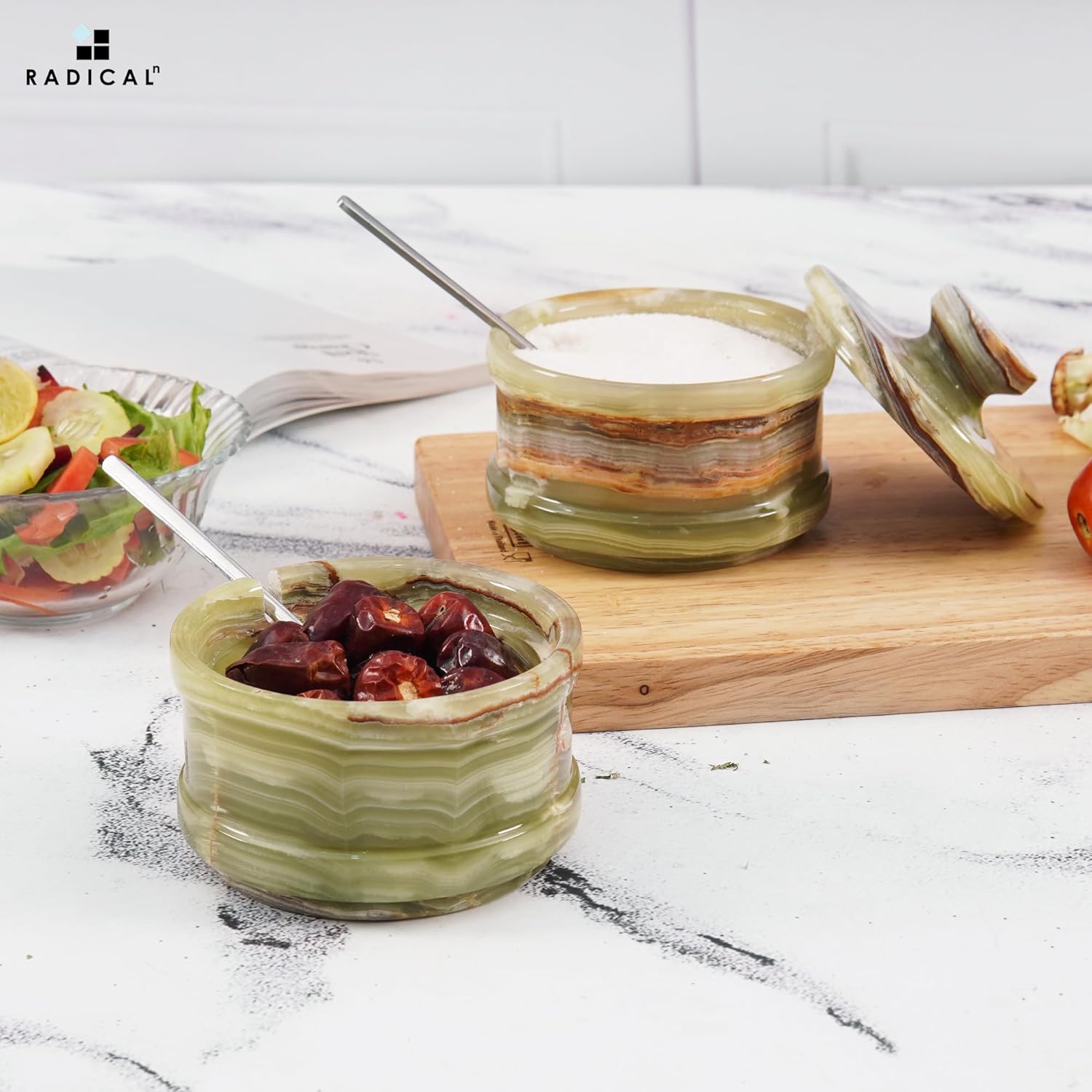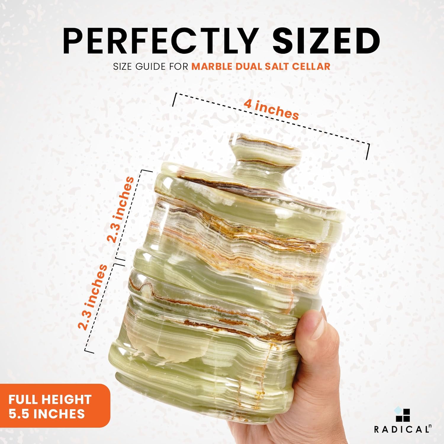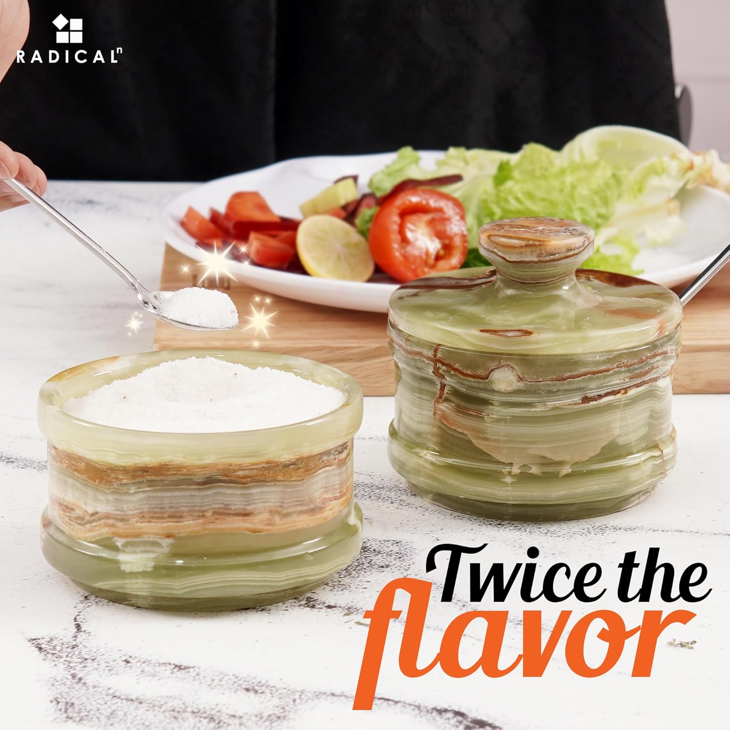 Radicaln Salt & Pepper Bowl – 5.5” Handmade Marble Green Onyx Dual Salt Cellar With Lid – 2.3” Each Brown Sugar Butter Keeper Spice Herbs Container Kitchen Accessories