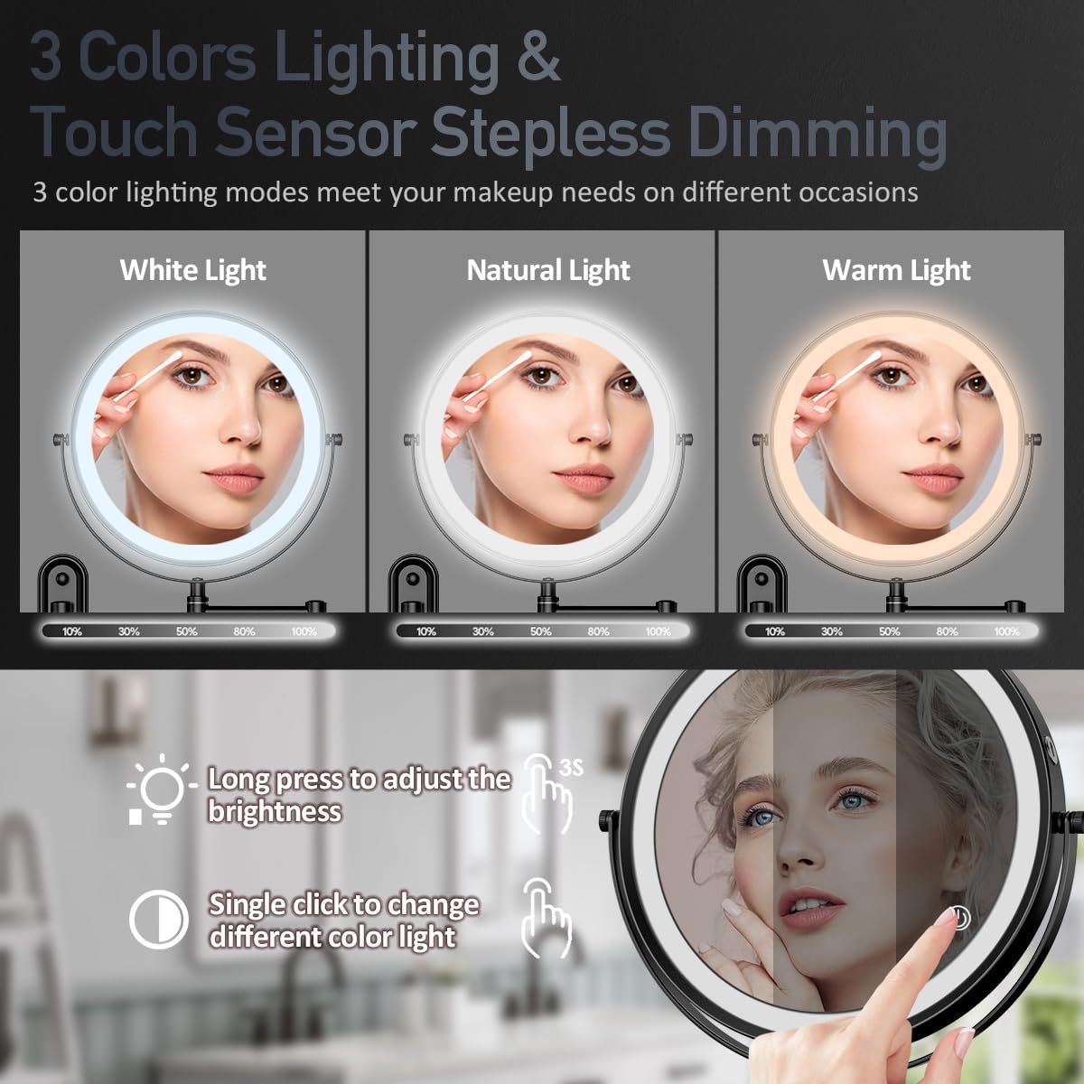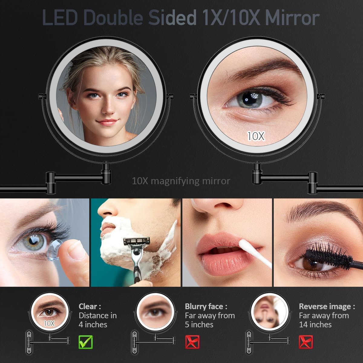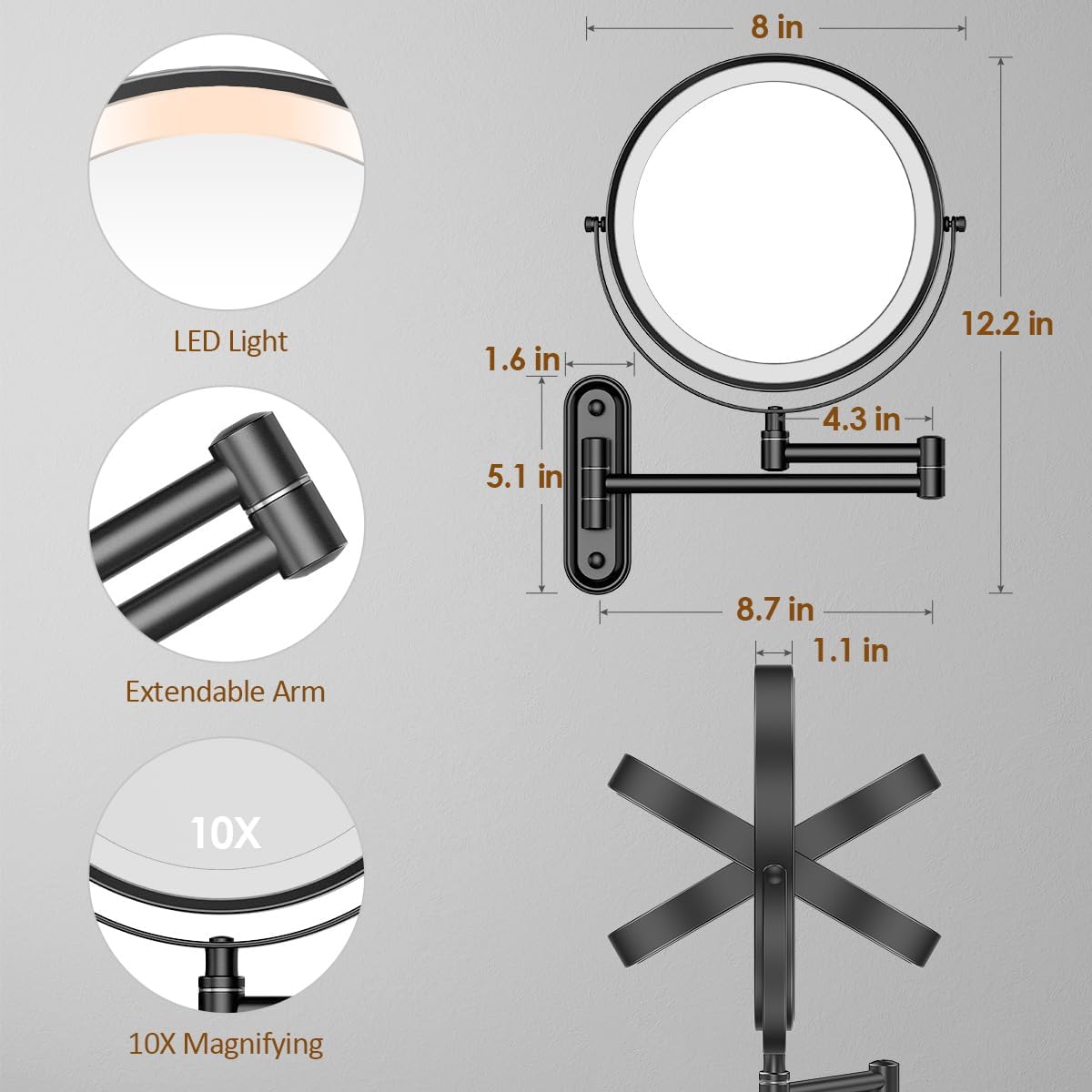 The telescopic wall mount lighted makeup mirror offers a 1x lighted mirror for overall makeup and a 10x magnifying light up mirror for close-up details.