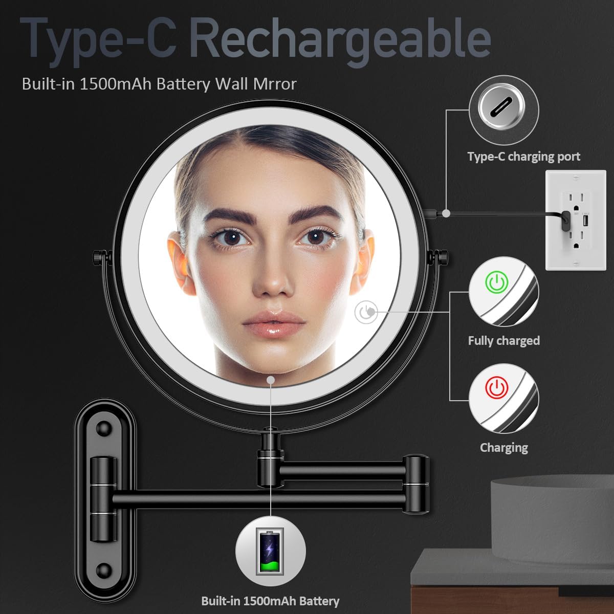 【Type-C Rechargeable & Convenient to Use】Rocollos magnifying mirror with light has built-in 2000 mAh rechargeable Lithium battery with a type-C cable included (charger is not included). No need to replace batteries! No internally installed cords in your walls! So you can conveniently install your mirror on every corner at home!