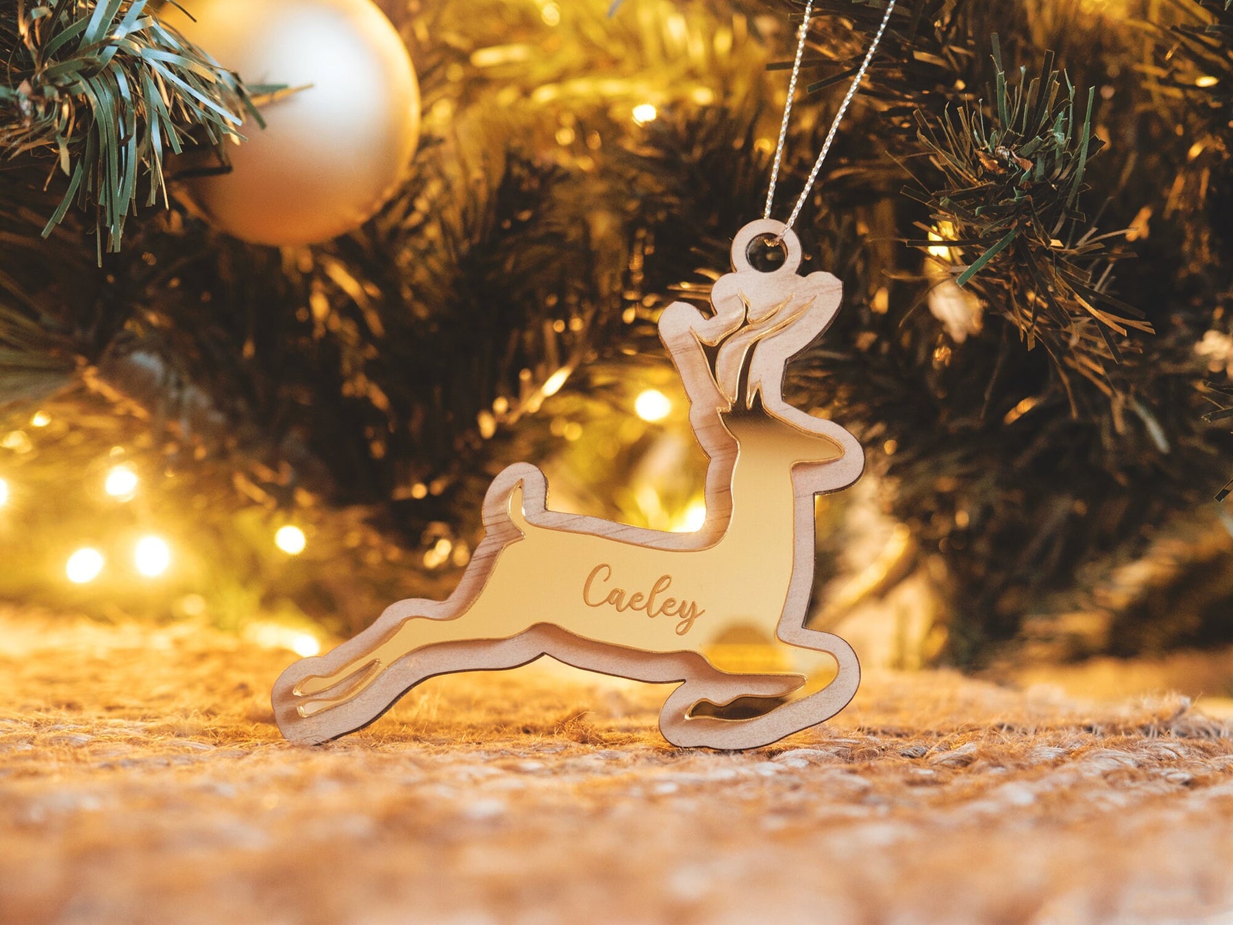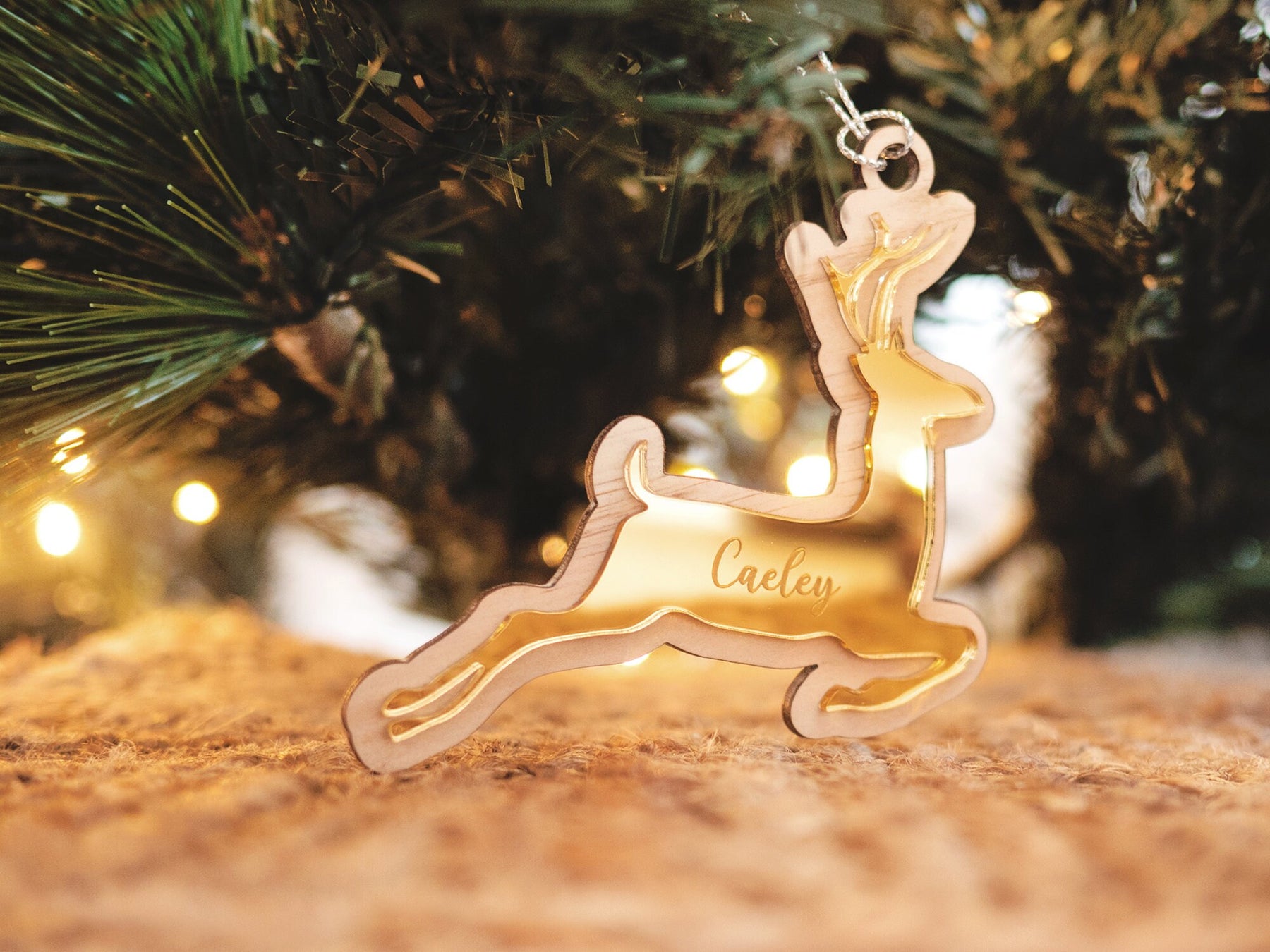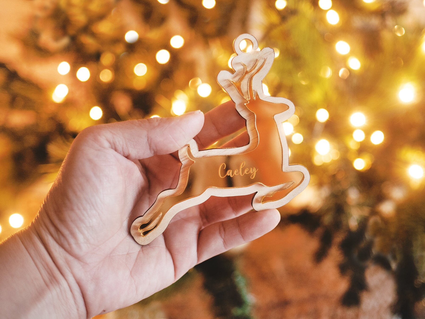This custom reindeer ornament makes for an ideal decoration for your Christmas tree! Crafted with a wooden base and topped with mirror acrylic