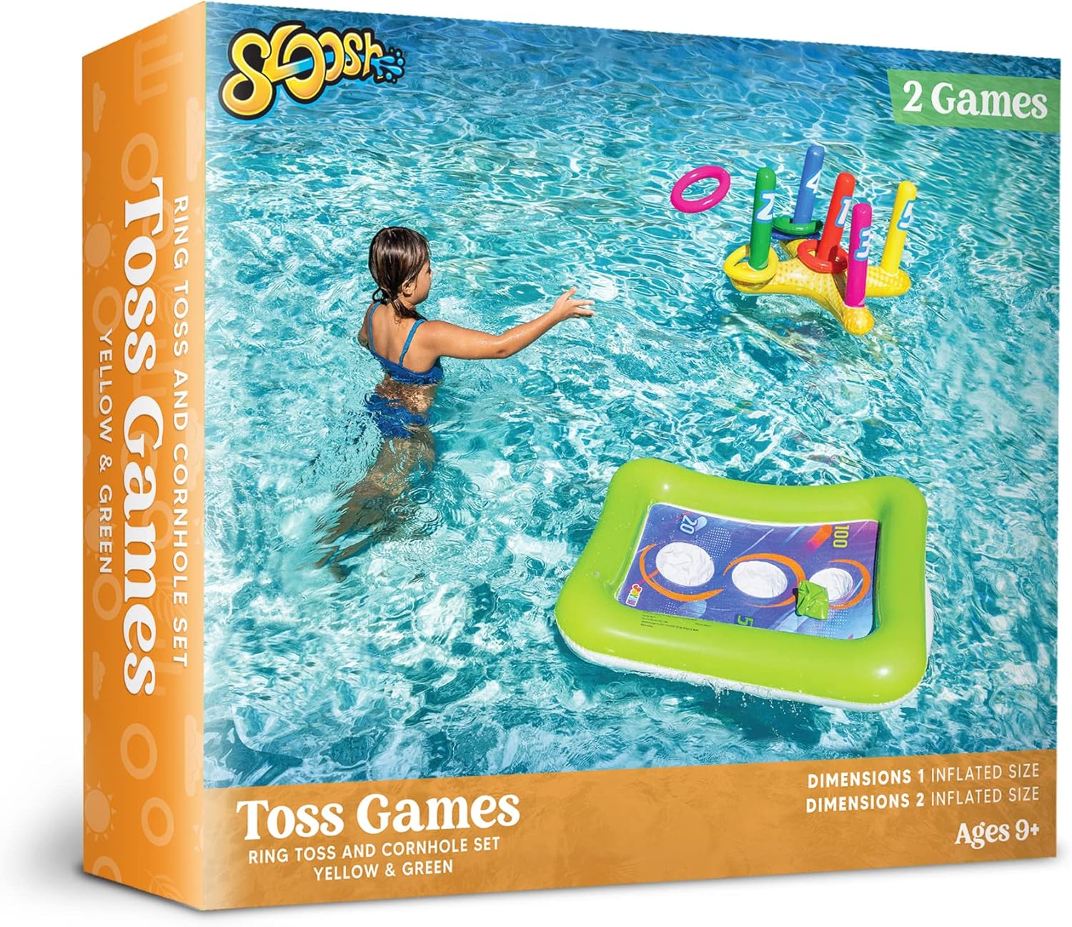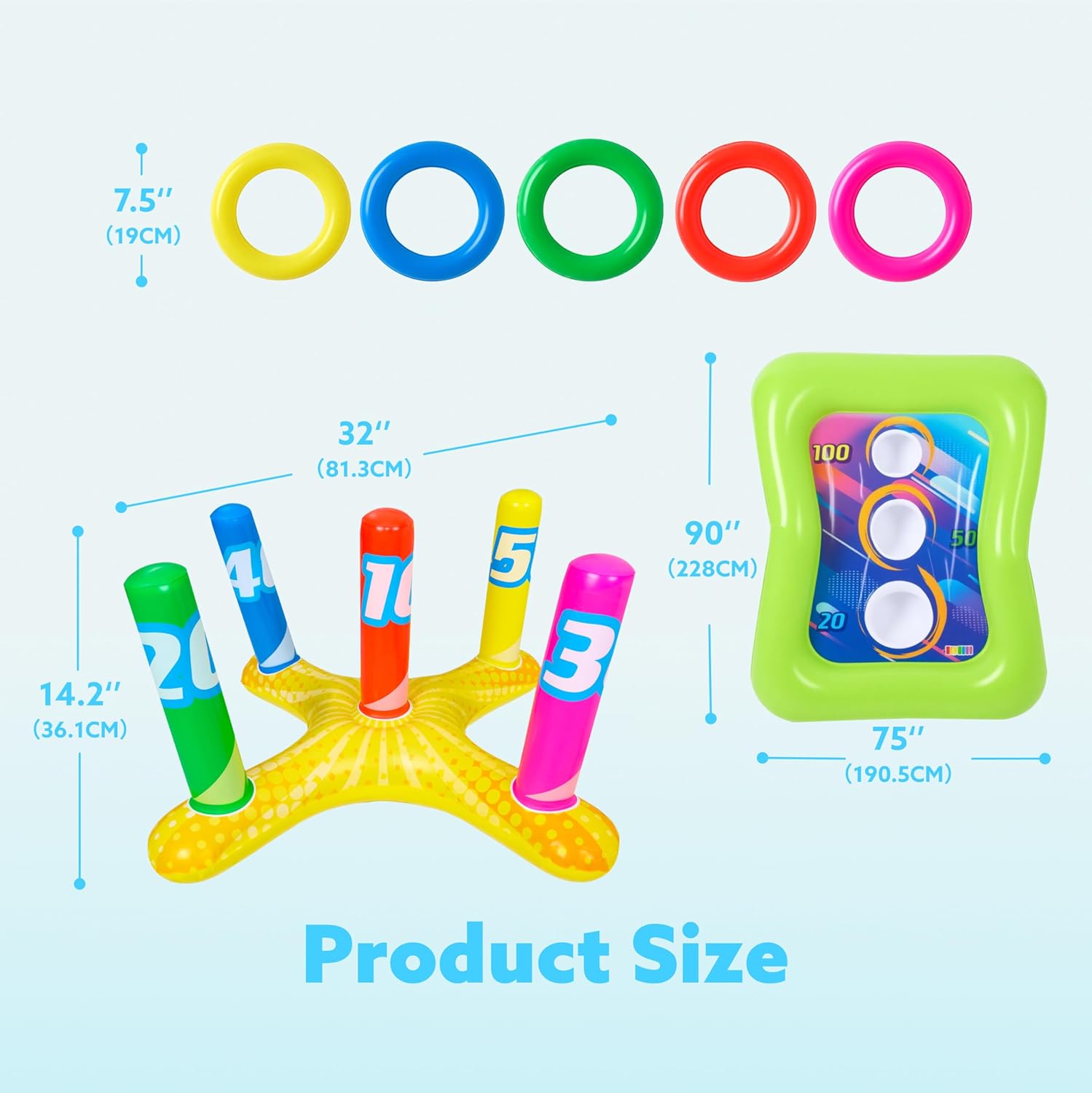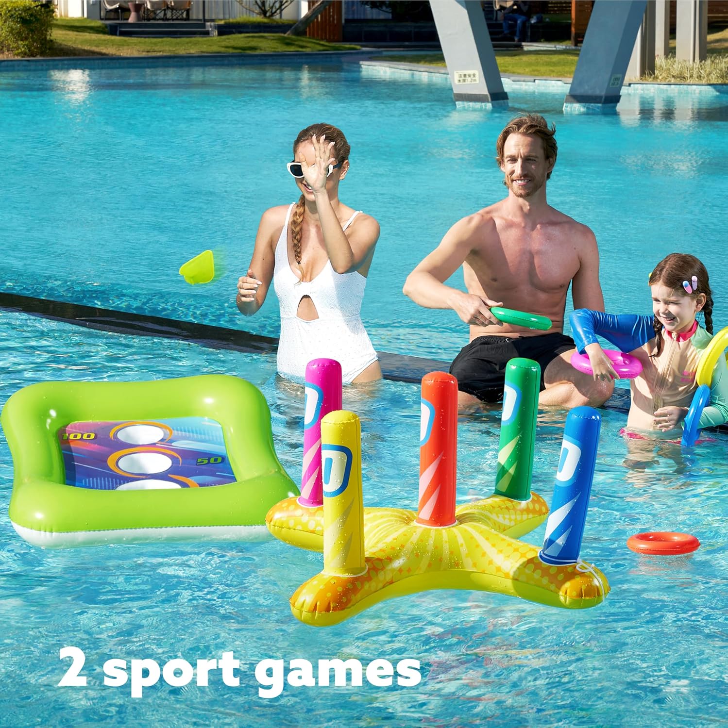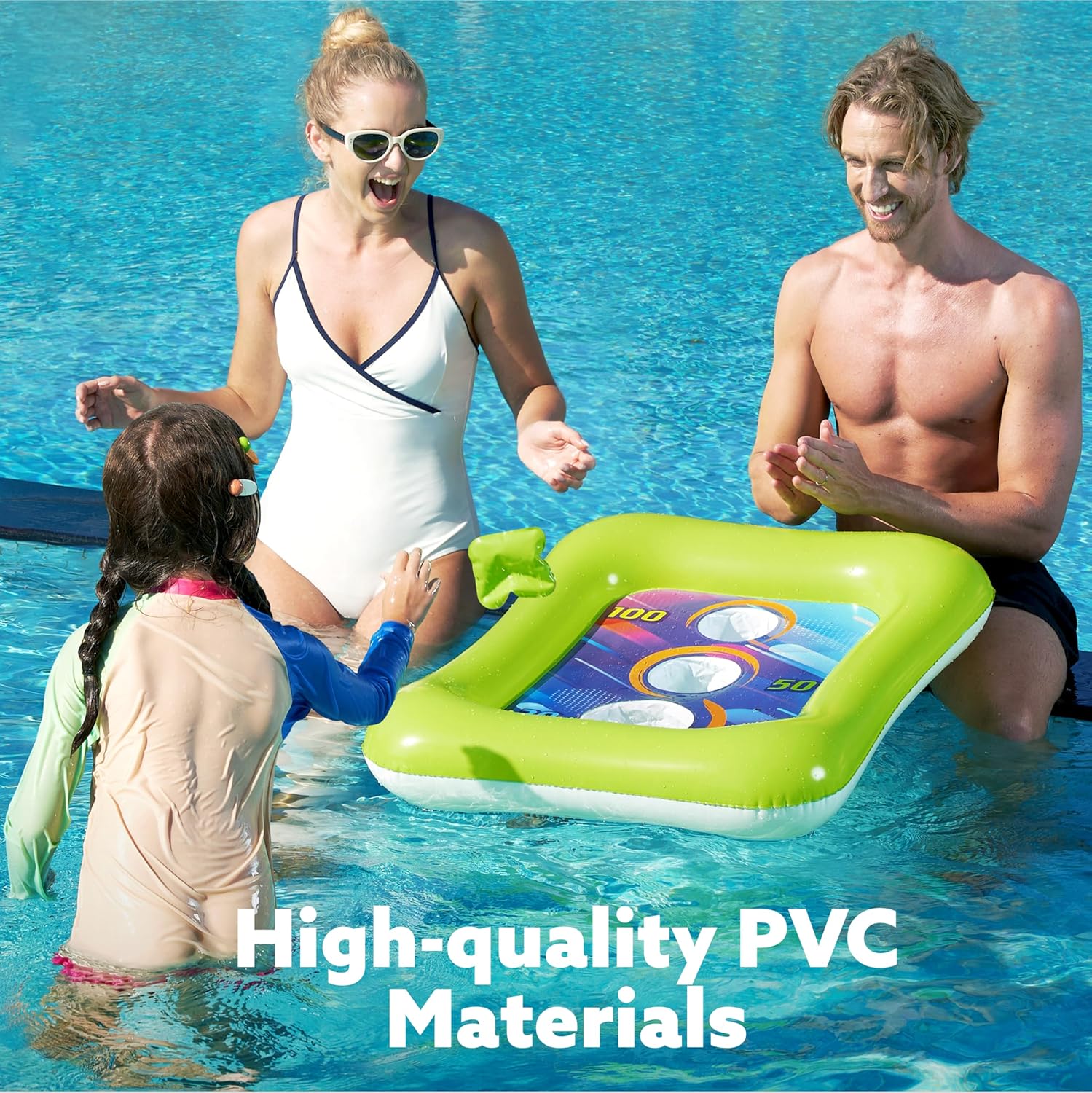 UNIQUE DESIGN. Our Pool Cornhole Game includes 2 Sets of Inflatable Swimming Pool Toss Game includes 1 Set of Ring Toss & 1 Set of Corn-Toss Game and 1 Air Pump