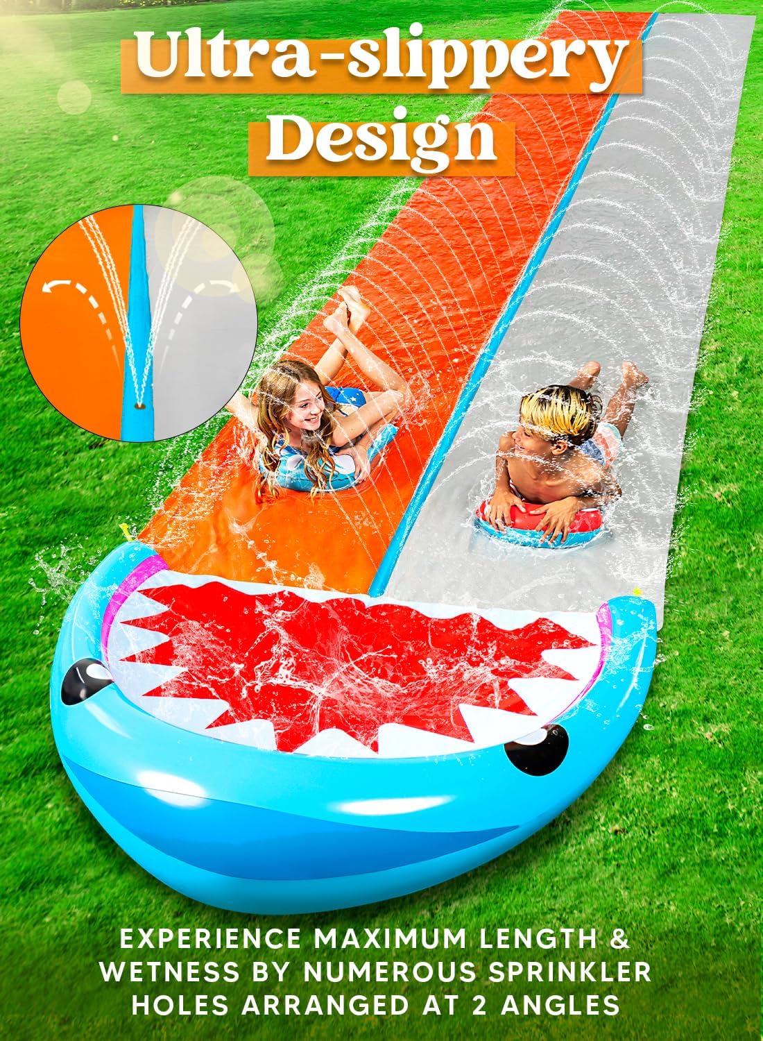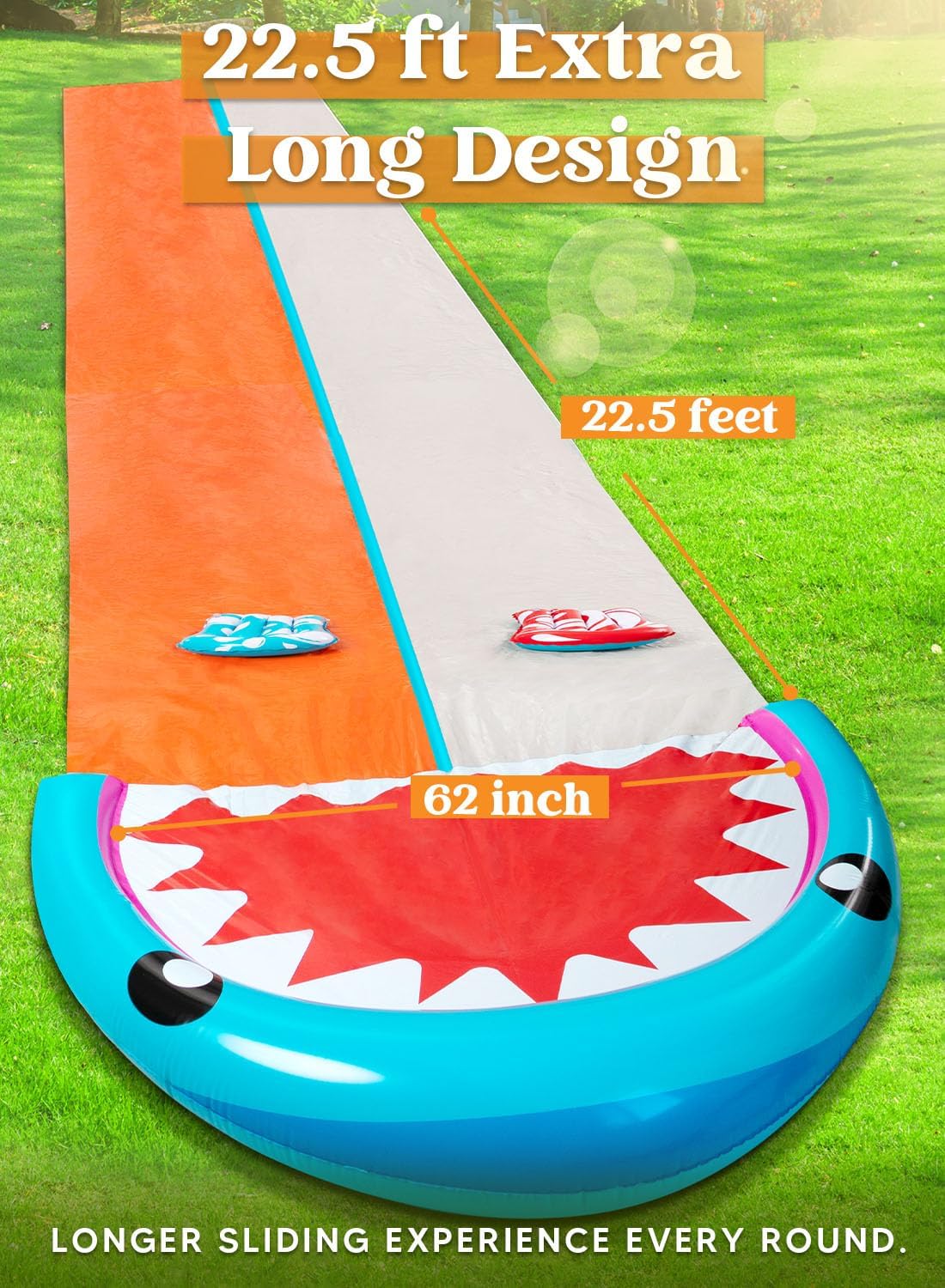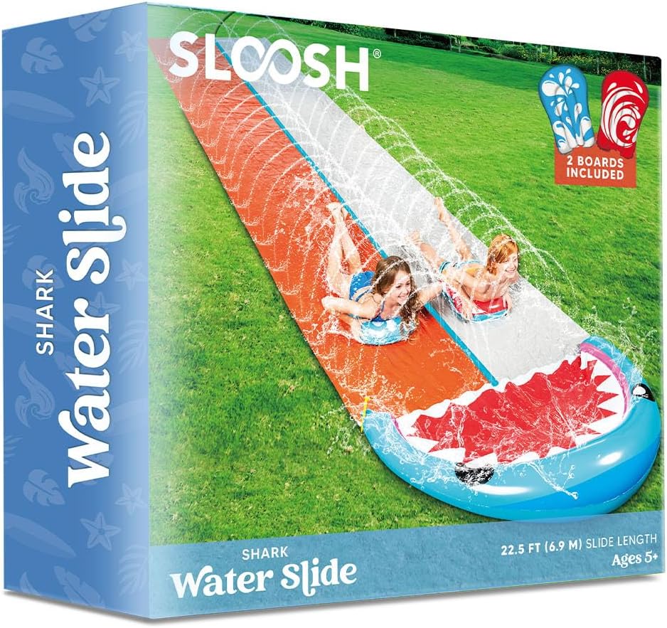 SLOOSH Water Slides with 2 Inflatable Boards,22.5ft Double Lane Lawn Water Splash Slip with Advanced Sprinklers Summer Toy for Kids Adults Fun Backyard Summer Outdoor, Shark