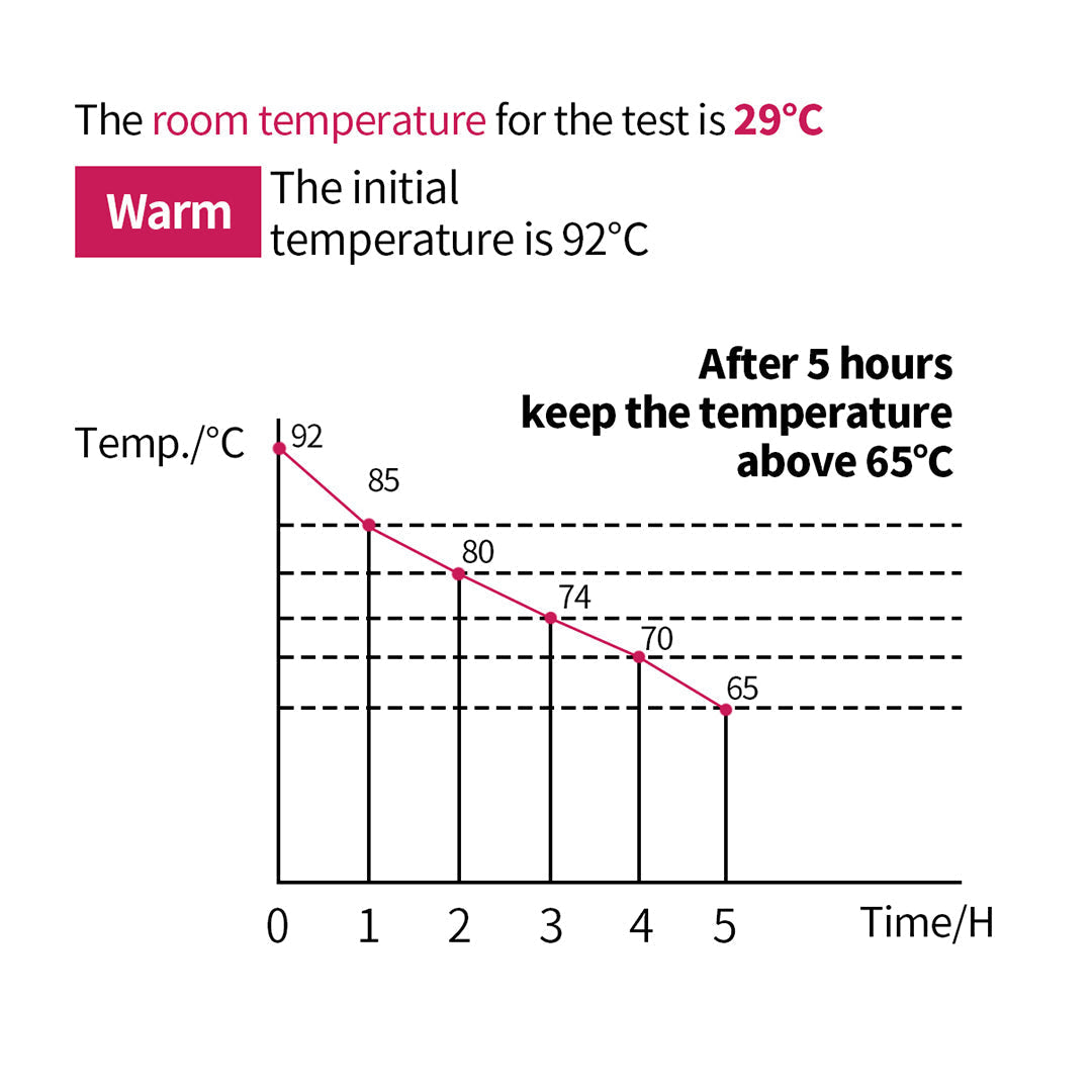 The insulated temperature for 12 hours is 93C which will slowly decrease to 35C, especially in high-temperature degrees that only last for a few hours. Using indoors is highly recommended. The insulator cannot keep the liquid at a stable temperature. Its role is only to slow down the rate of temperature drop.Β This product isn't ideal to be used outdoor as it doesn't sustain the high temperature.
