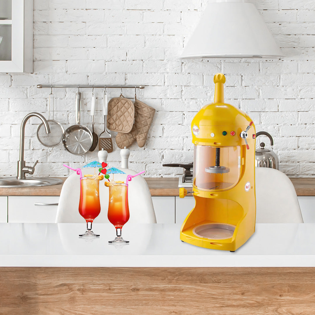 With the thickness adjustment knob, the thickness of shaved ice is adjustable by adjusting the width of the stainless steel blades so that different thicknesses of ice can be produced.