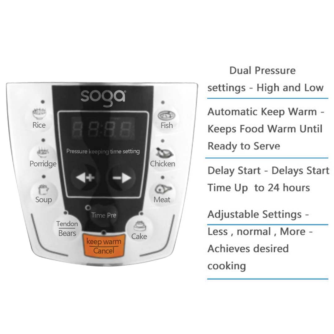 Simple Operation - this pressure cooker features versatile built-in programs, supporting cooking functions for Fish, Chicken/Poultry, Meat/Stew, Rice/Steam, Porridge, Soup, Beans/Multigrain, Cake and Keep Warm. You can set the start time for cooking by simply pressing the button through Manual Cook function.