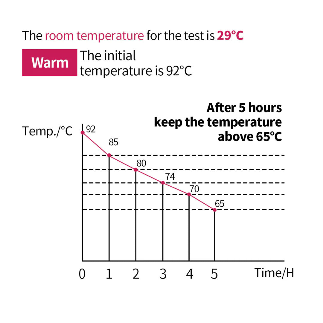 The insulated temperature for 12 hours is 93C which will slowly decrease to 35C, especially in high-temperature degrees that only last for a few hours. Using indoors is highly recommended. The insulator cannot keep the liquid at a stable temperature. Its role is only to slow down the rate of temperature drop. This product isn't ideal to be used outdoor as it doesn't sustain the high temperature.