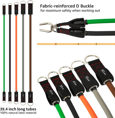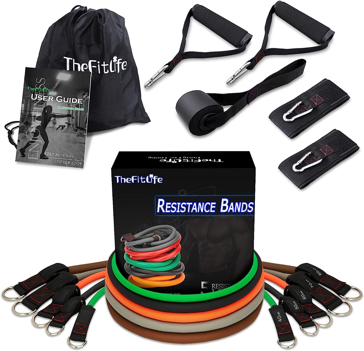 Enhance your workout with the TheFitLife Resistance Bands Set. Five colour-coded bands can be used individually or stacked to reach up to 300 lbs of resistance, so you can progress from warm-ups and rehab to serious strength sessions. Padded ergonomic handles, supportive ankle cuffs, and a door anchor unlock push, pull, hinge, squat, and core movements at home, in the office, or on the go.