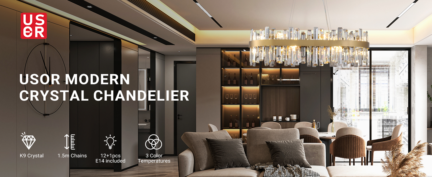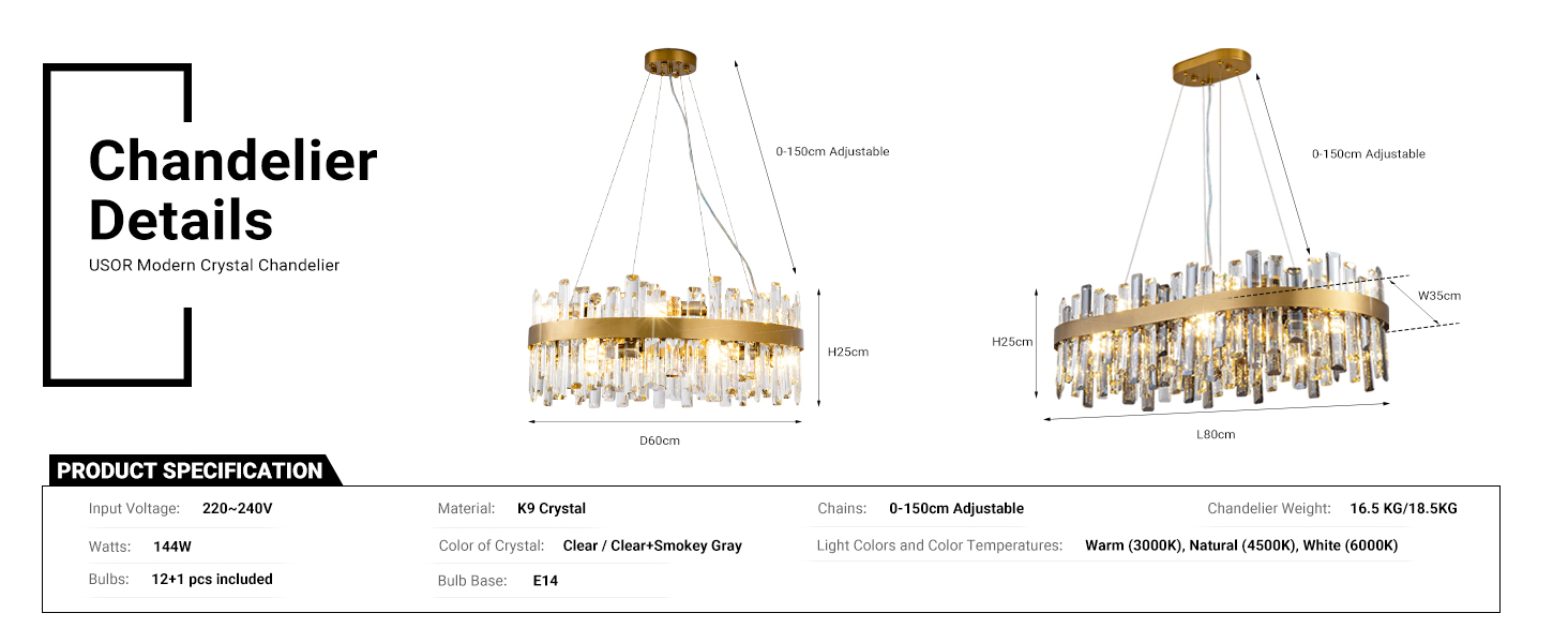 💎【Luxury Gold Brushed Brass Crystal Chandelier】Crafted with wire drawing process, this USOR crystal chandelier offers superior durability and premium quality over electroplated metal. Its luxurious design seamlessly integrates with any décor style, adding an element of elegance and creating a warm, soft light atmosphere. Ideal for dining rooms, living rooms, kitchen islands, bedrooms, hallways, offices, entries, foyers, and staircases.